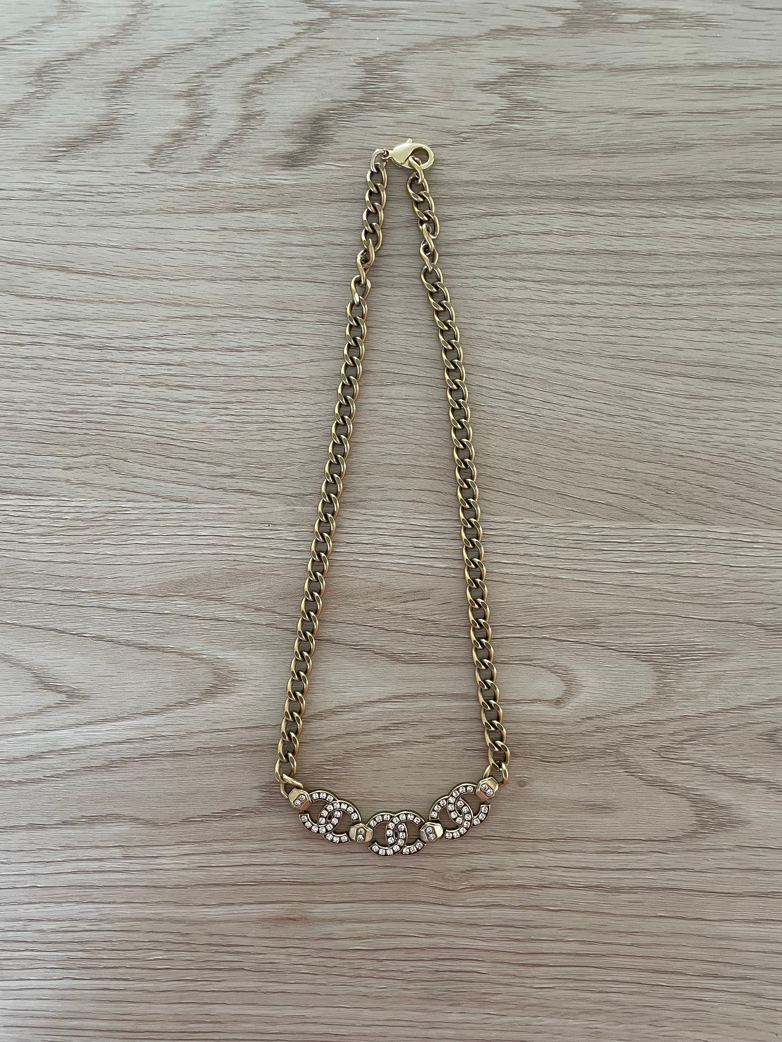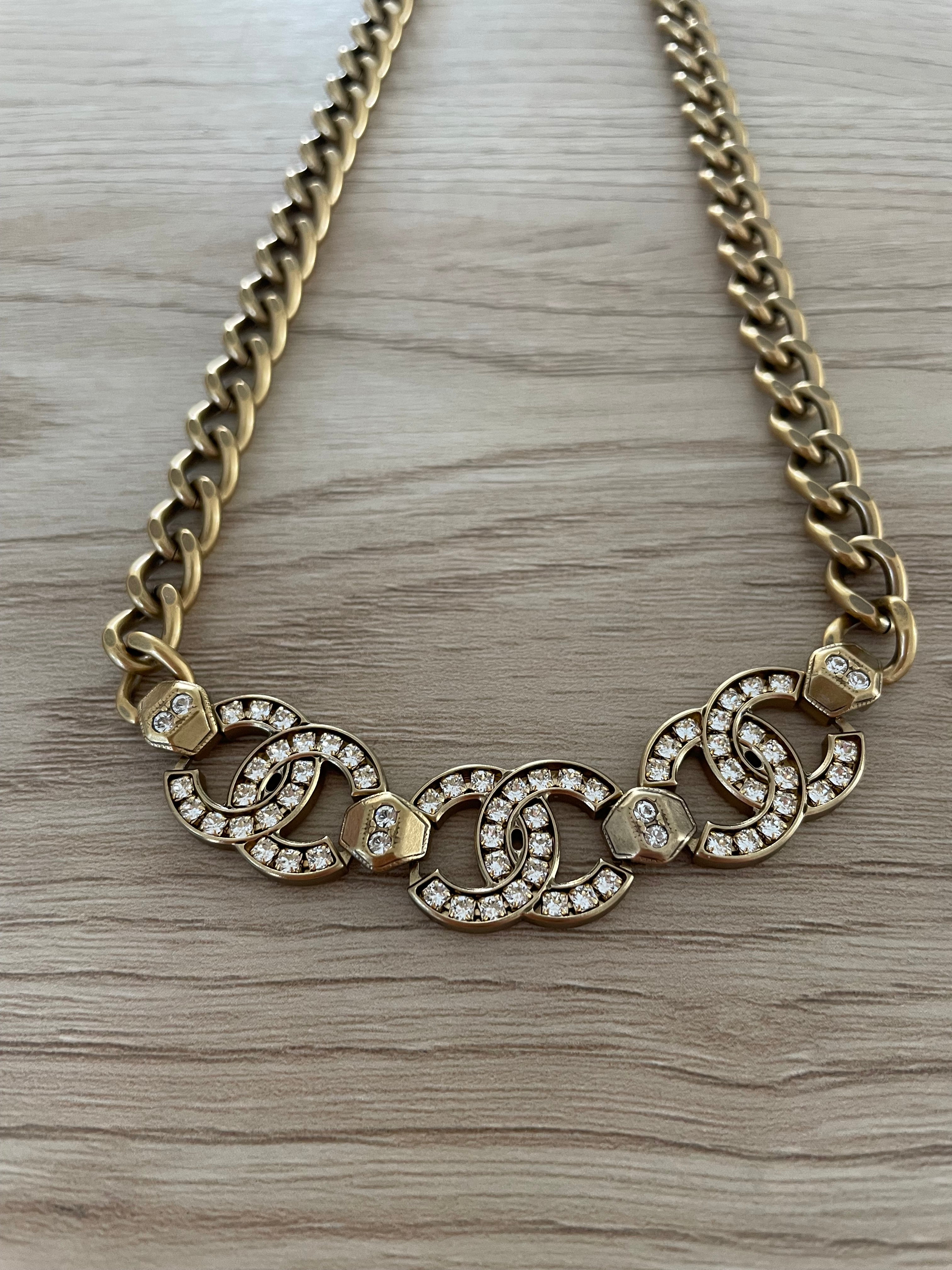 Chanel necklace. Large mesh chain Gold metal. 3 double-sided CC: one rhinestone side and one neutral side. Hallmark present. Sold in a neutral box. Very good general condition. Worn length 25cm