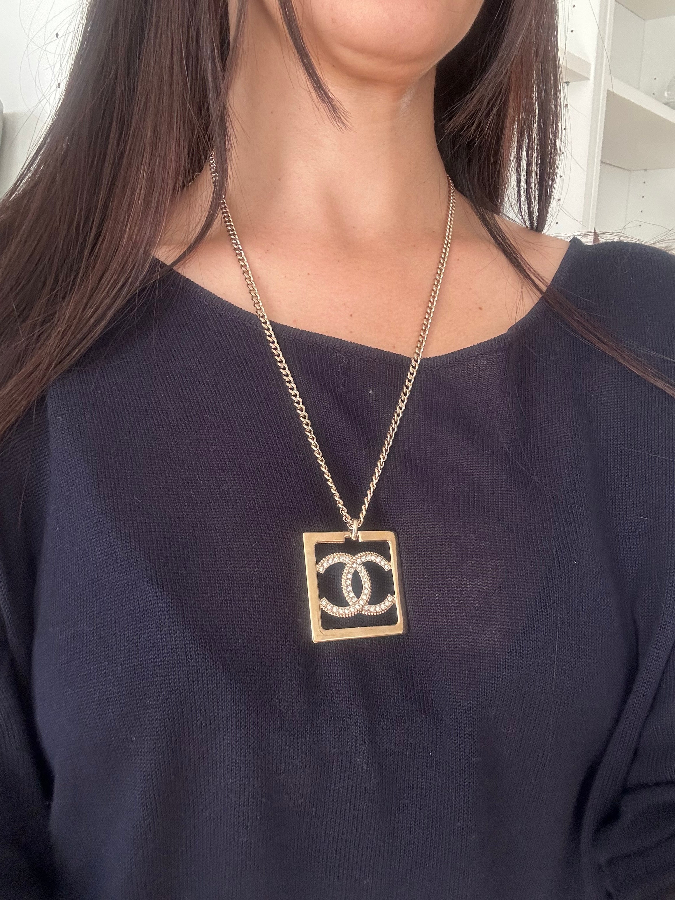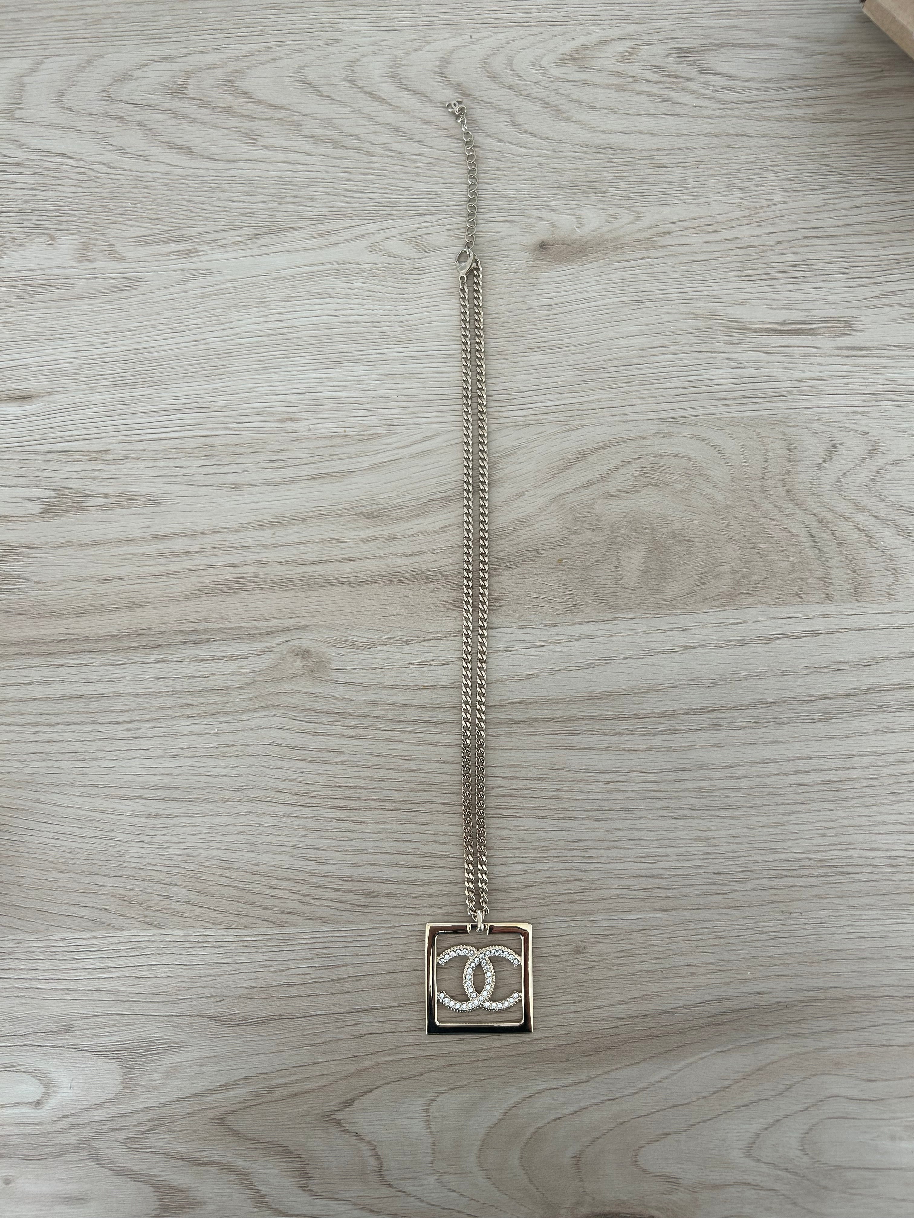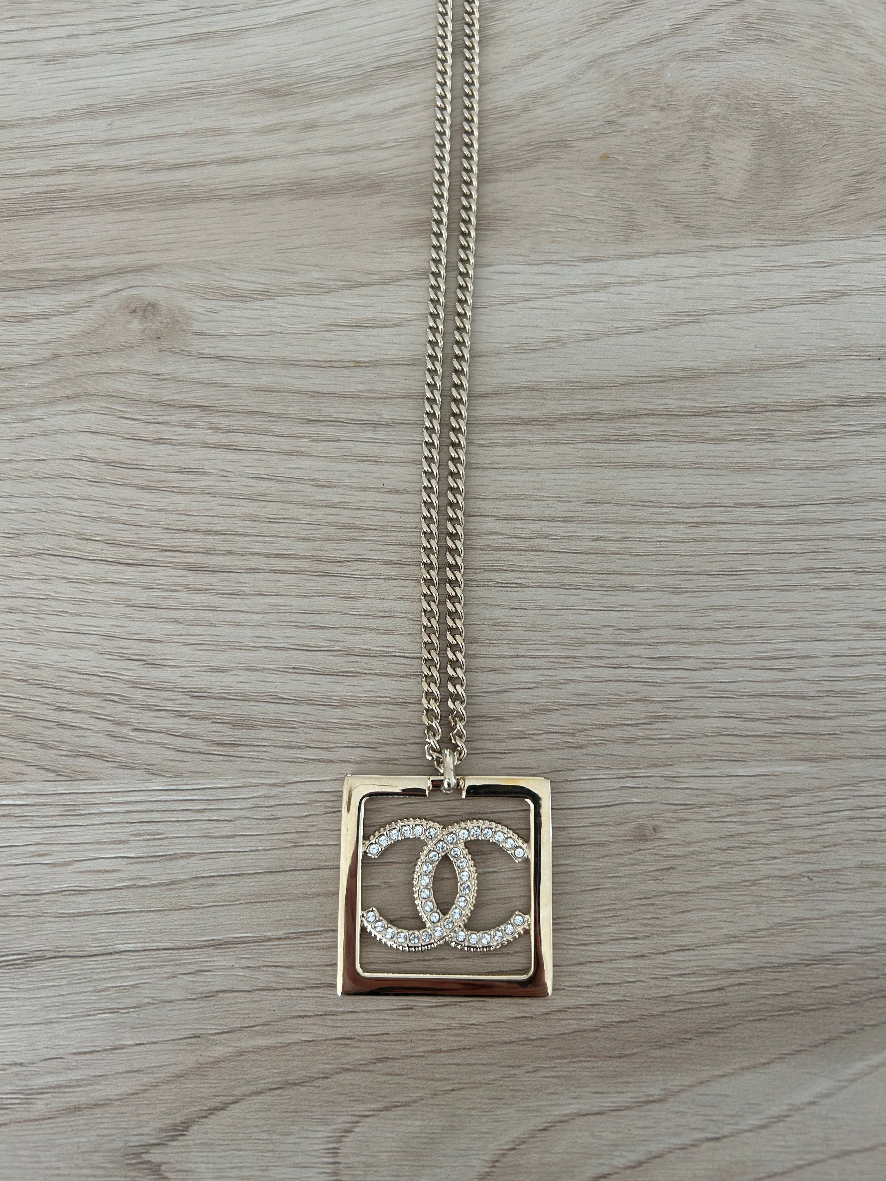 Very beautiful long Chanel necklace in champagne gold metal Double-sided square pendant: one side with rhinestone Cc and one side simple Cc on a gold background. Hallmark present on the clasp. It measures 29 cm, adjustable up to 36 cm.. Sold in a neutral box. Excellent condition