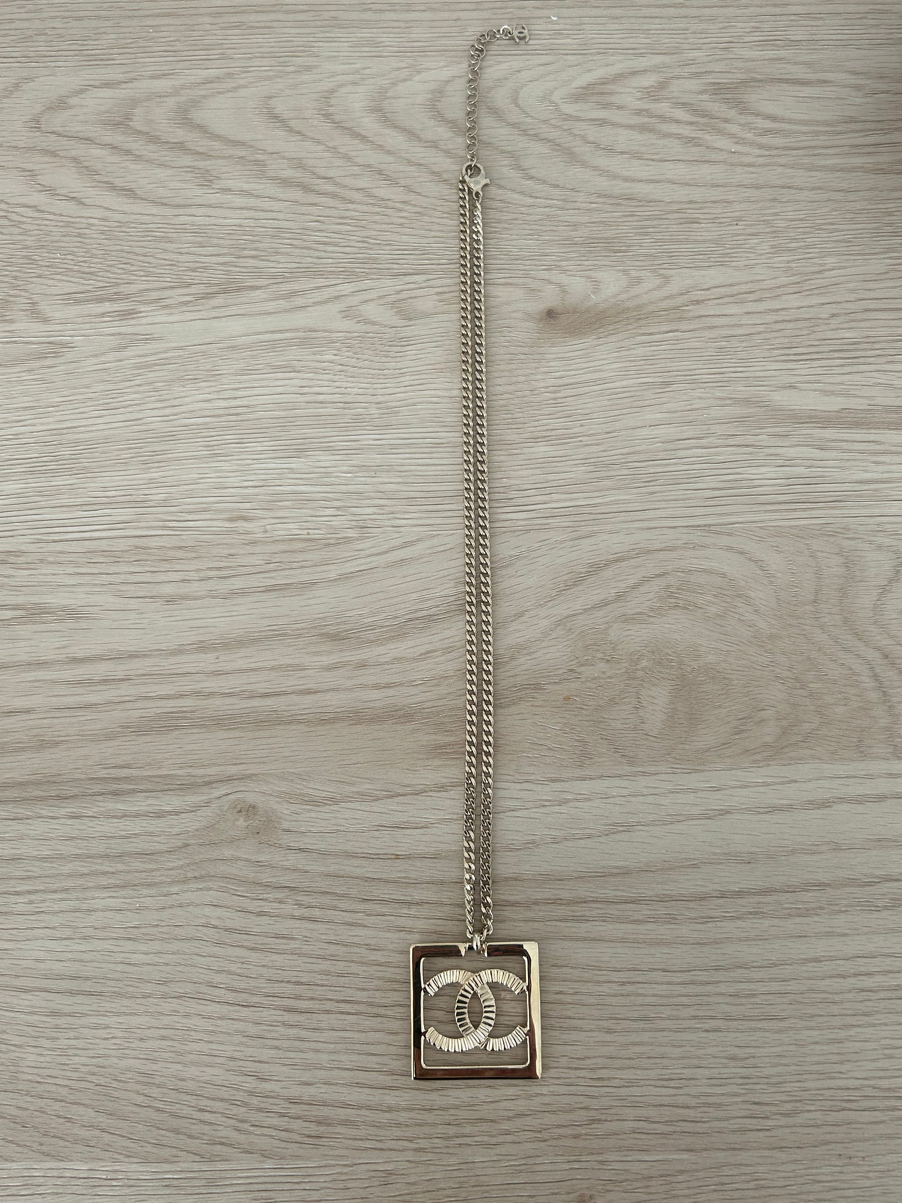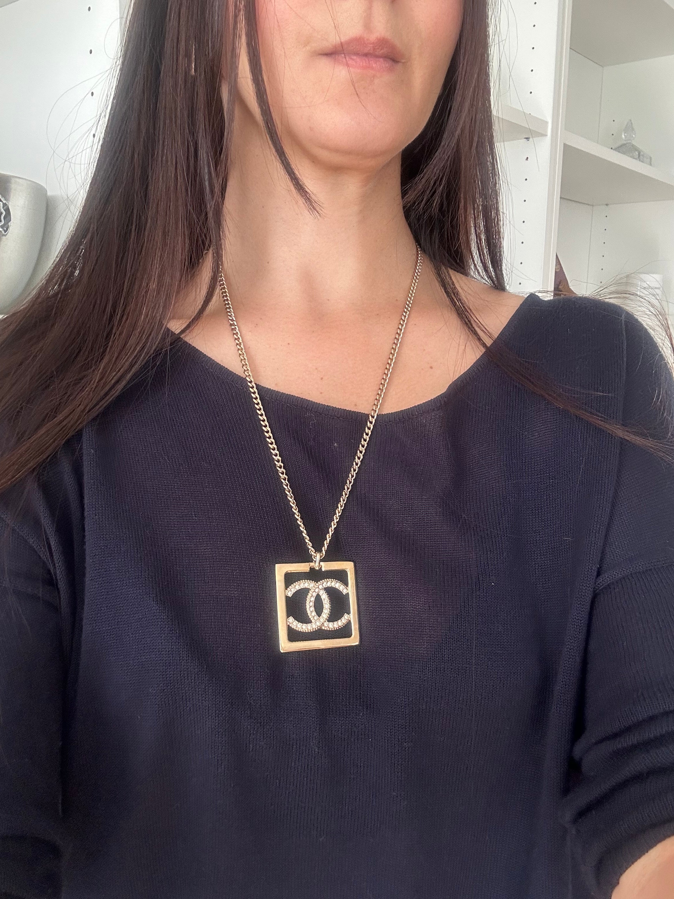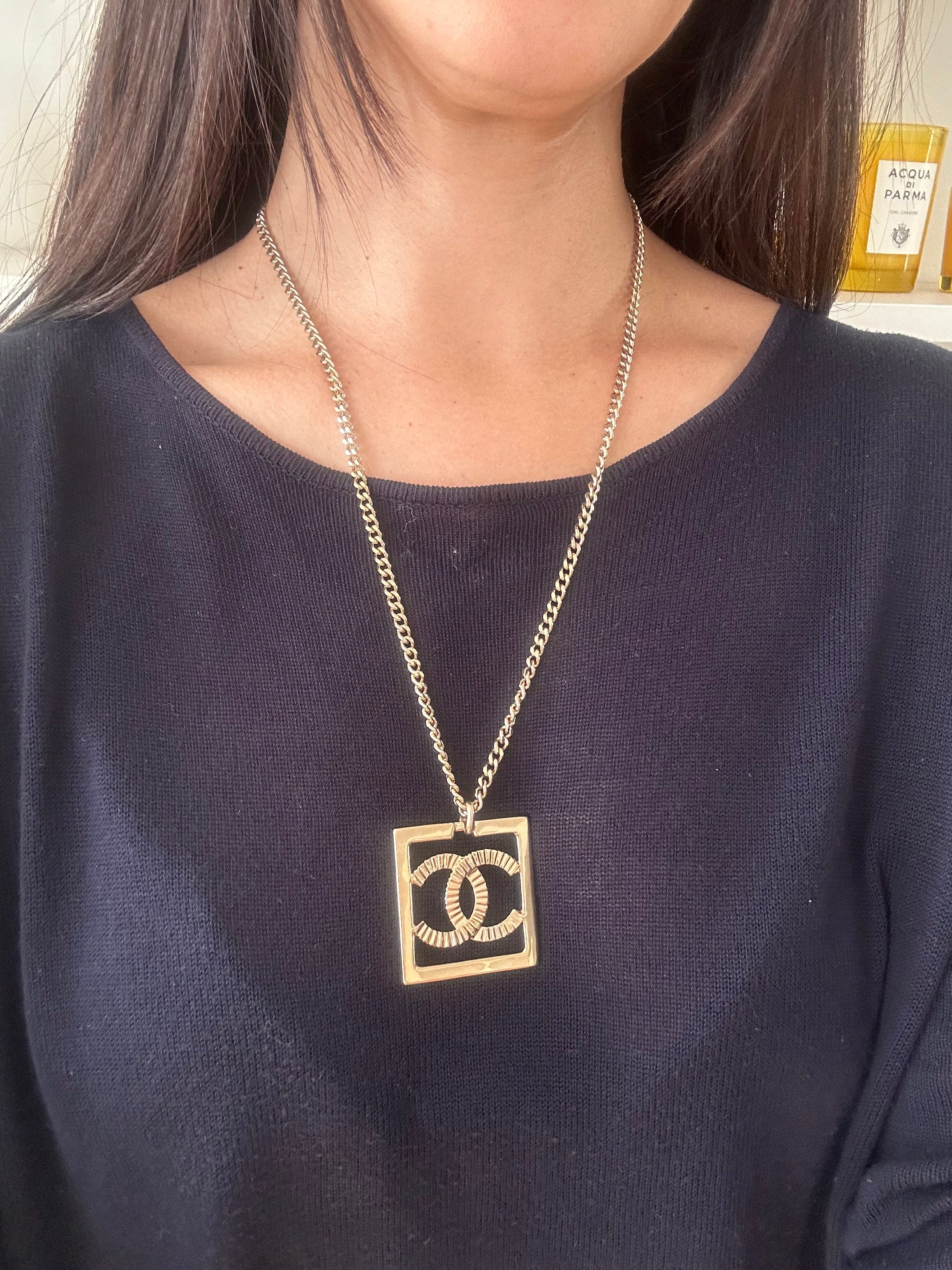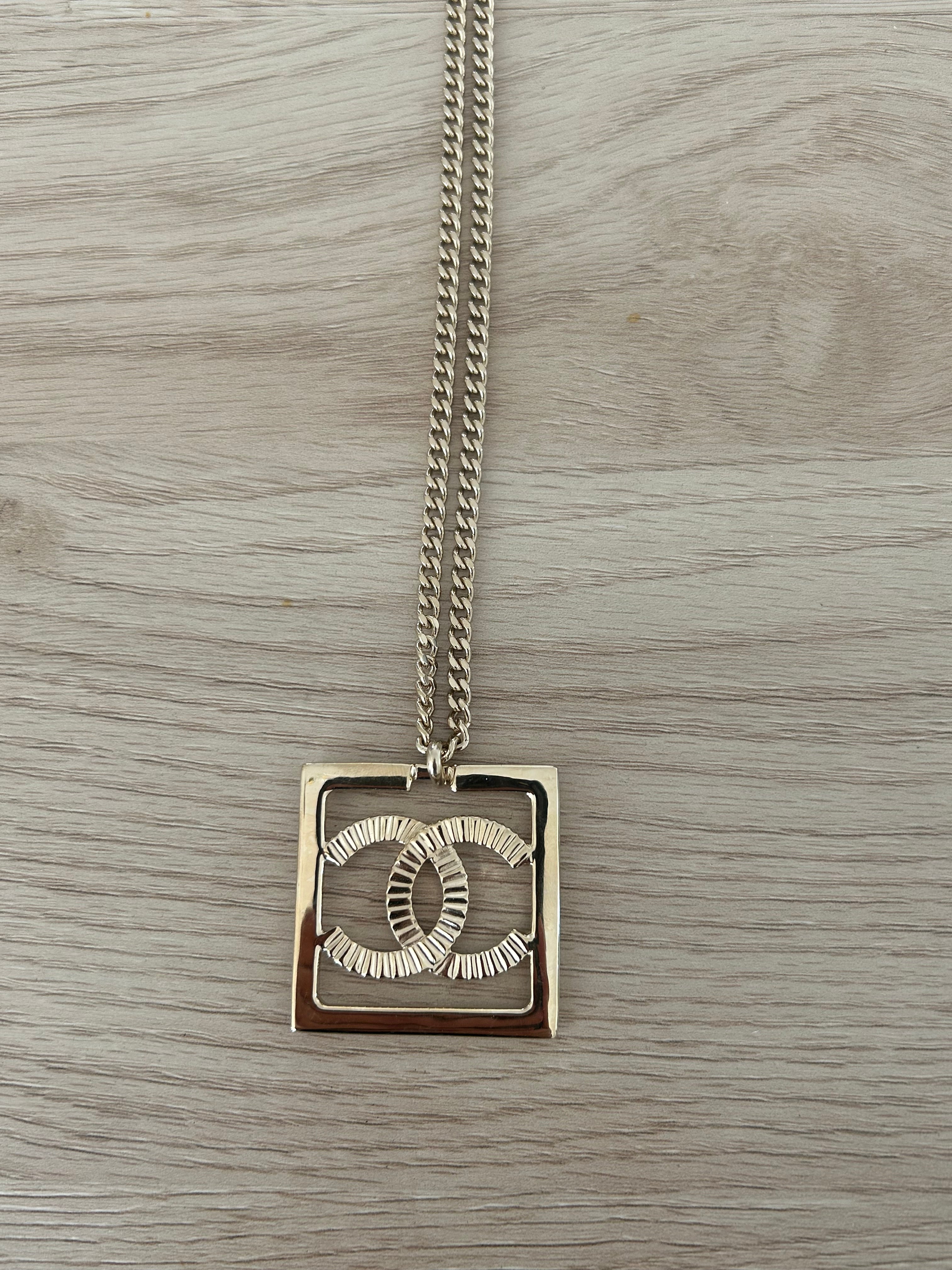 Very beautiful long Chanel necklace in champagne gold metal Double-sided square pendant: one side with rhinestone Cc and one side simple Cc on a gold background. Hallmark present on the clasp. It measures 29 cm, adjustable up to 36 cm.. Sold in a neutral box. Excellent condition