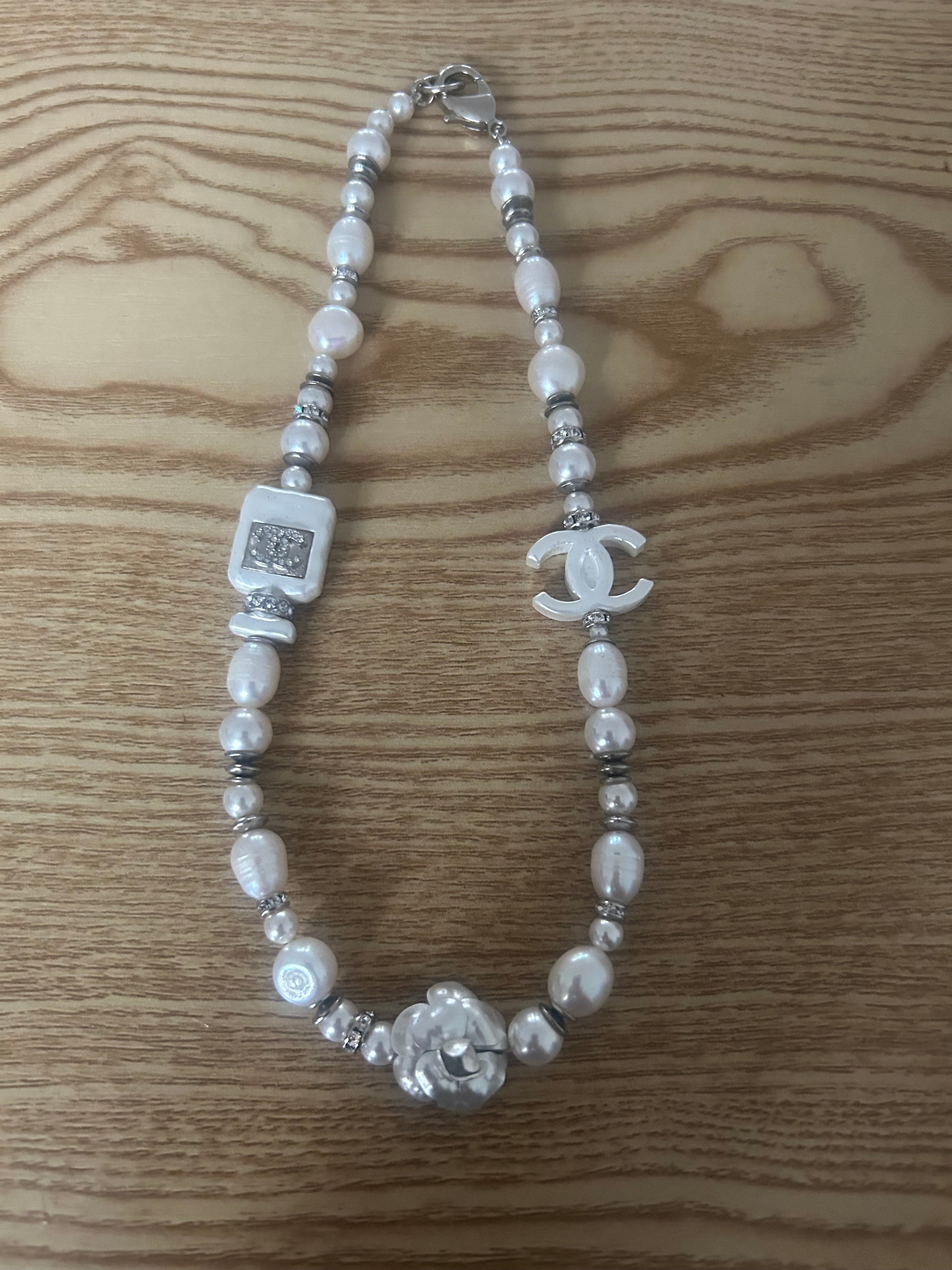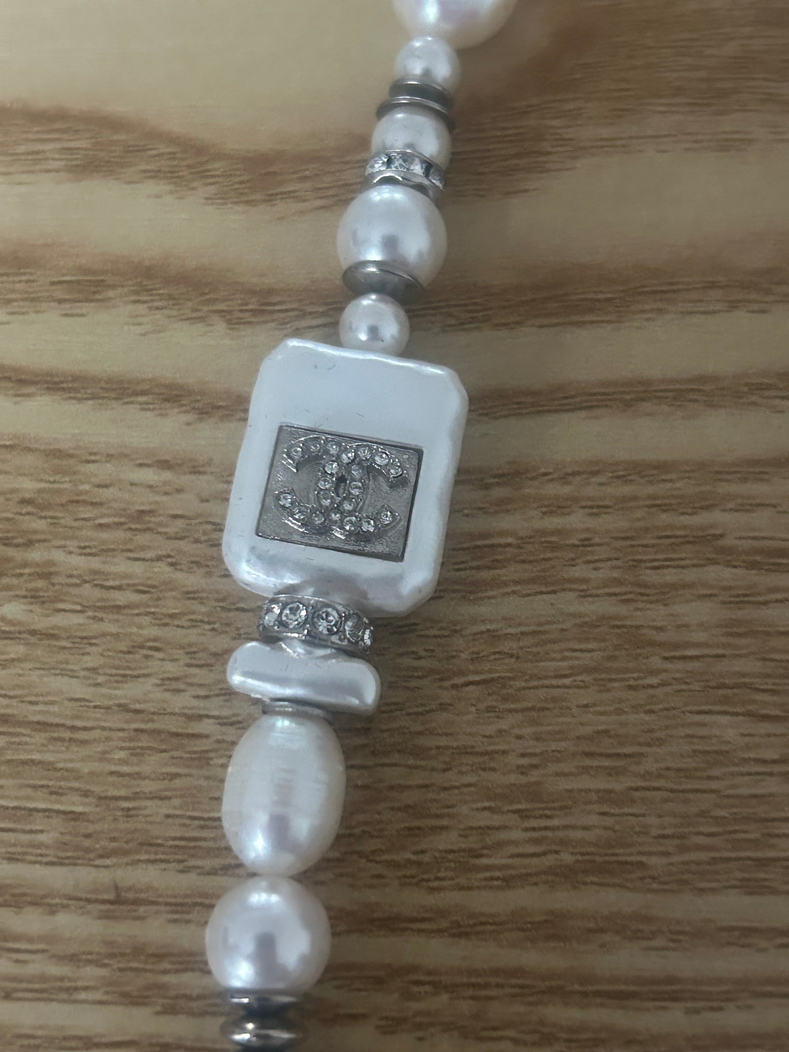 Very beautiful long Chanel necklace in champagne gold metal Double-sided square pendant: one side with rhinestone Cc and one side simple Cc on a gold background. Hallmark present on the clasp. It measures 29 cm, adjustable up to 36 cm.. Sold in a neutral box. Excellent condition