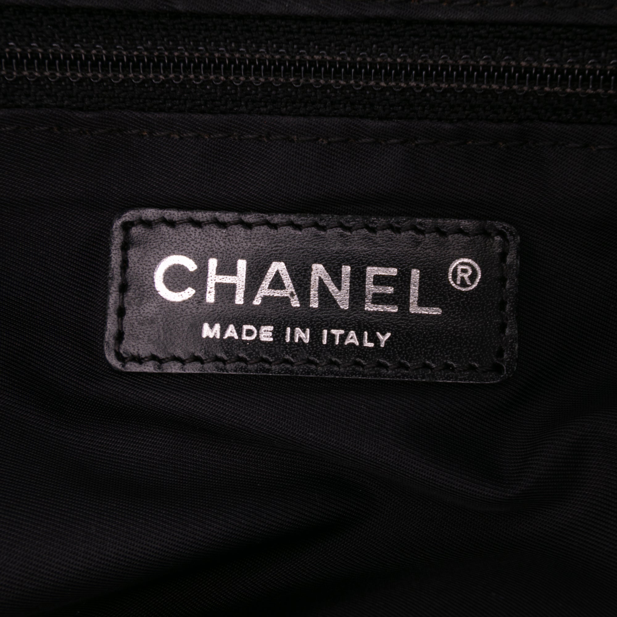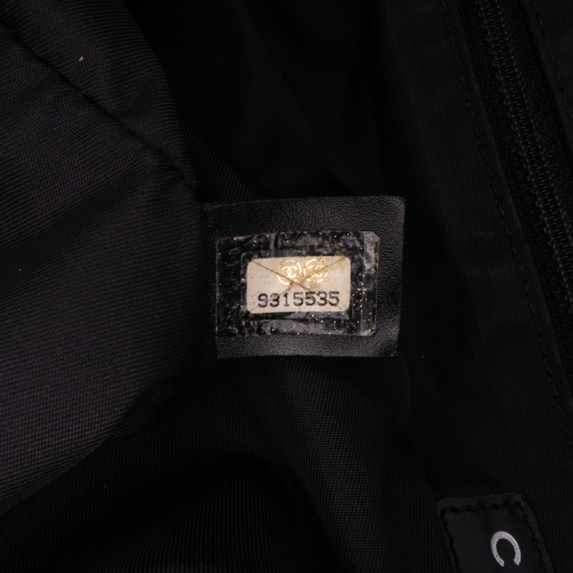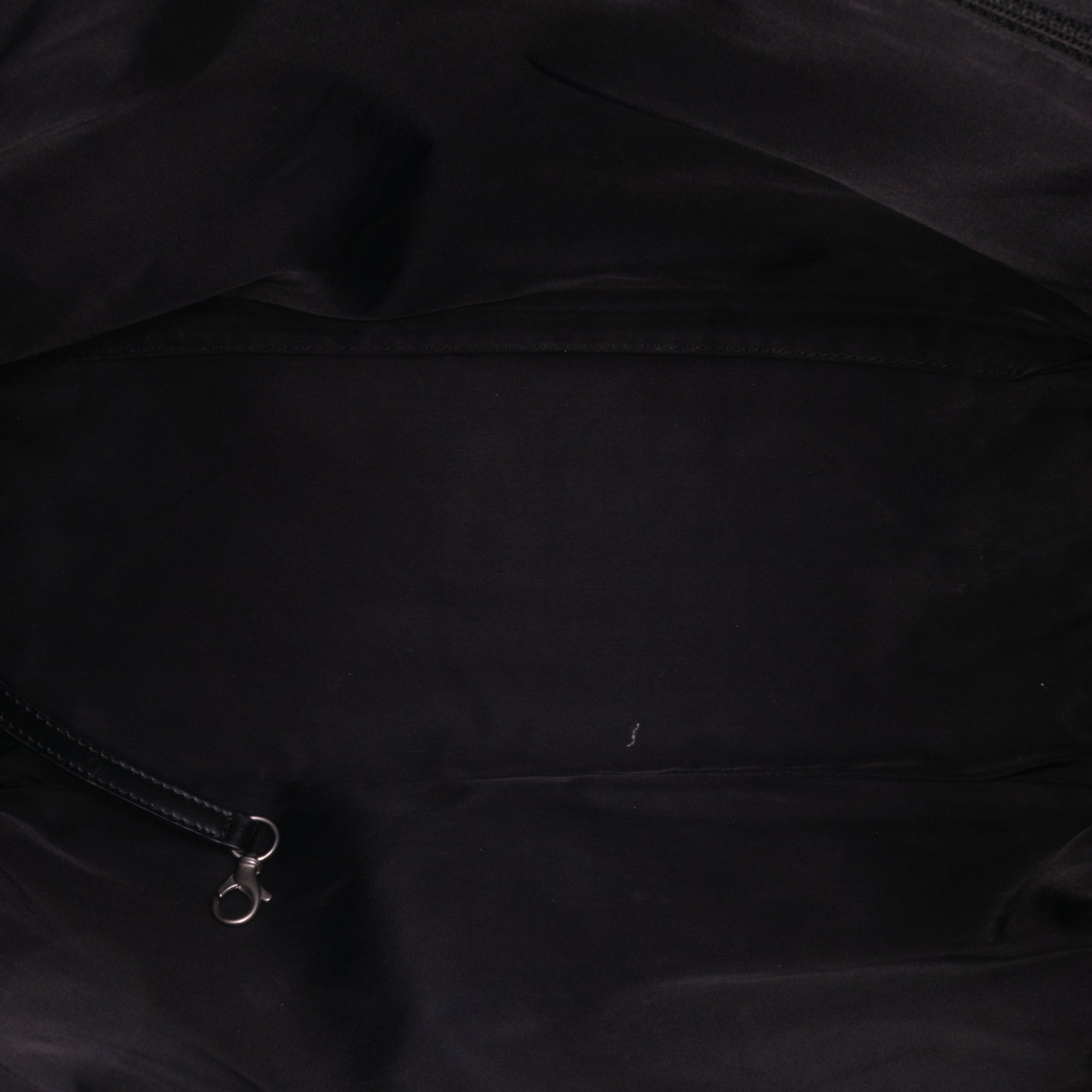 This tote bag features a nylon body with leather trim, flat leather straps, an open top, and interior zip pockets. Retail Price: 1200.00