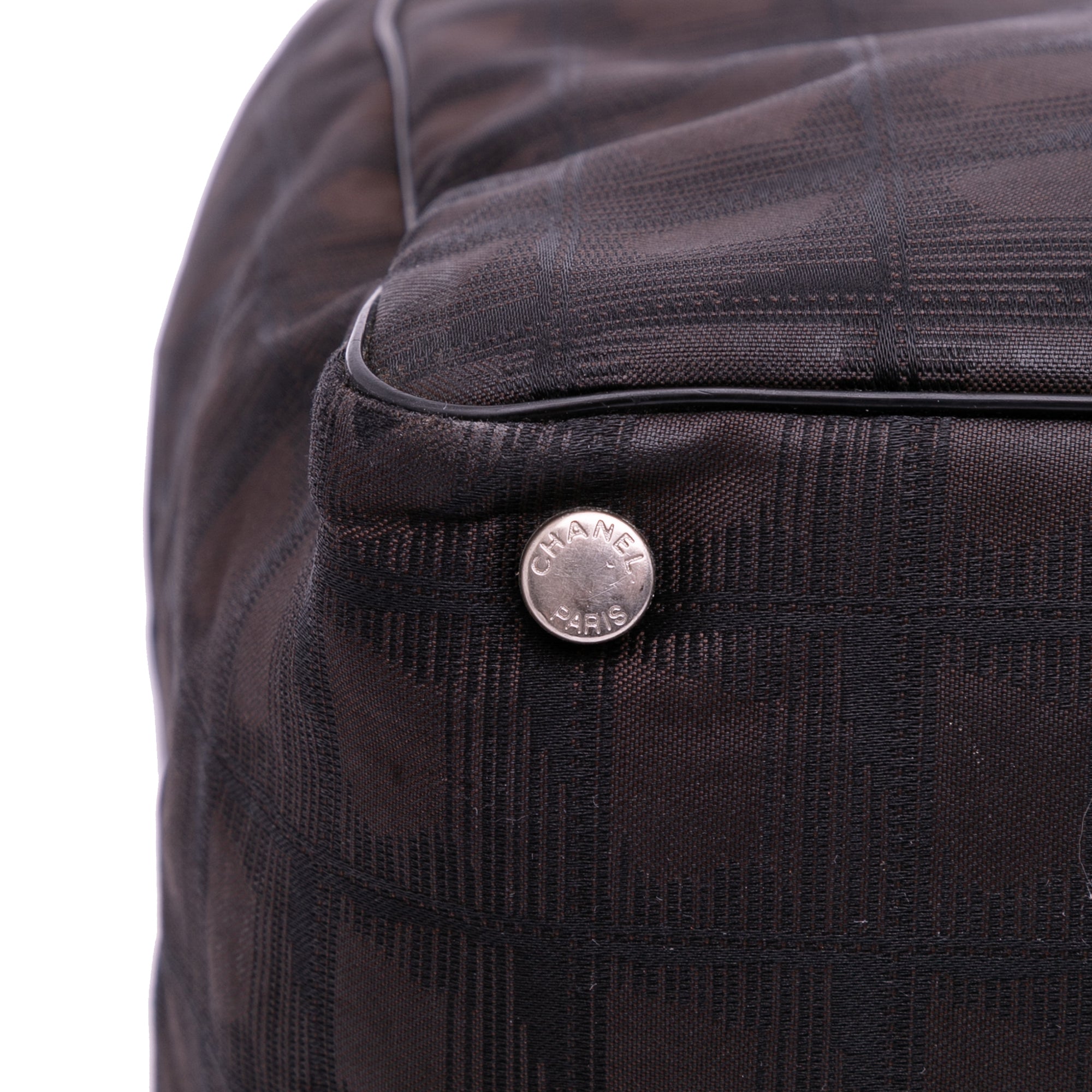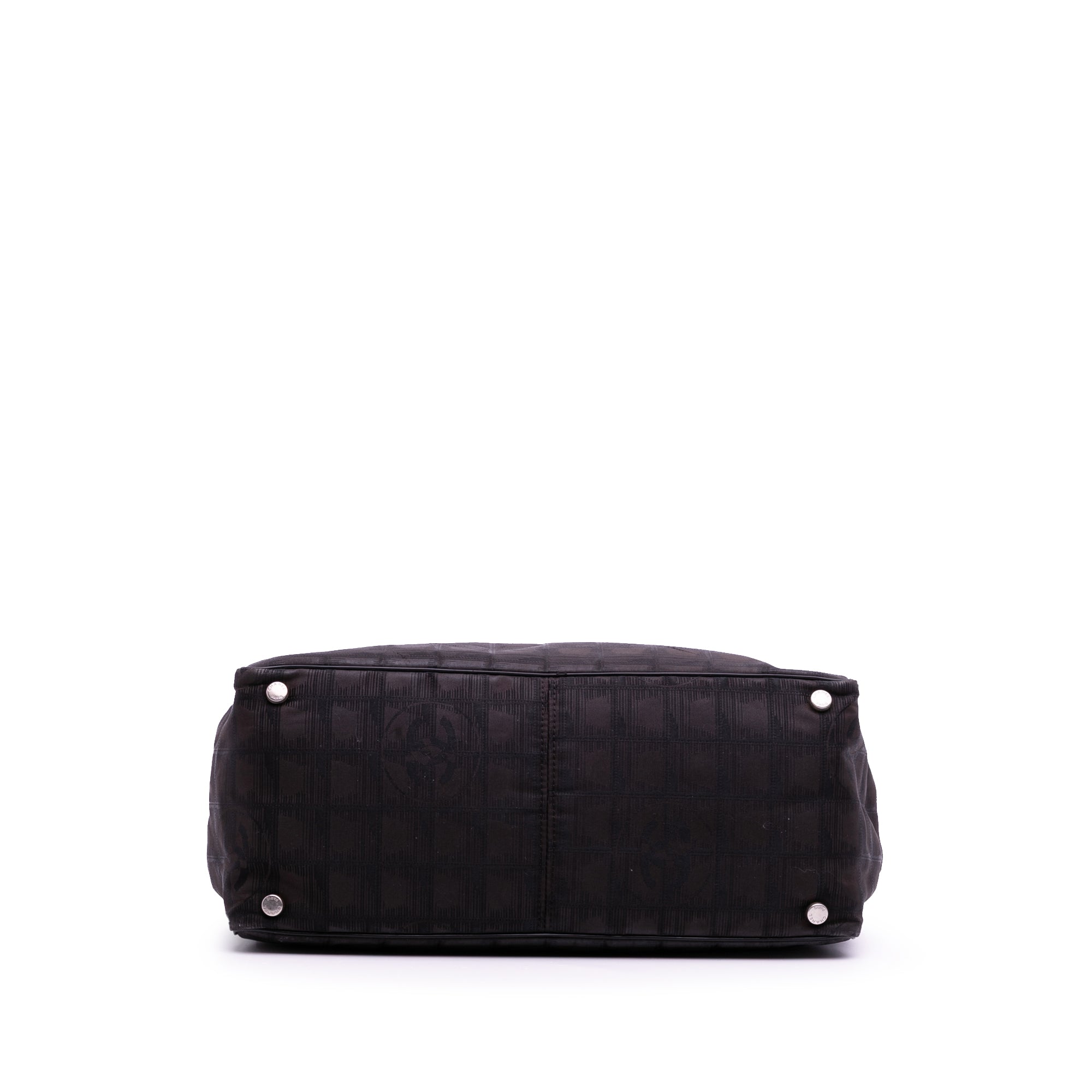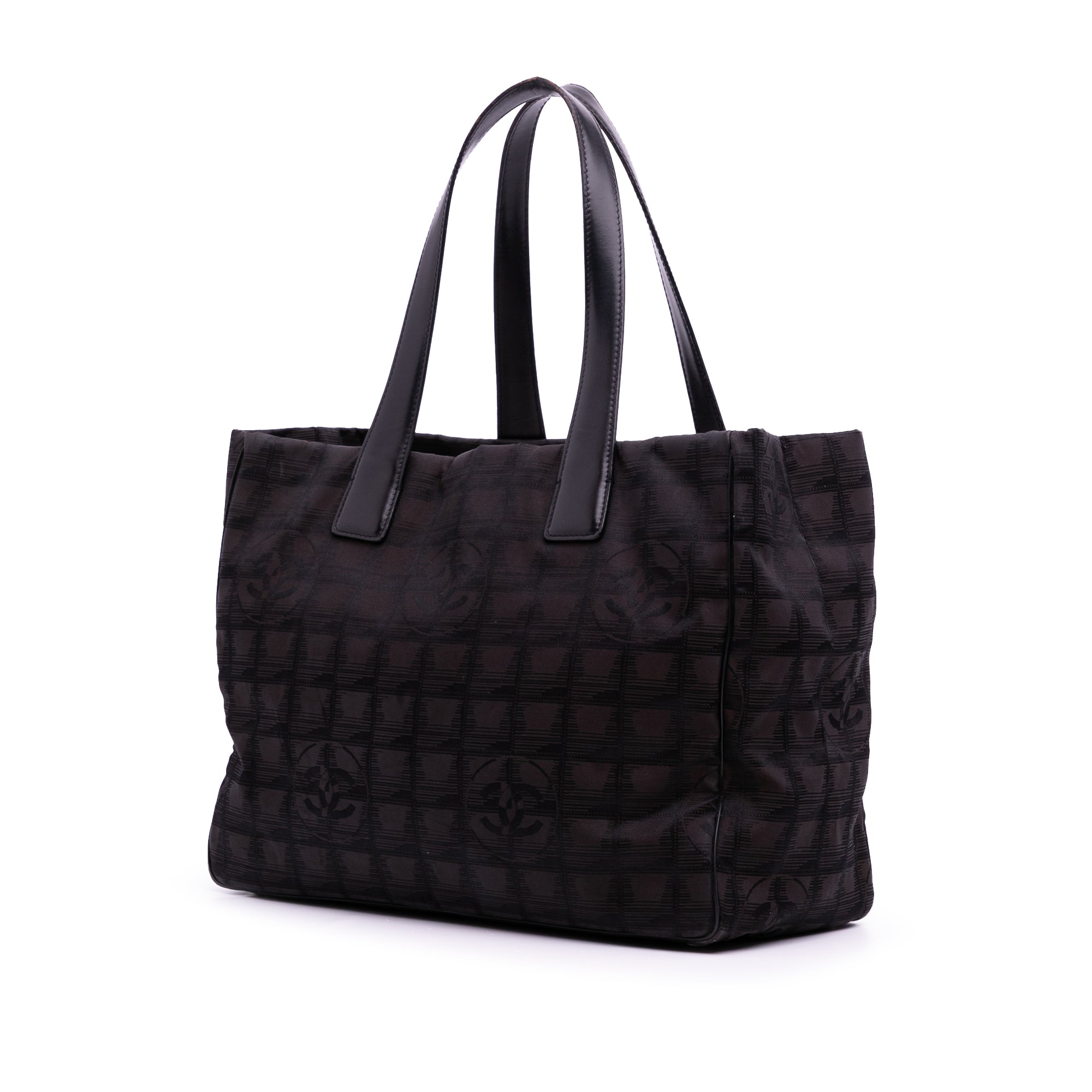 This tote bag features a nylon body with leather trim, flat leather straps, an open top, and interior zip pockets. Retail Price: 1200.00