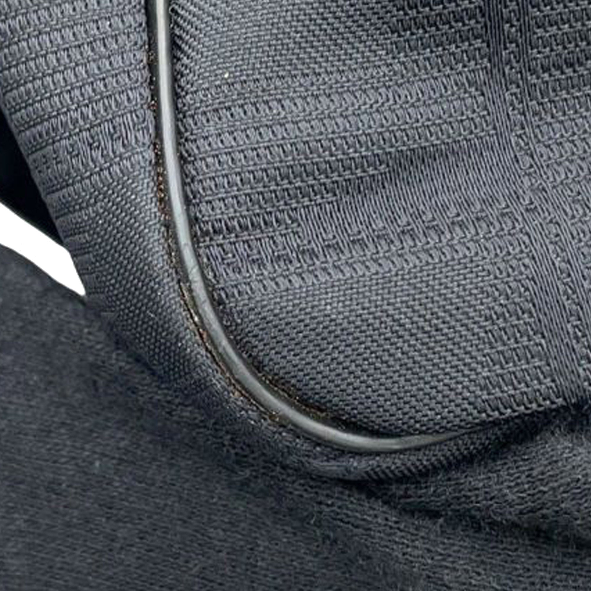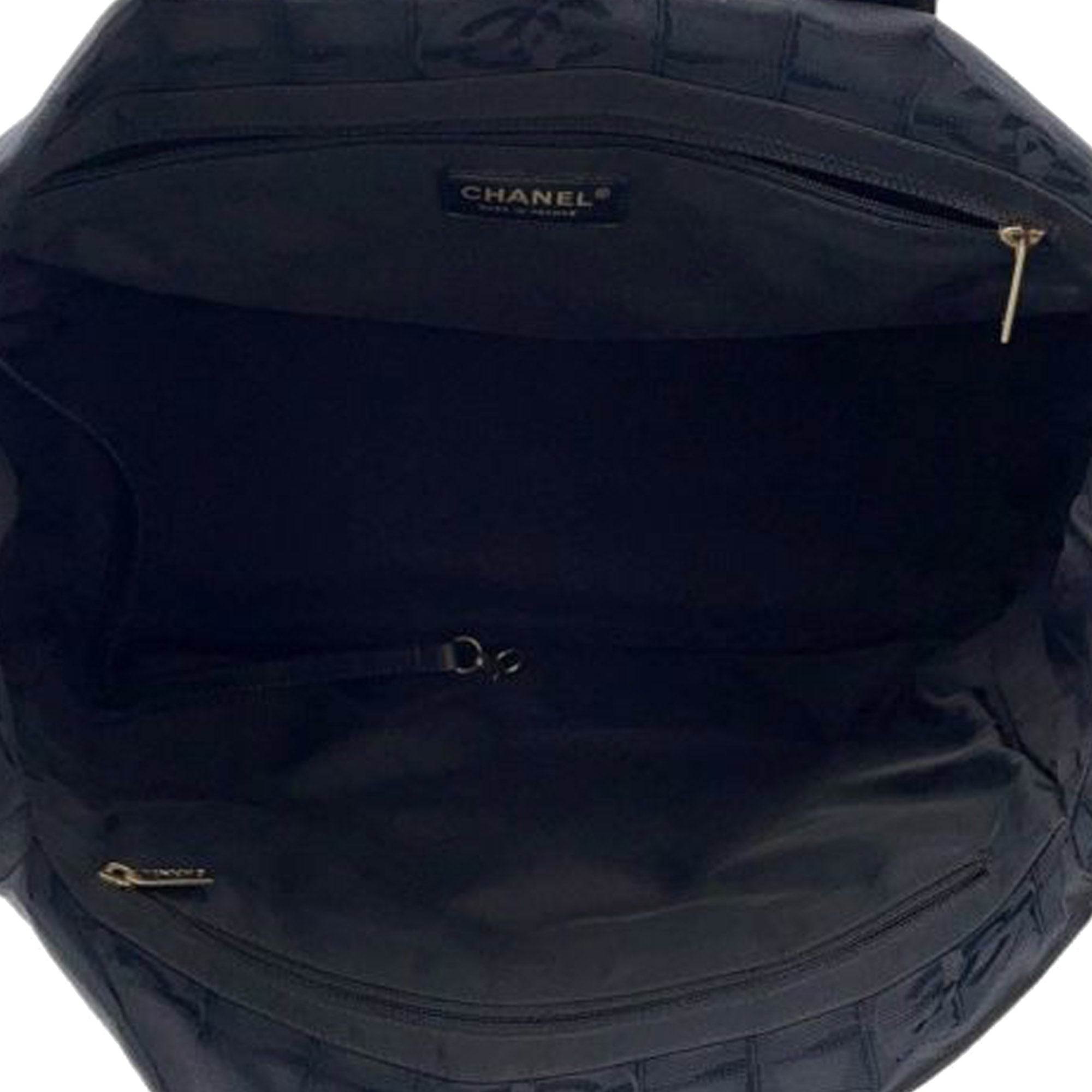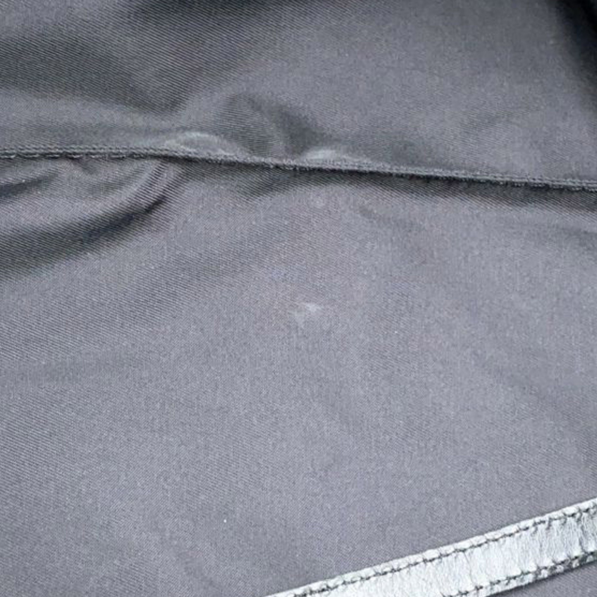 This tote bag features a nylon body with leather trim, flat leather straps, an open top, and interior zip pockets. Retail Price: 1200.00