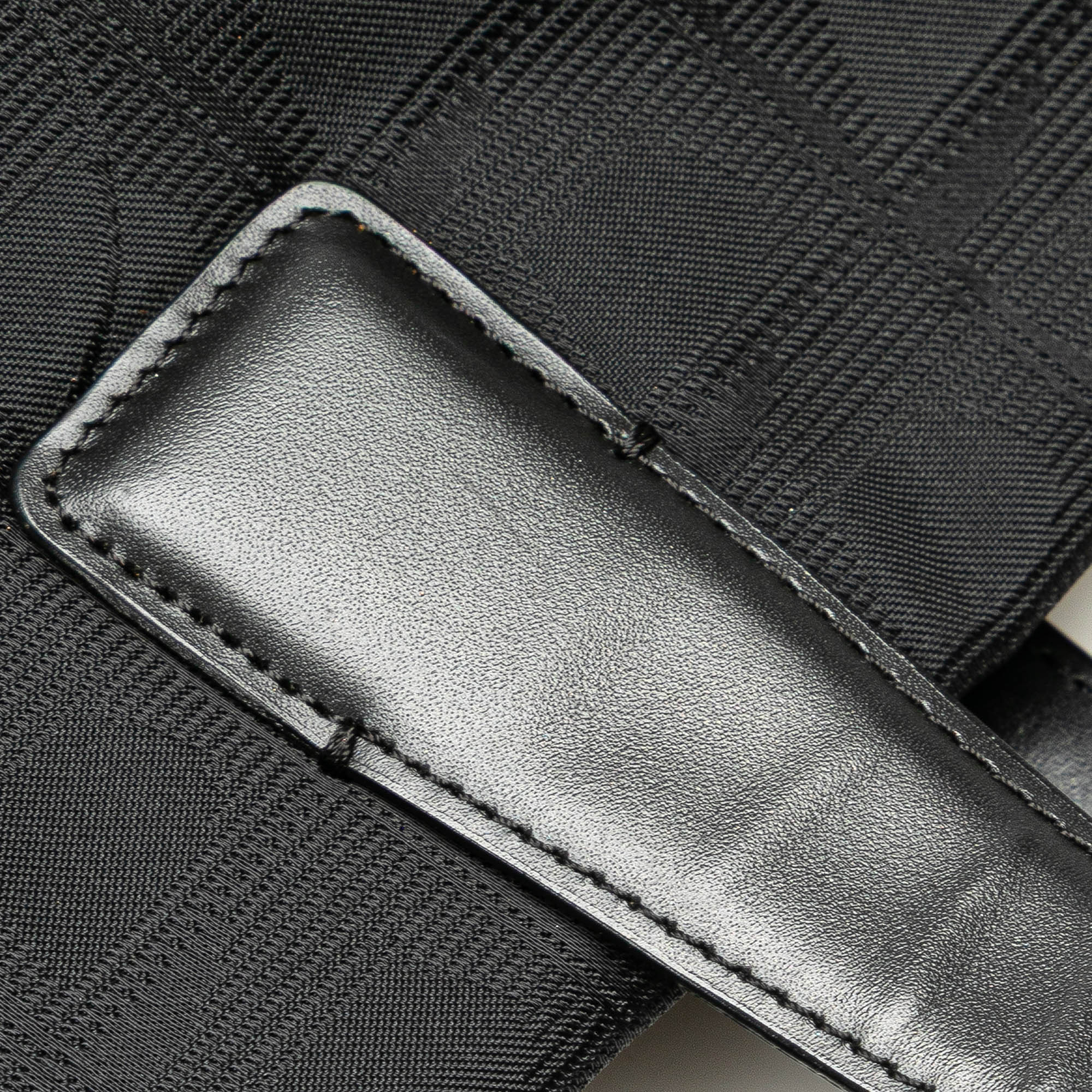 This tote bag features a nylon body with leather trim, flat leather straps, an open top, and interior zip pockets. Retail Price: 1200.00
