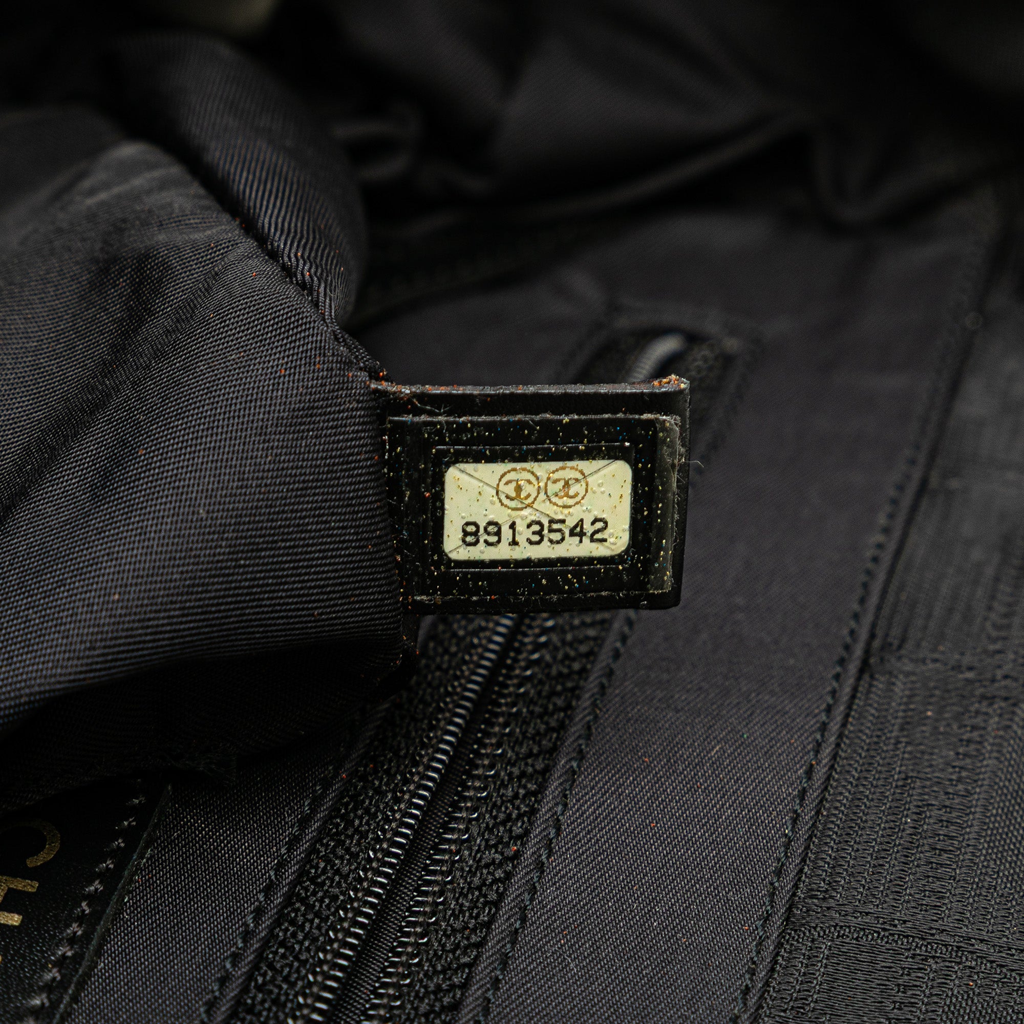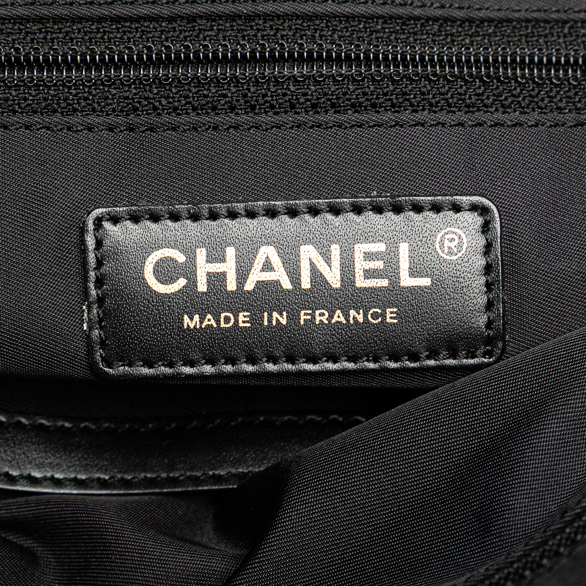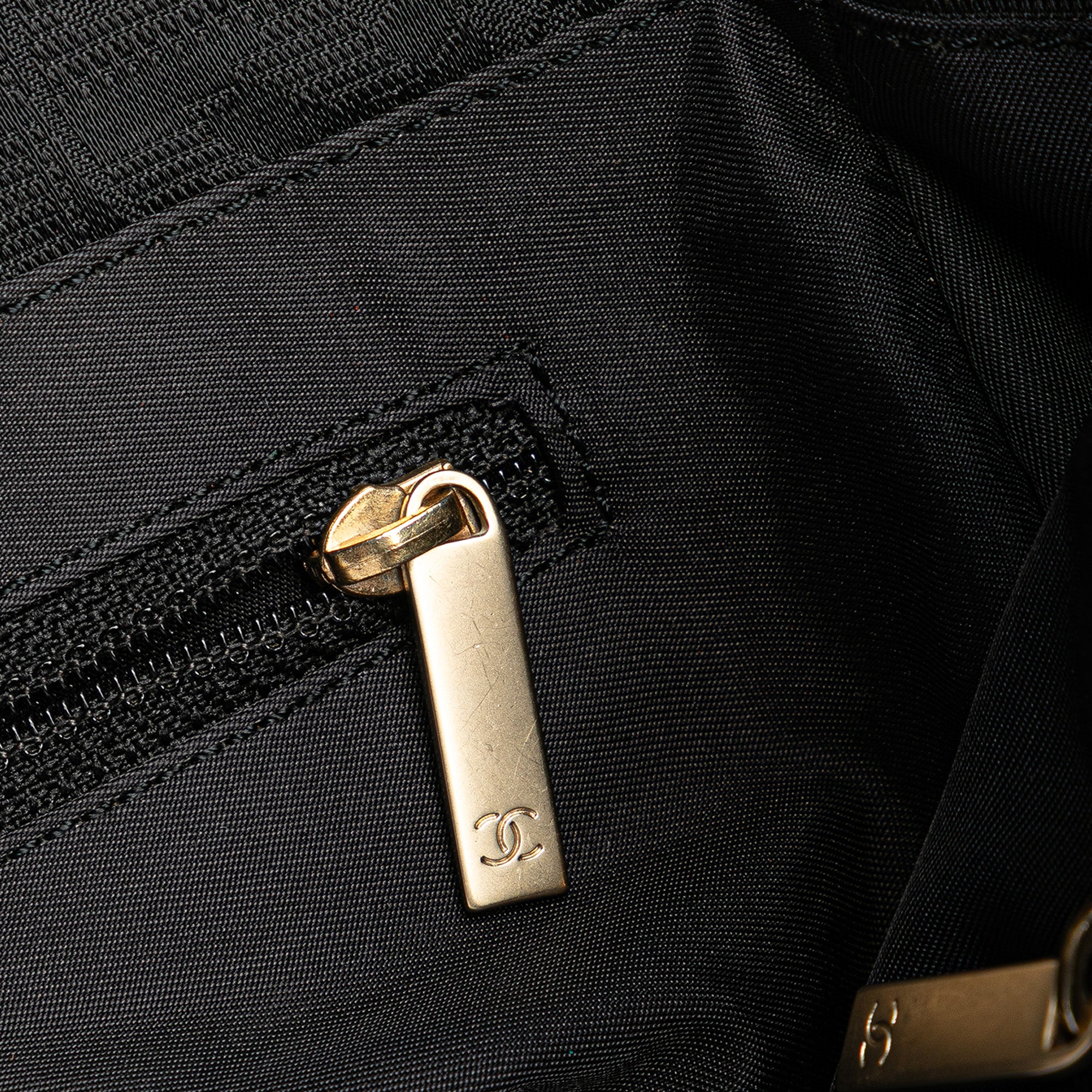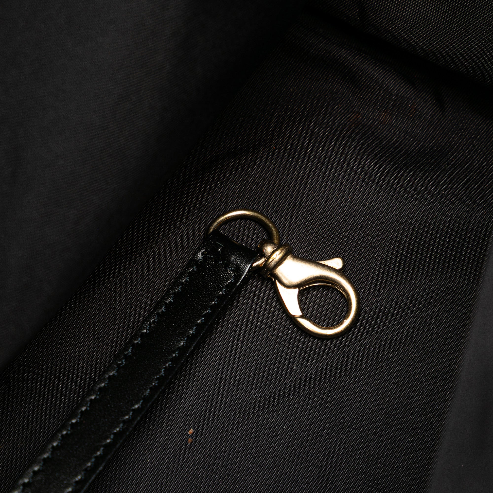 This tote bag features a nylon body, flat leather straps, an open top, and interior zip pockets. Retail Price: 1200.00