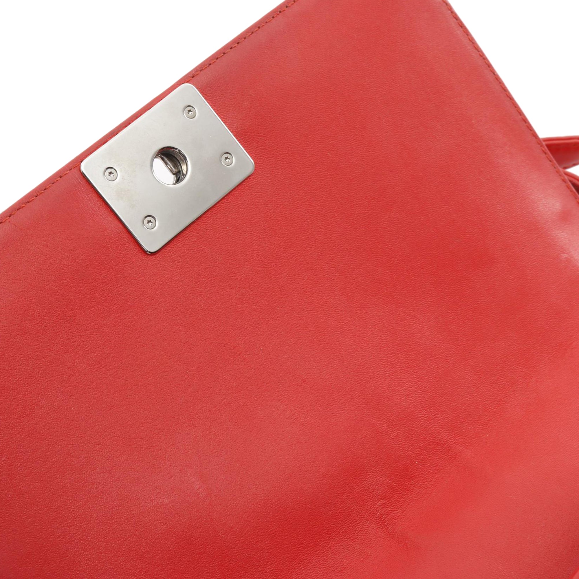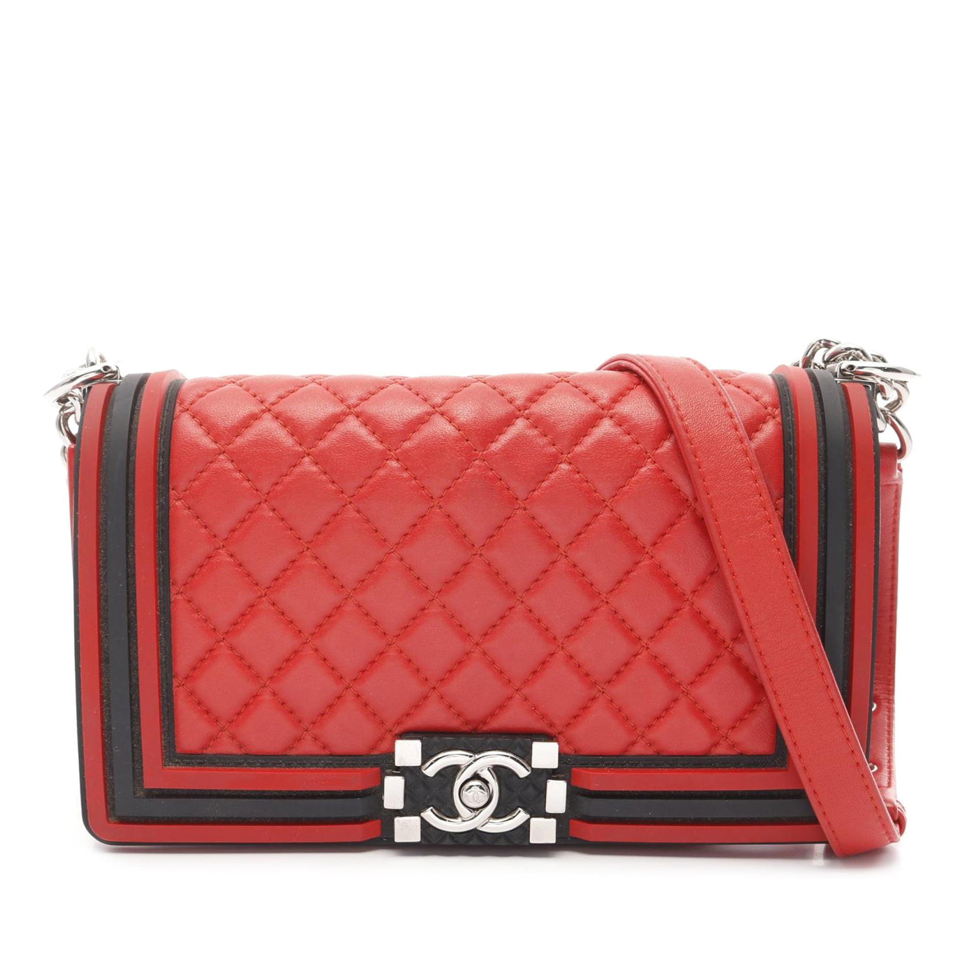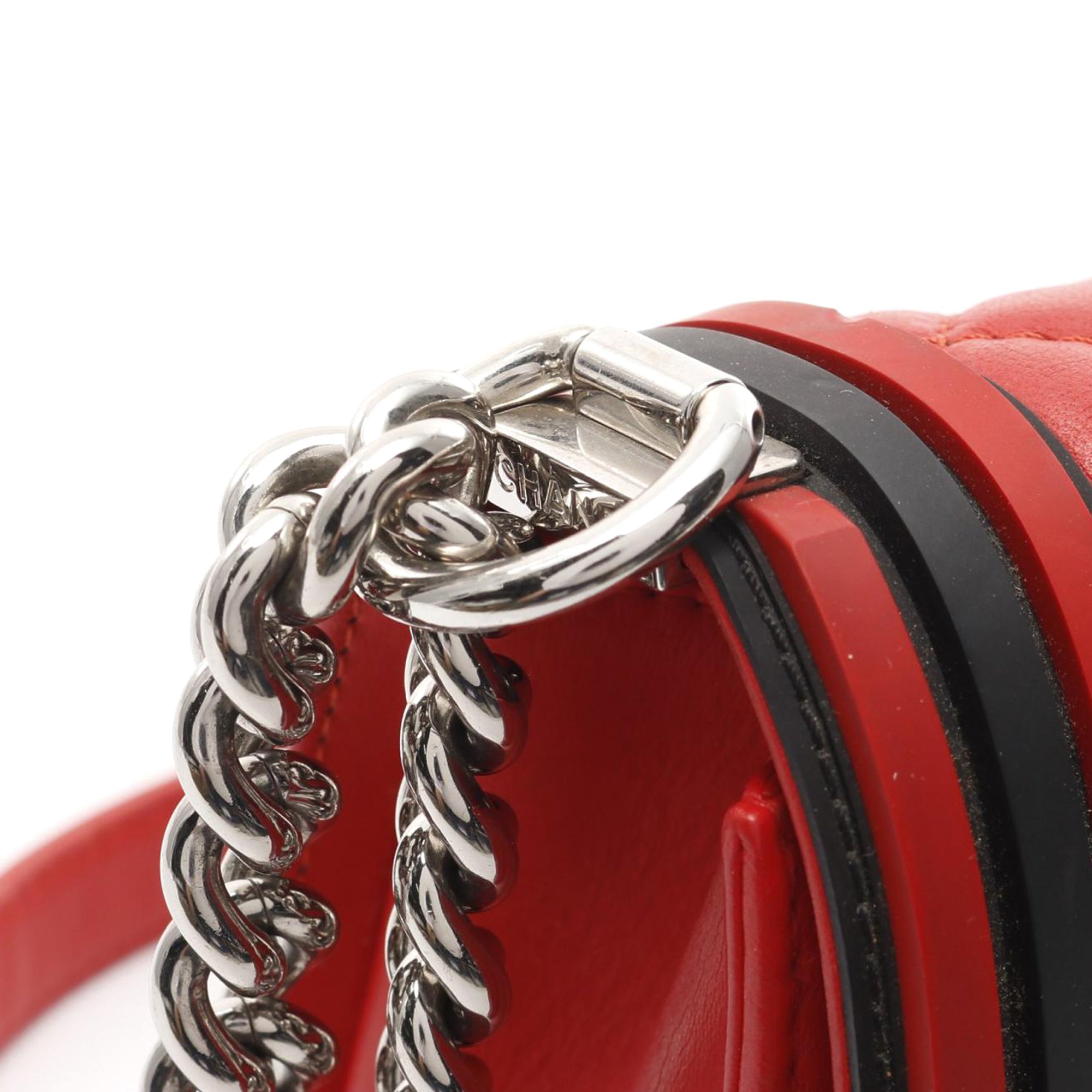 The Boy flap features a quilted lambskin leather body with rubber details, a curb chain and leather strap, a front flap with a push lock closure, and an interior slip pocket. Retail Price: 6900.00