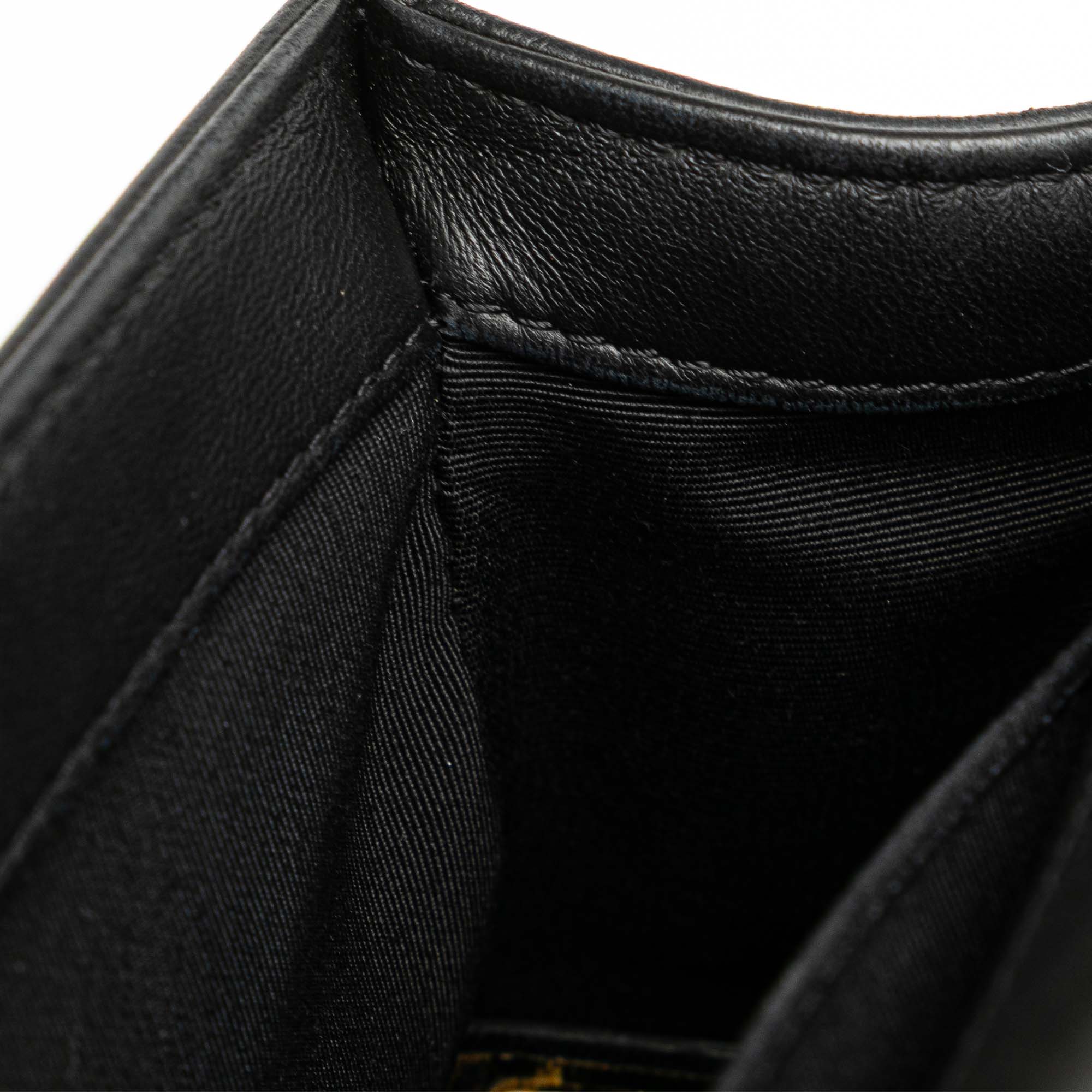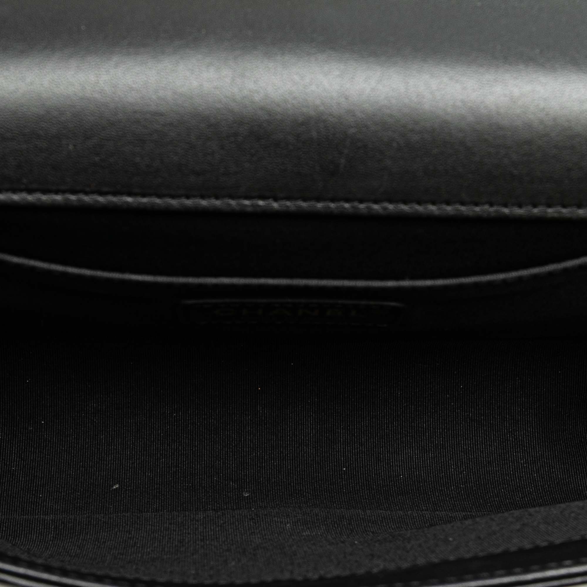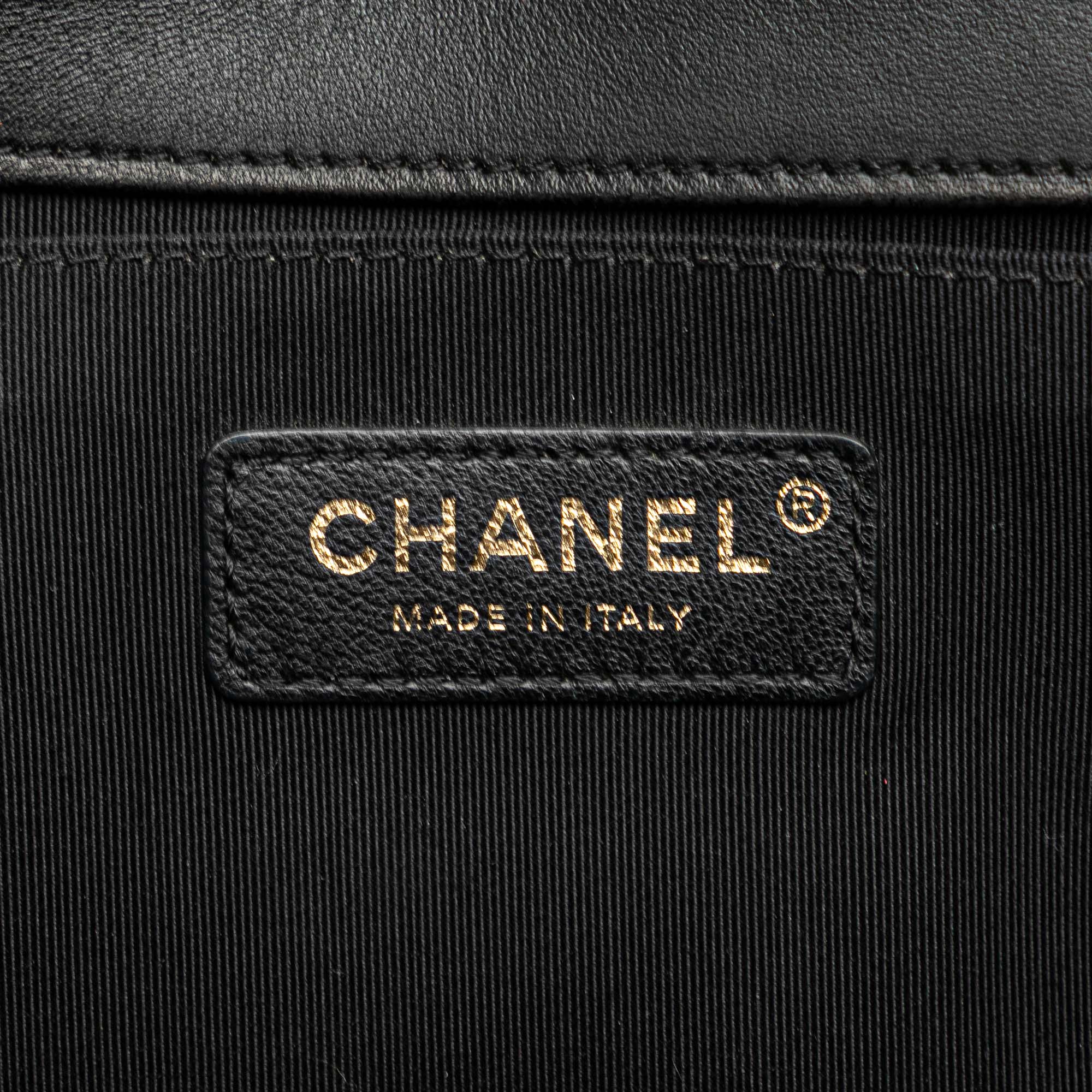The Boy flap features a braided fabric body with leather trim, a curb chain shoulder strap with leather guard, a front flap with interlocking Cs and push lock closure, and an interior slip pocket. Inclusion: authenticity card. Retail Price: 6500.00