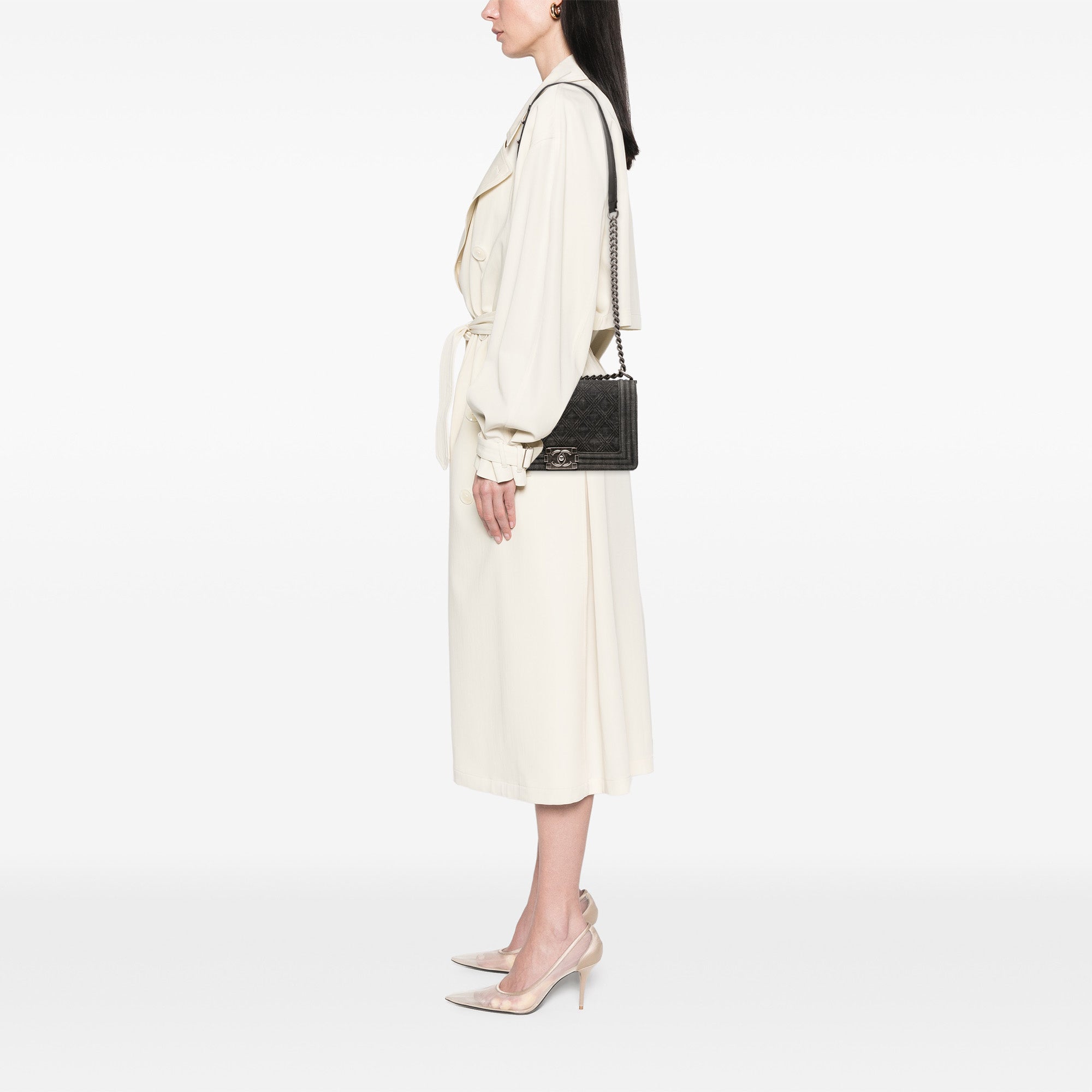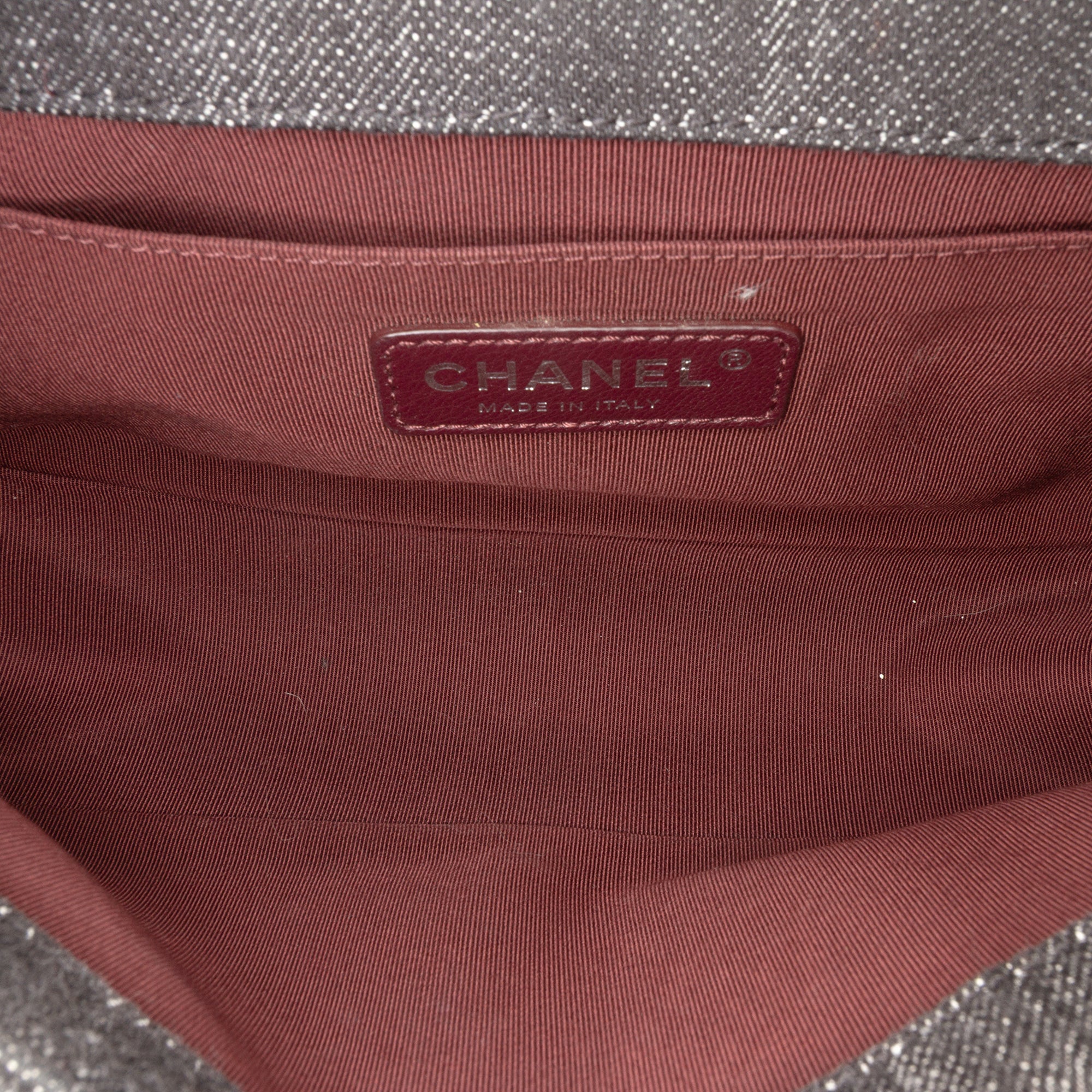 The Boy flap features a quilted denim body, a silver-tone curb chain link shoulder strap with adjustable flat leather shoulder strap, a front flap with push-lock closure, and an interior slip pocket. Inclusion: authenticity card. Retail Price: 3800.00