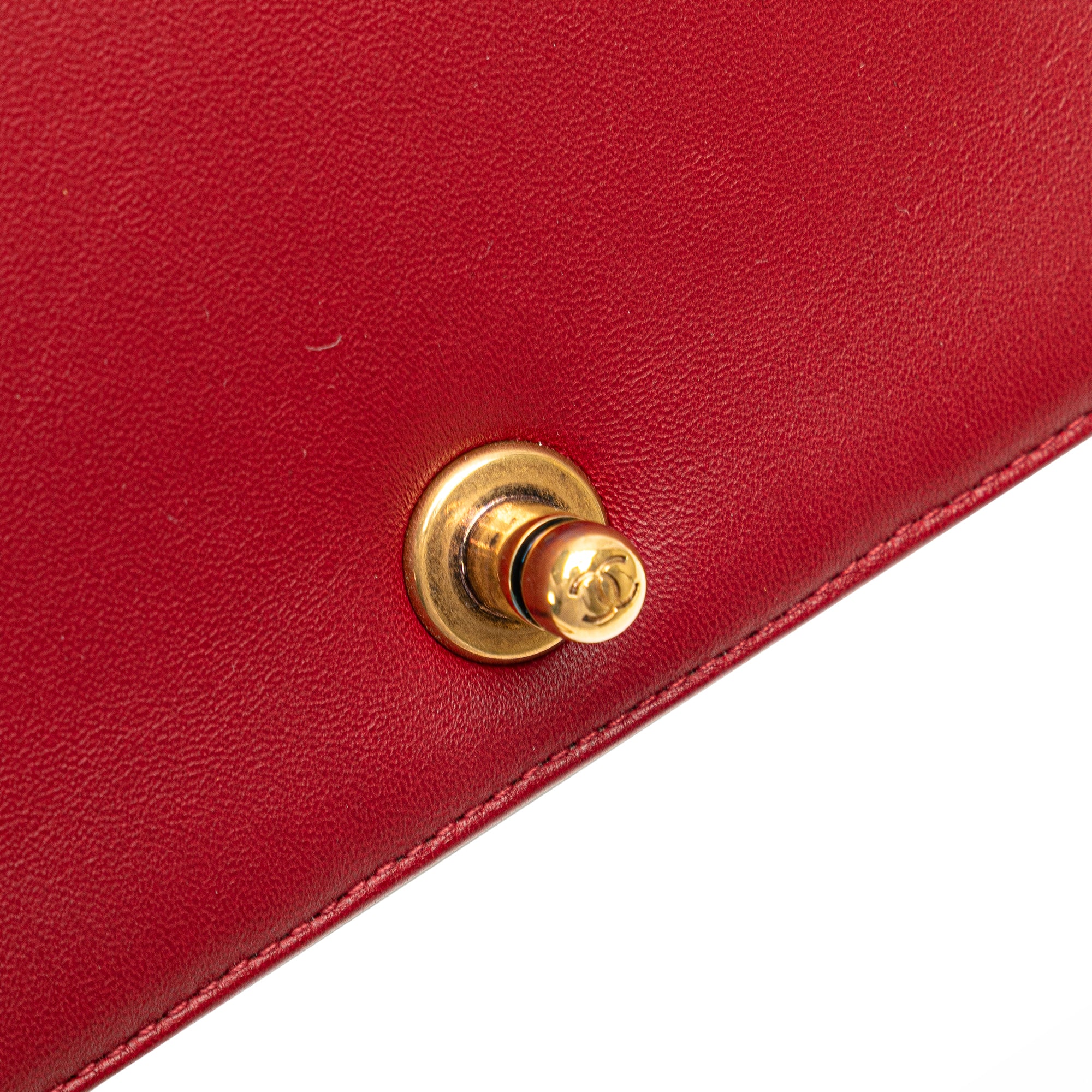 The Boy flap features a quilted lambskin leather body, a gold-tone woven chain strap, and a front flap with magnetic snap closure, and interior slip pockets. Retail Price: 5992.00