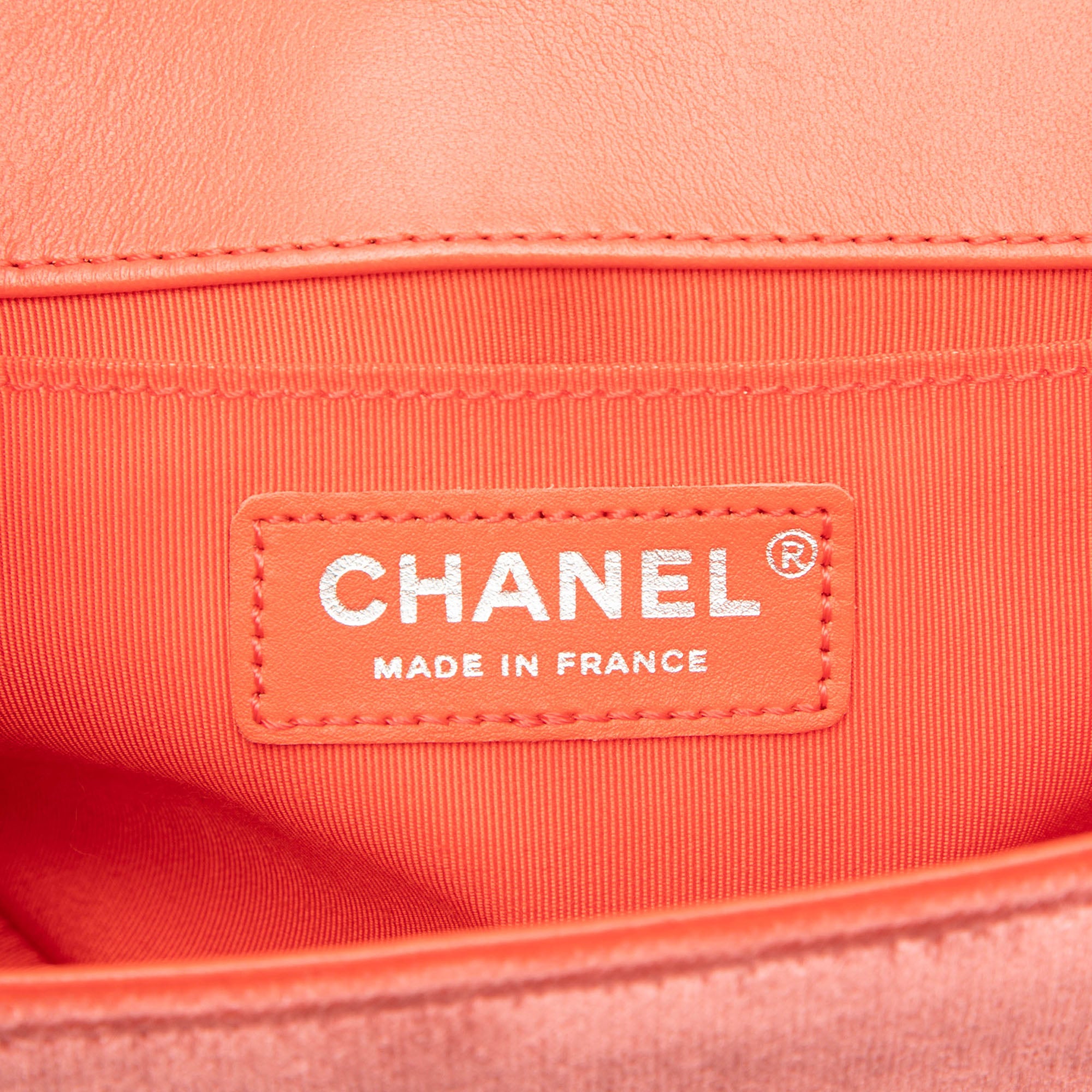 The Boy flap features a quilted velvet body, a curb chain strap, a front flap with push lock closure, and an interior slip pocket. Retail Price: 3650.00