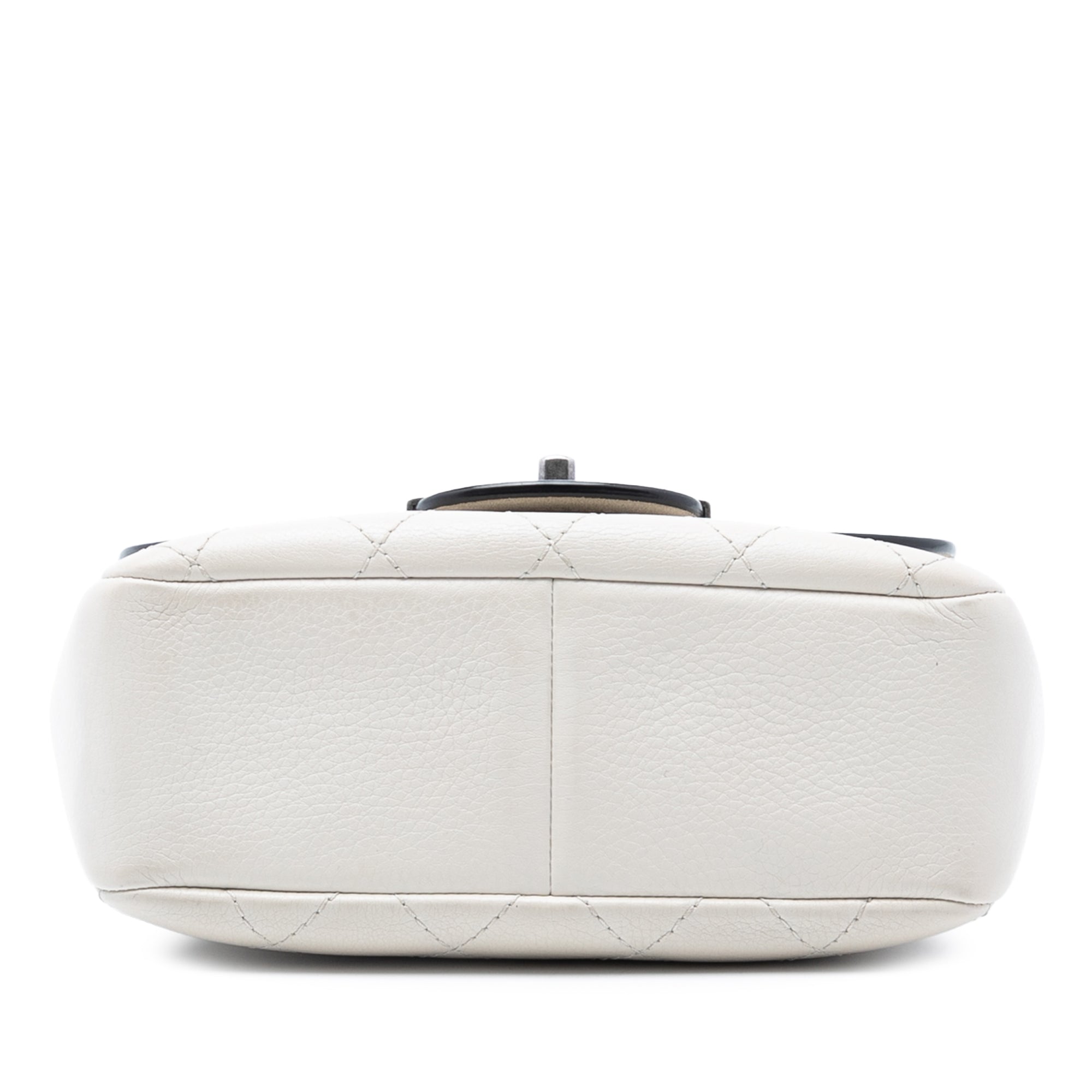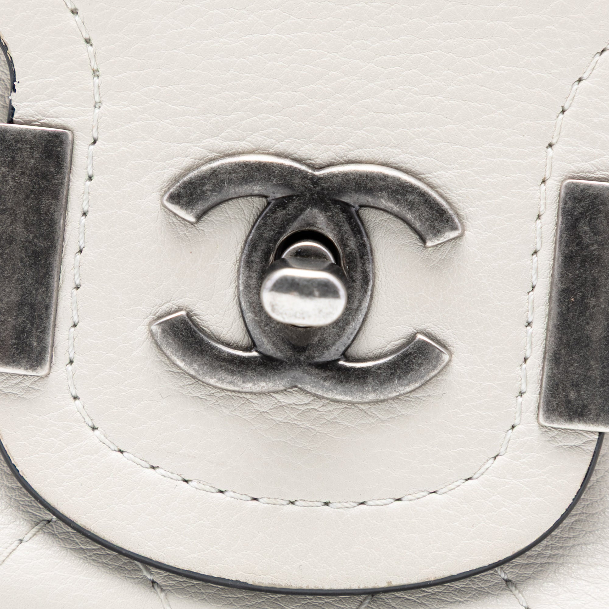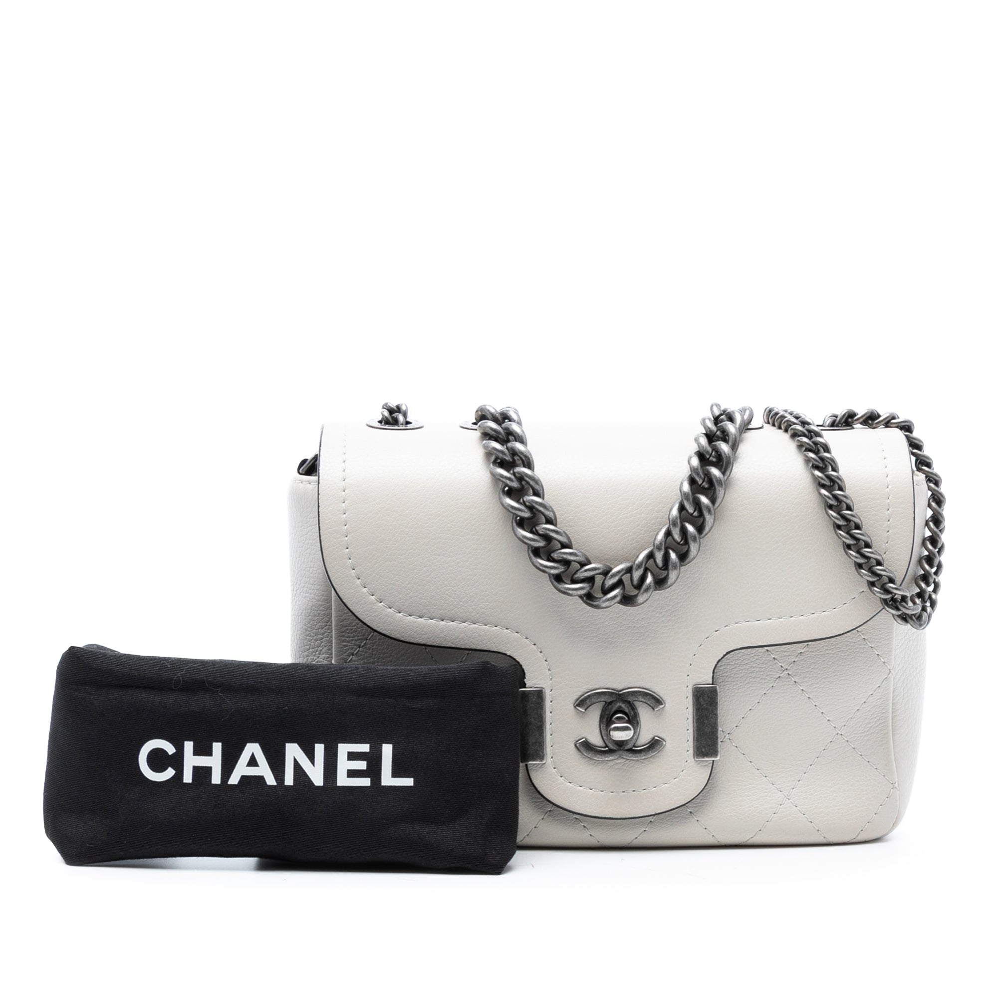 This flap features a quilted leather body, a silver-tone chain-link handle, a silver-tone chain link strap with leather guard, and a front flap with CC turn-lock closure. Inclusion: Dust bag. Retail Price: 5500.00