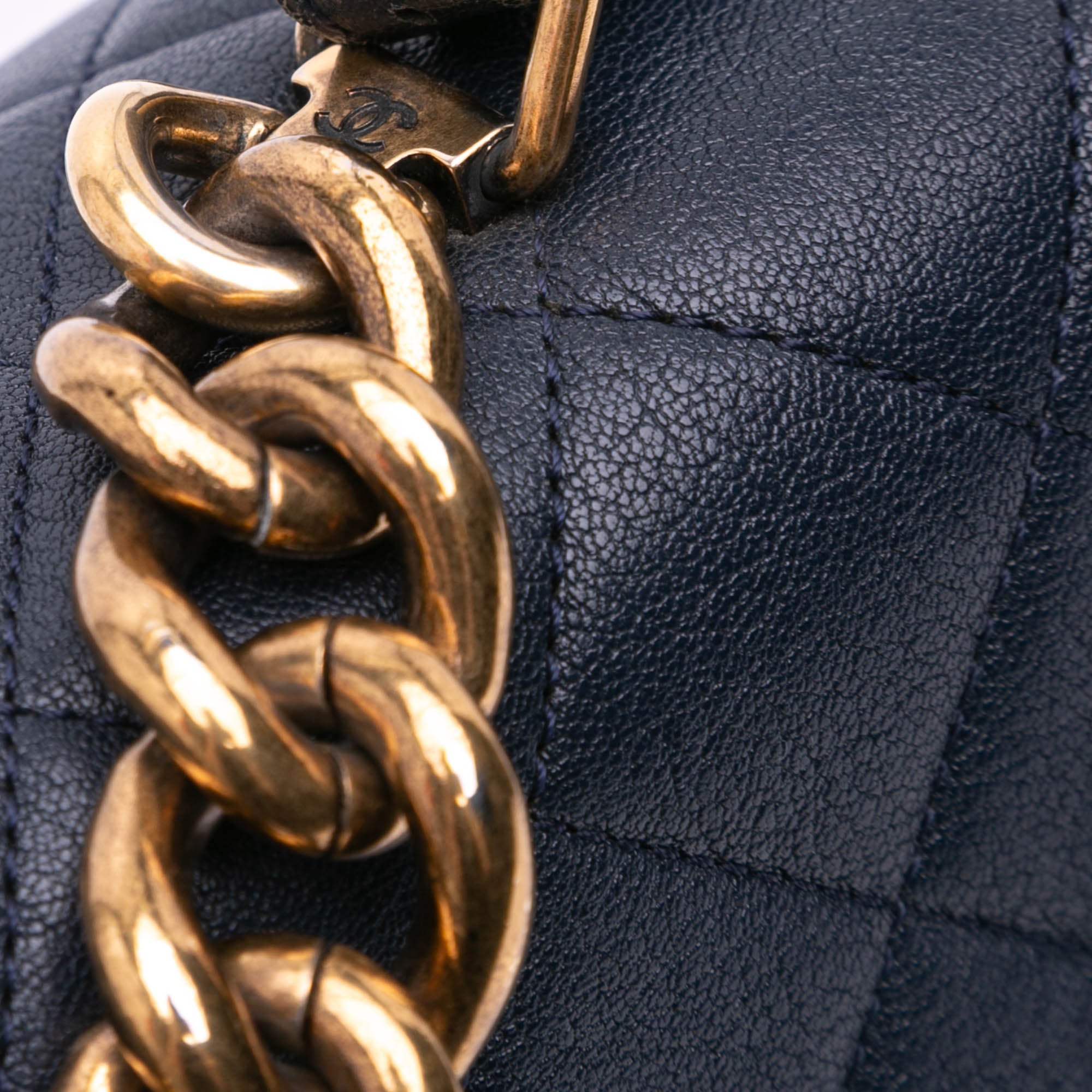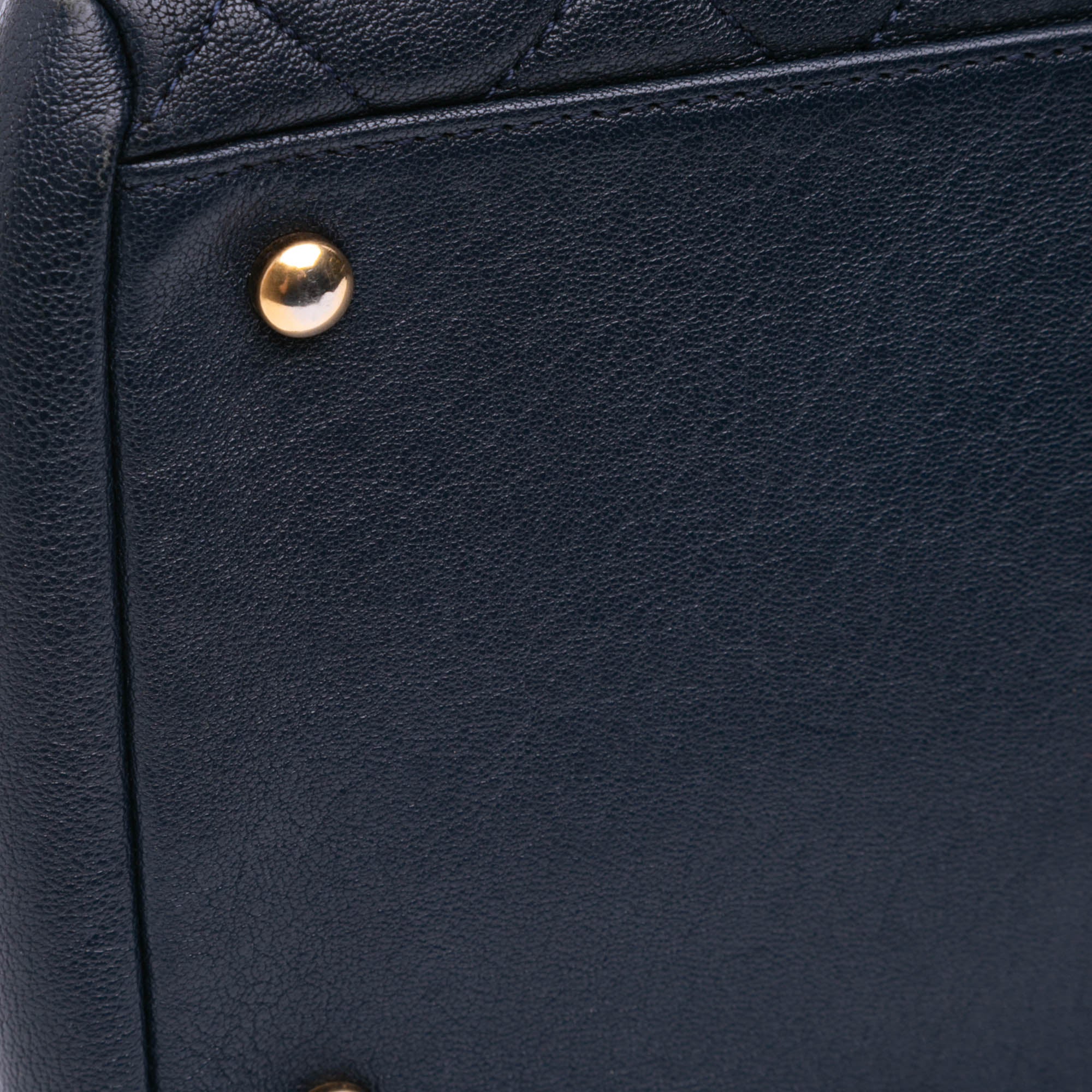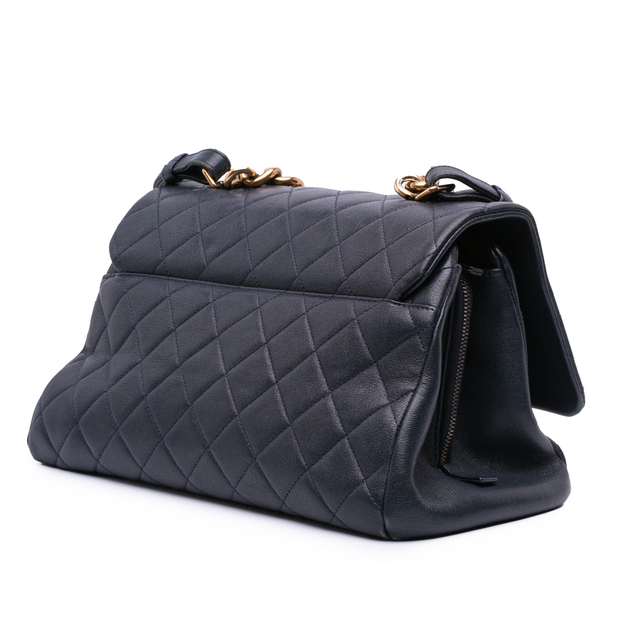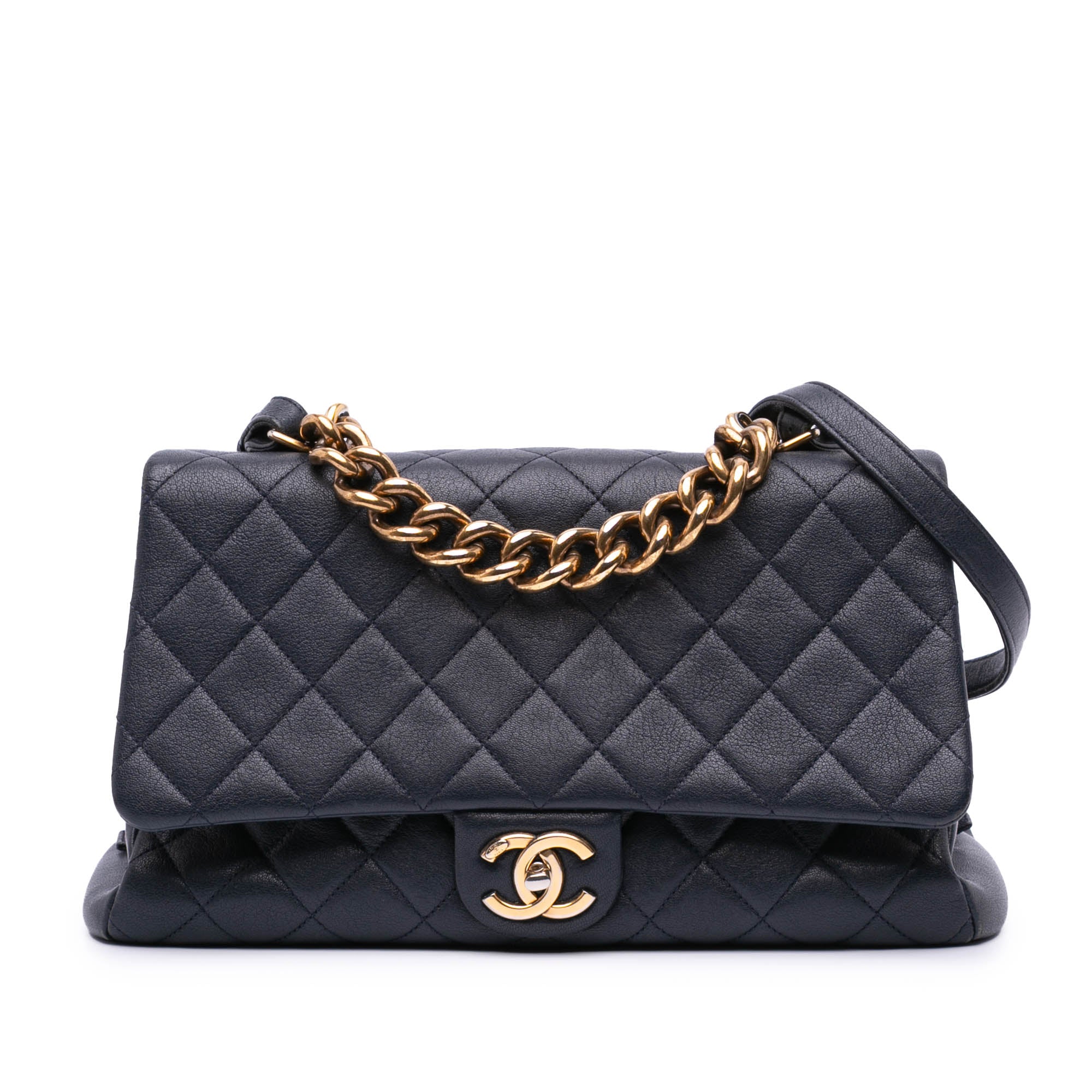 The Trapezio features a quilted sheepskin leather body, a curb chain handle, a flat leather shoulder strap, a front flap with interlocking Cs and a twist lock closure, interior zip and slip compartments, and an interior zip pocket. Retail Price: 3400.00