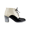 Expertly crafted by Chanel, these bi-color ankle boots are the epitome of chicness. Made with black and beige patent leather, they feature tie-up shoelaces and detachable bow details for added elegance. The silver block heel displays a signature CC emblem, completing the stylish look.