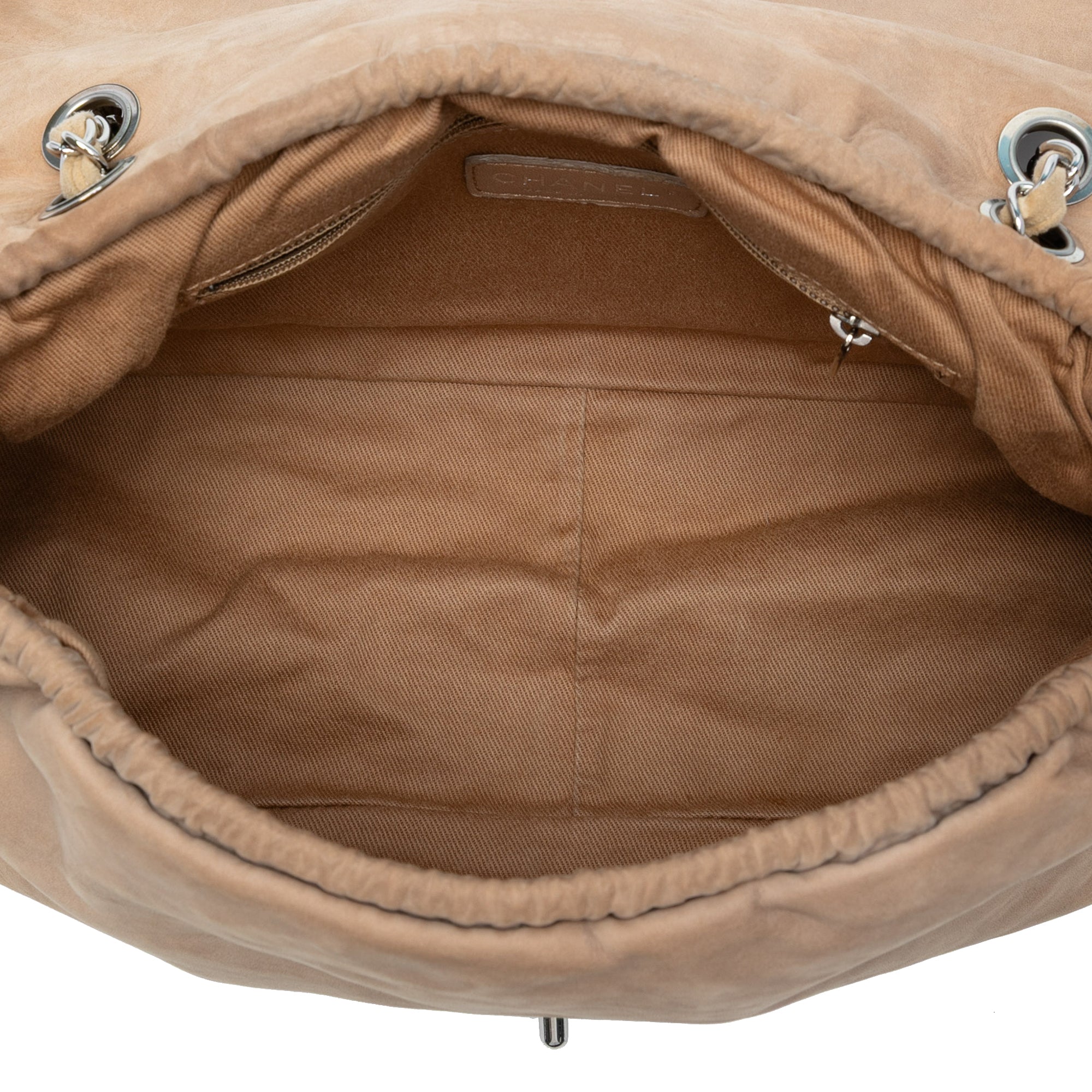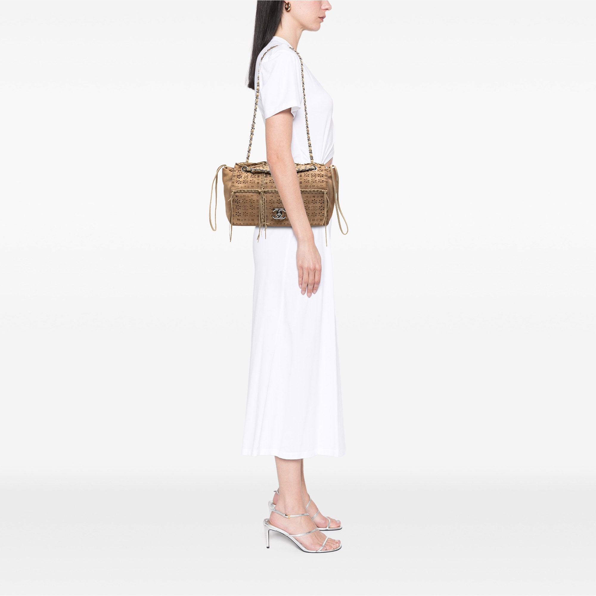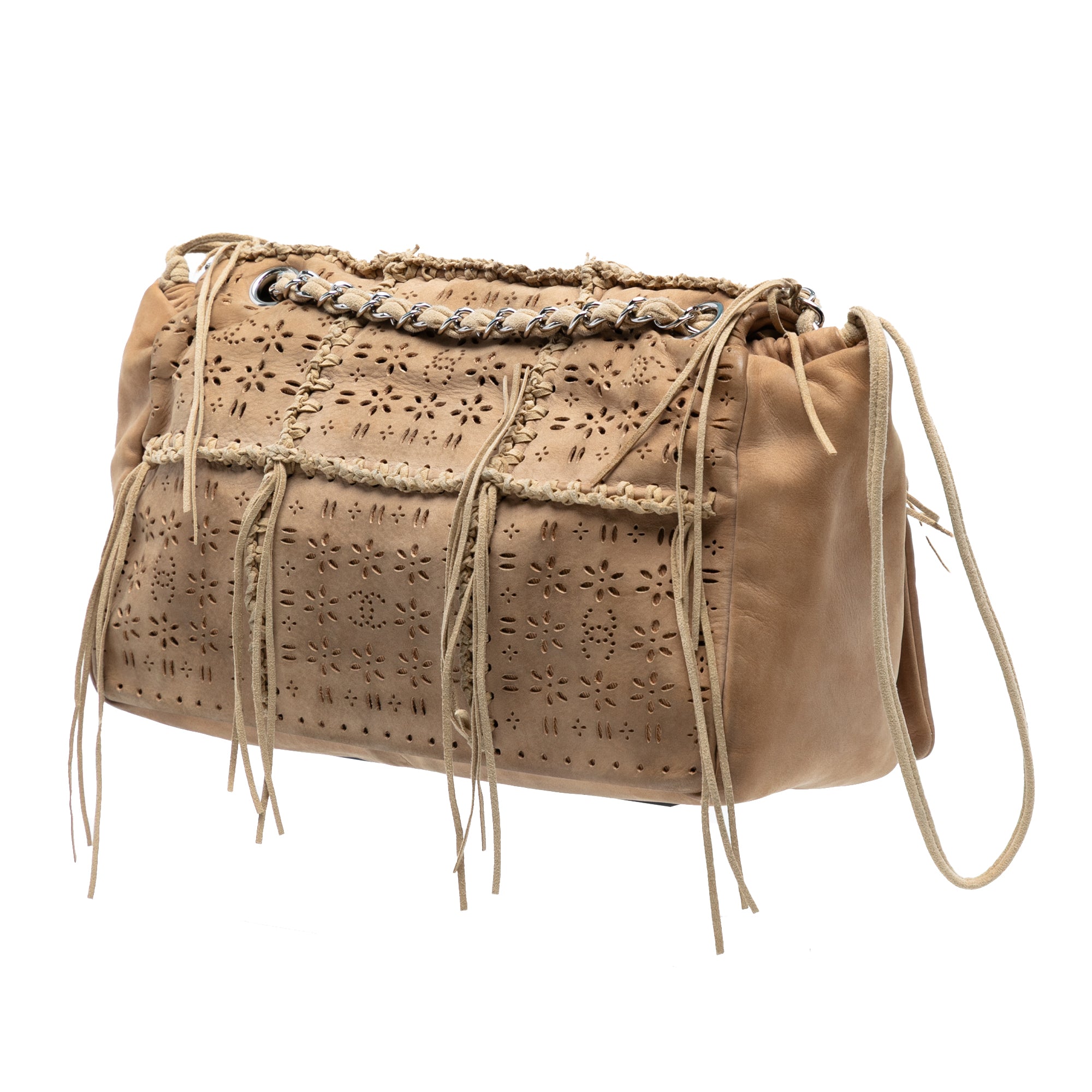 This shoulder bag features a perforated leather body with fringe details, suede leather woven chain straps, a front flap with turn lock closure, and an interior zip pocket. Retail Price: 3600.00