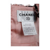 The Jacket is embellished with similar loose black and pink yarn ends as the top and a wide slit on the back. The slit on the sleeves is accented with a black and golden Chanel CC button.