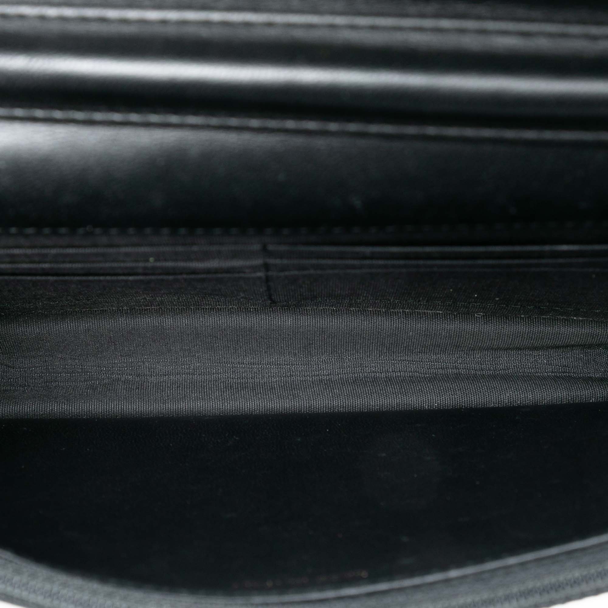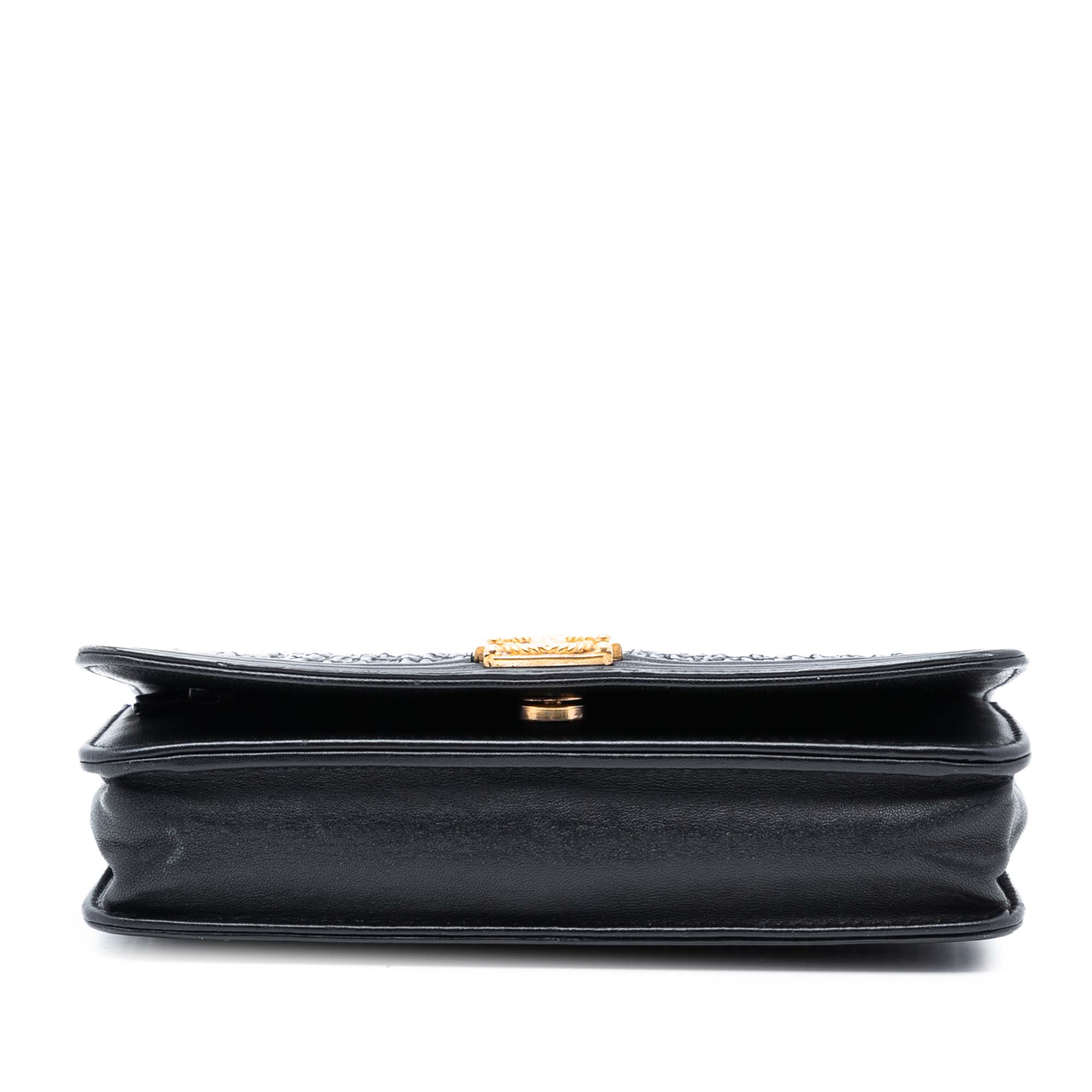 The Boy wallet on chain features a calf leather body, a leather woven chain link strap, a front flap with magnetic snap button closure, and interior zip and slip pockets. Inclusion: authenticity card. Retail Price: 3550.00