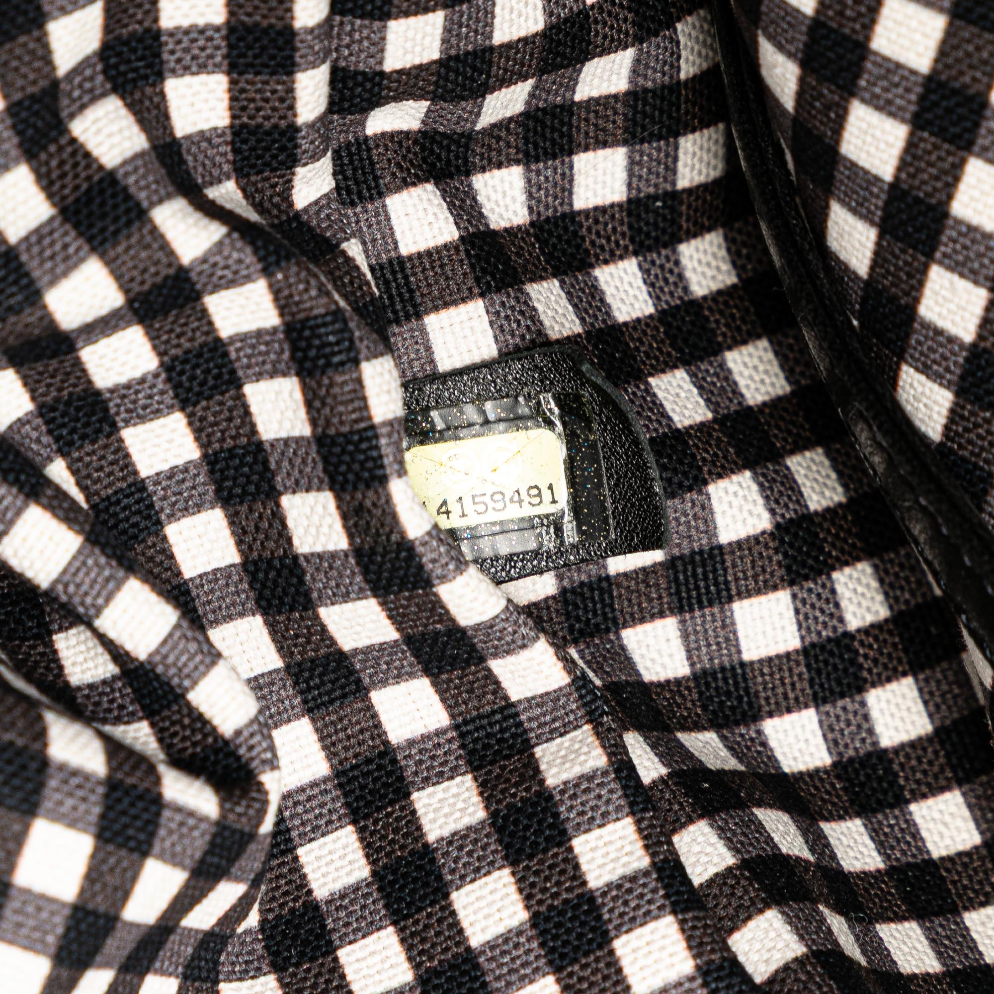 This tote bag features a gingham canvas body, flat leather handles, an open top, and interior zip and open pockets. Inclusion: Dust bag, authenticity card. Retail Price: 2500.00