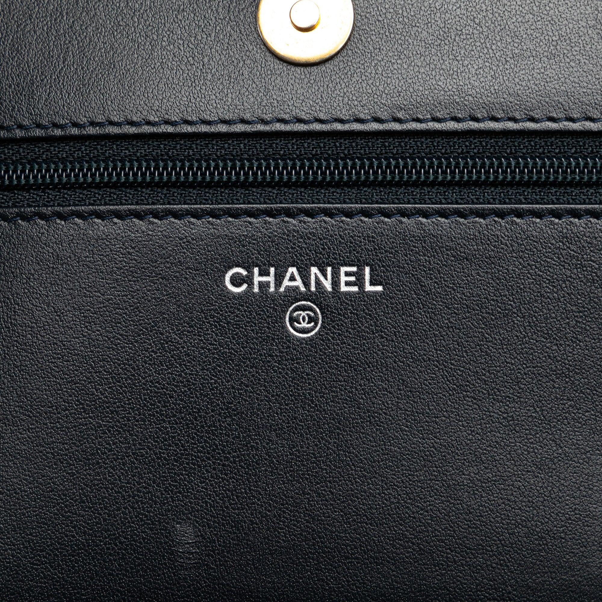 This wallet on chain features a quilted calfskin leather body, a leather woven chain strap, a front flap with a magnetic closure, interior zip and slip pockets, and interior card slots. Inclusion: authenticity card. Retail Price: 2700.00