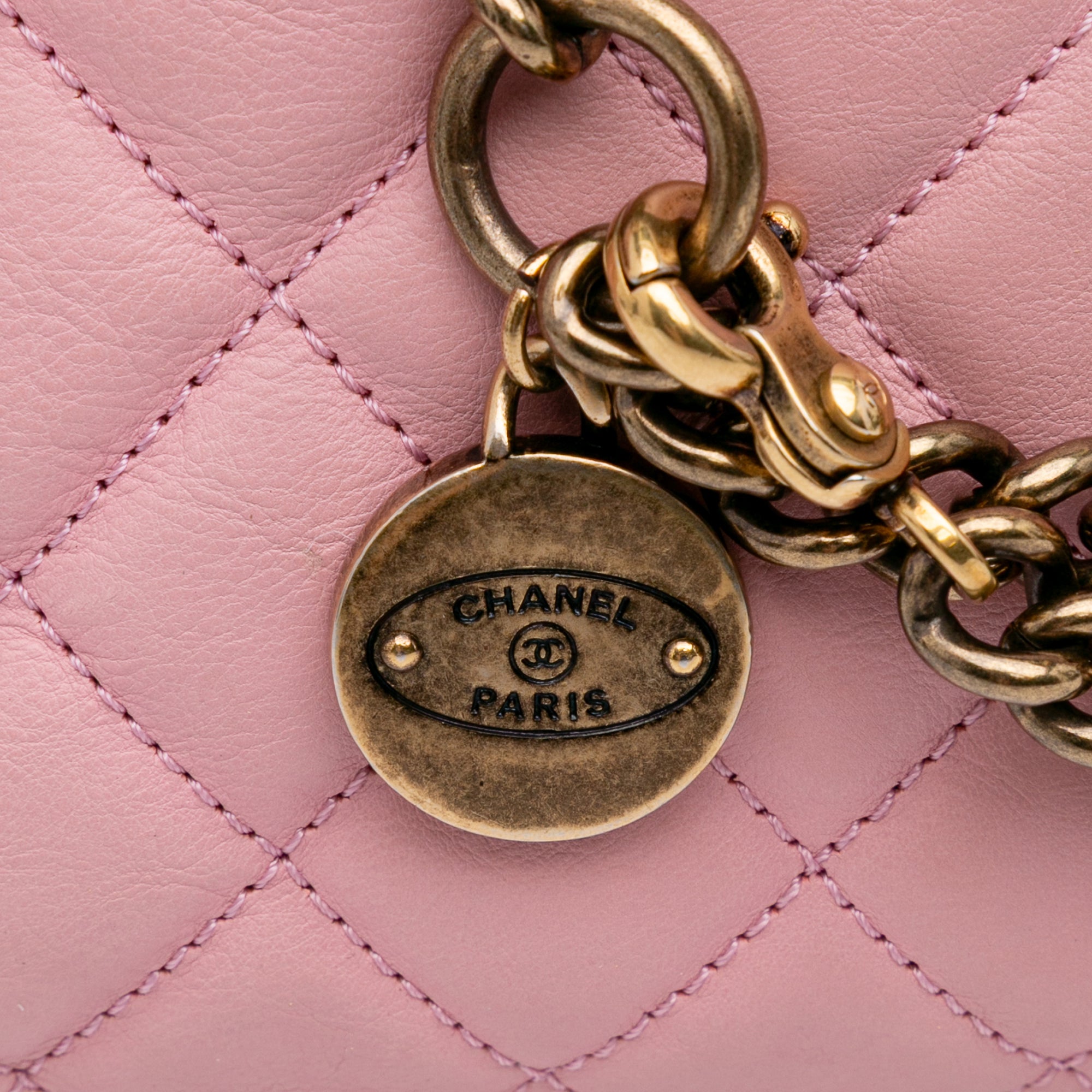 This shoulder bag features a quilted calf leather body, chain link straps, a front flap with CC turn-lock closure, an exterior back zip compartment, and an interior zip pocket. Inclusion: authenticity card. Retail Price: 3400.00