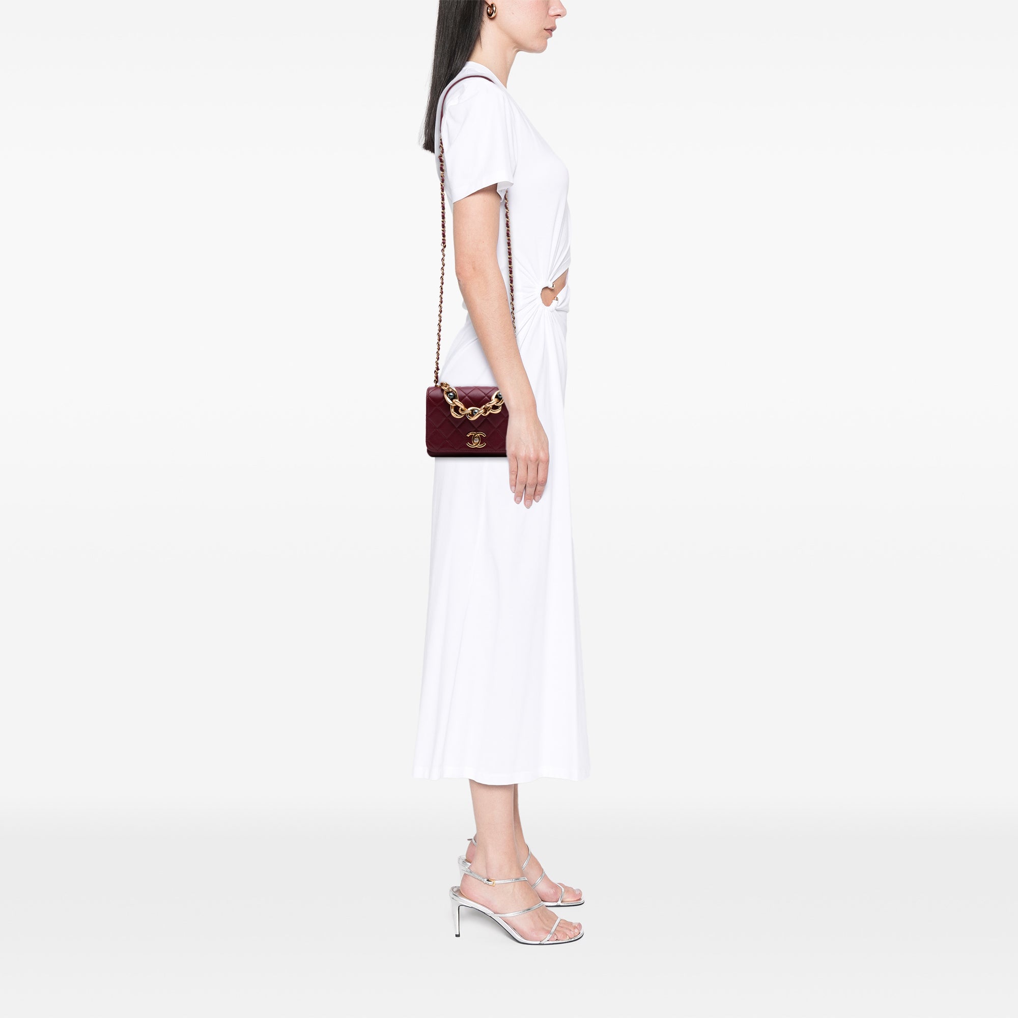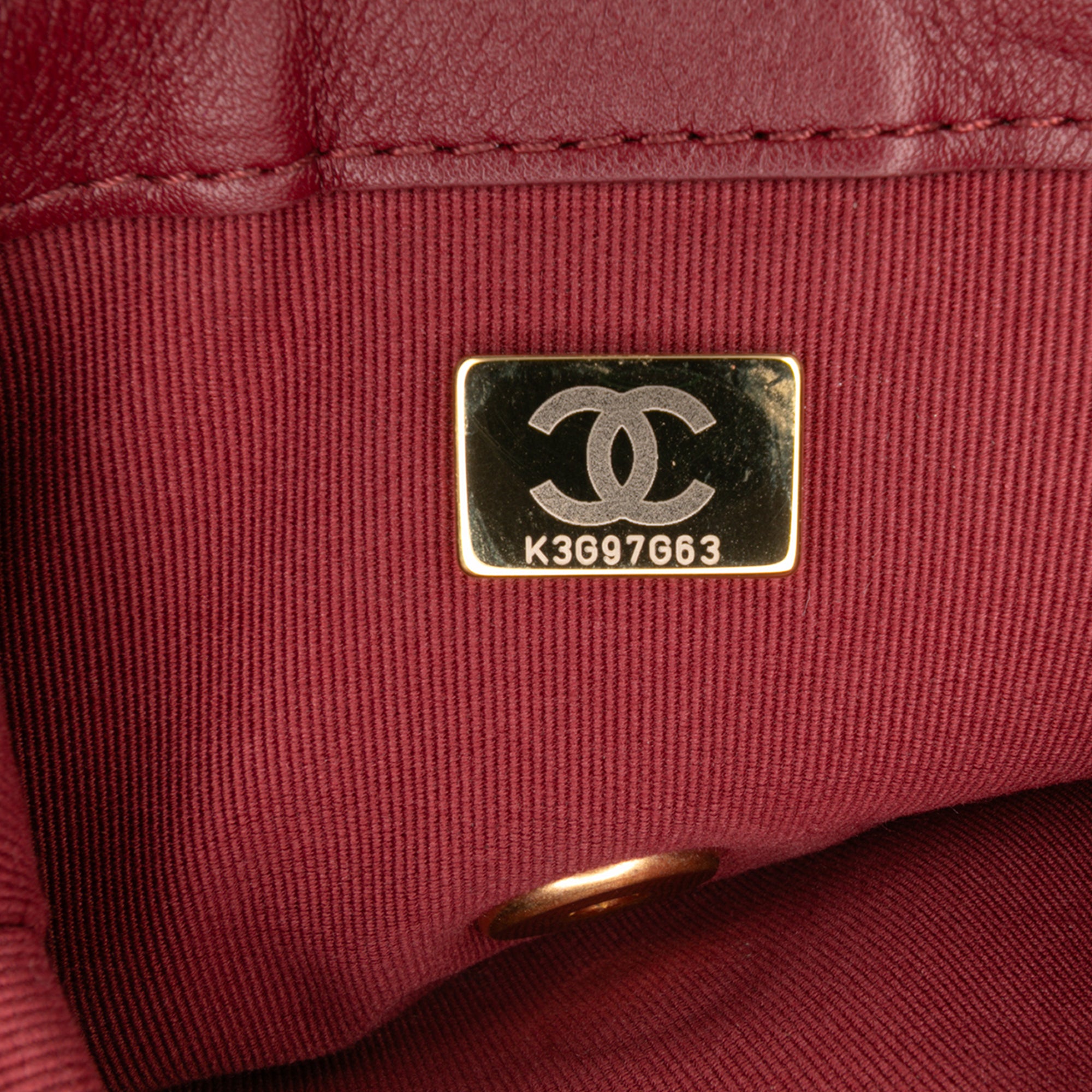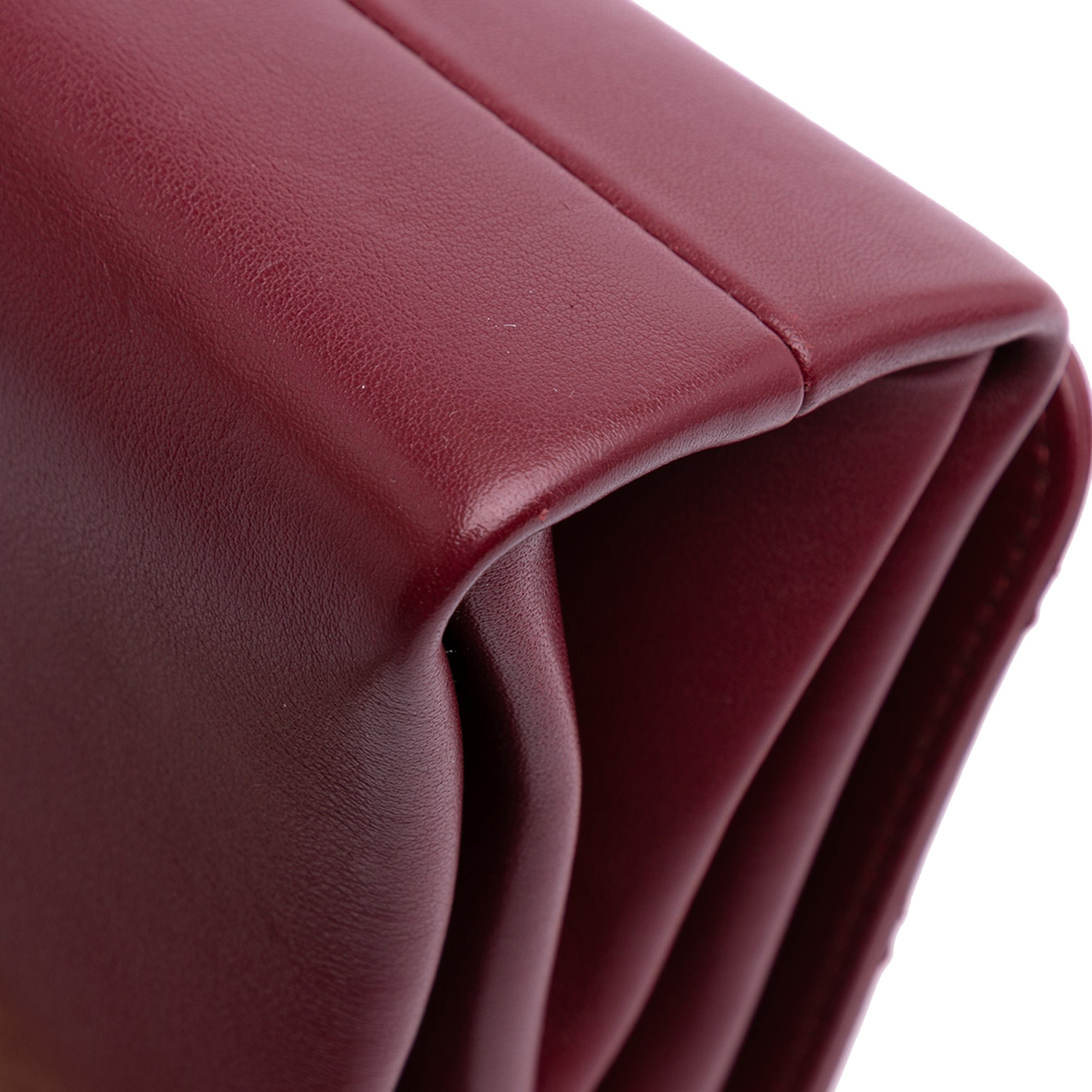 This satchel features a quilted calfskin leather body, a chain link top handle with faux pearl details, a leather woven chain link strap with leather guard, a front flap with CC turn lock closure, and an exterior back slip pocket. Retail Price: 4800.00