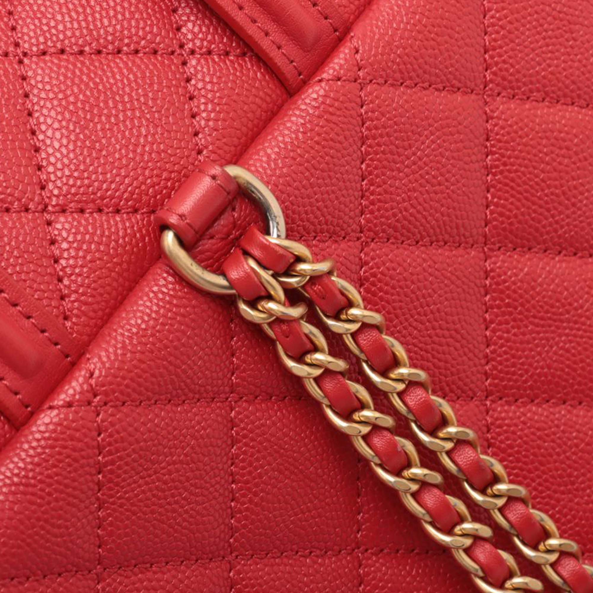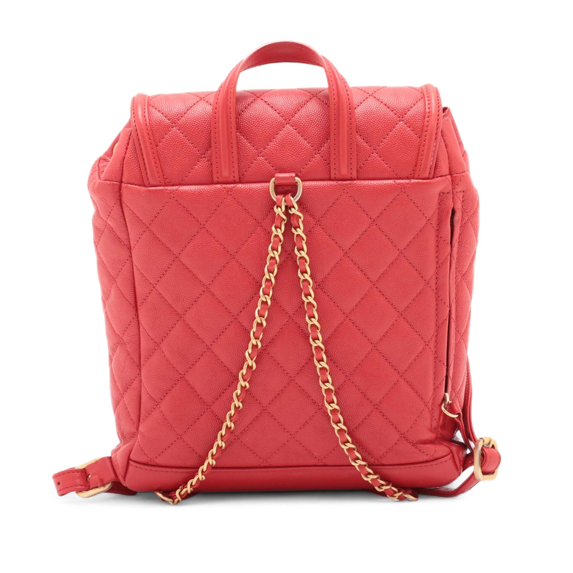 This backpack features a quilted caviar leather body, a flat leather top handle, leather woven chain back straps, a front flap, a top drawstring closure, and an interior zip pocket. Inclusion: authenticity card. Retail Price: 4400.00