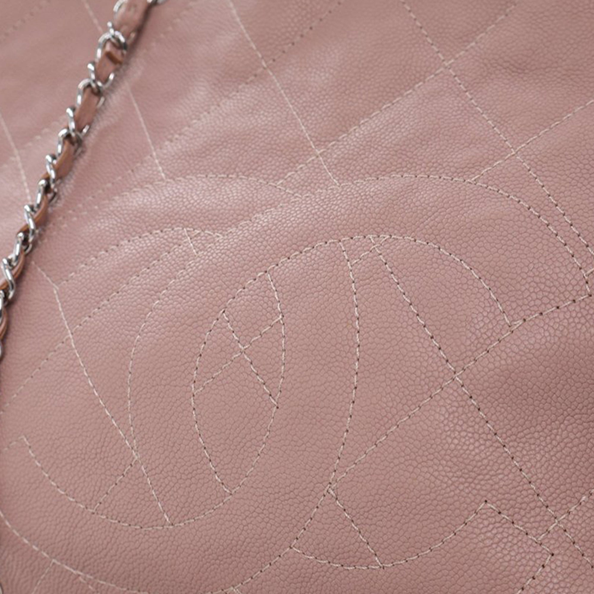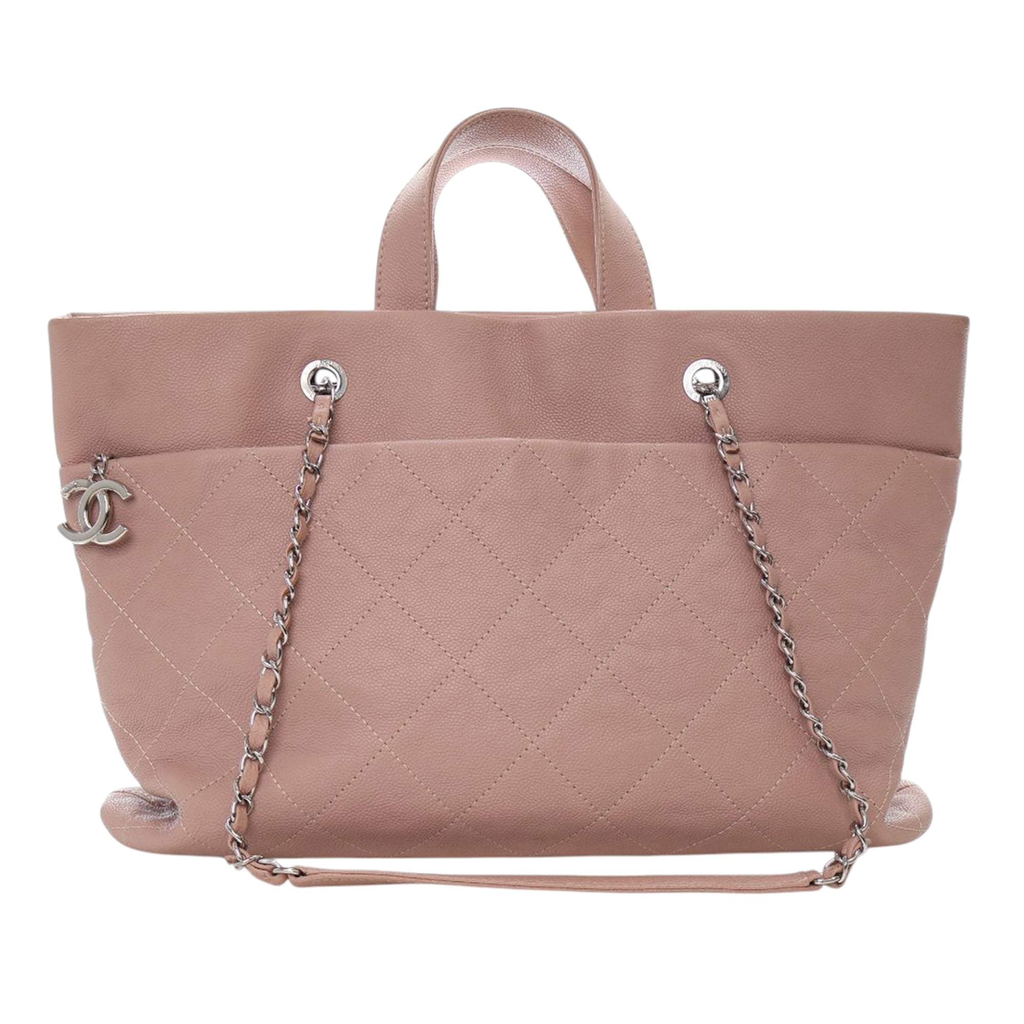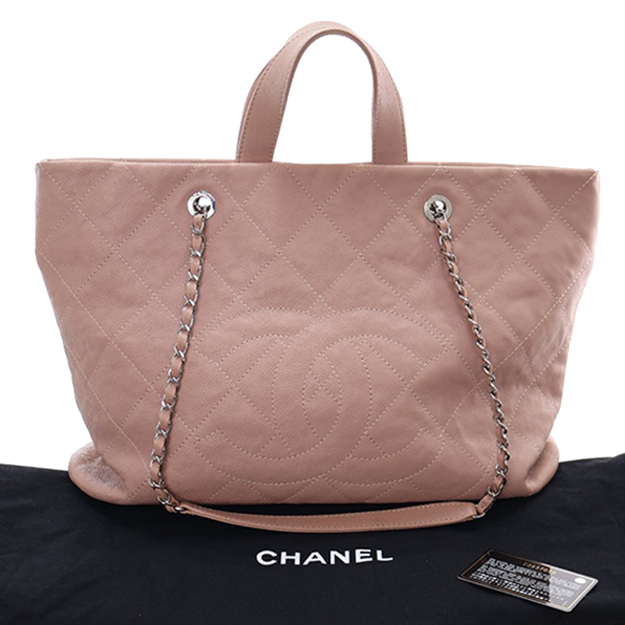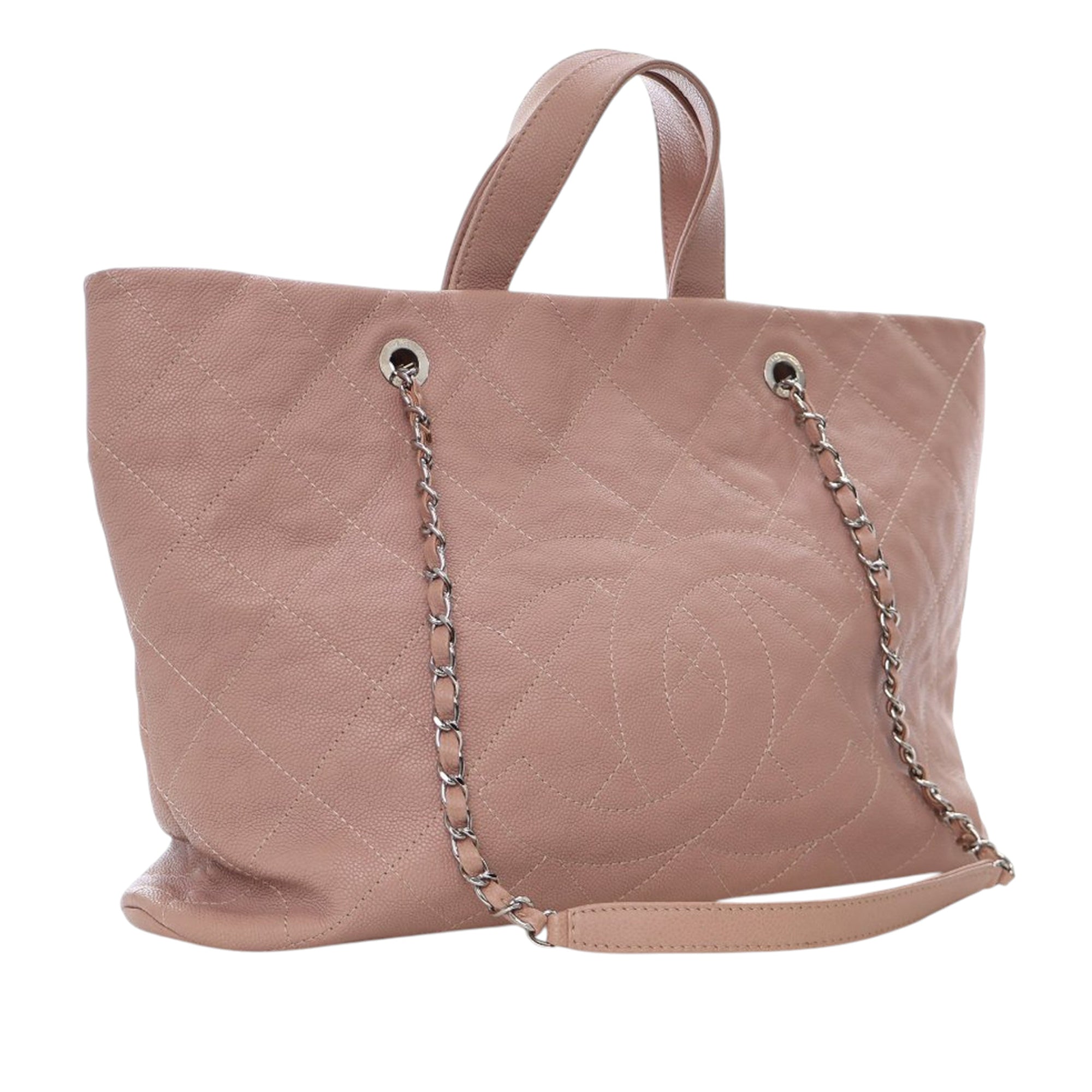 This satchel features a quilted caviar leather body, flat leather handles, leather woven chain straps with leather guards, an open top with magnetic closure, and interior zip and slip pockets. Inclusion: Dust bag, authenticity card. Retail Price: 5500.00