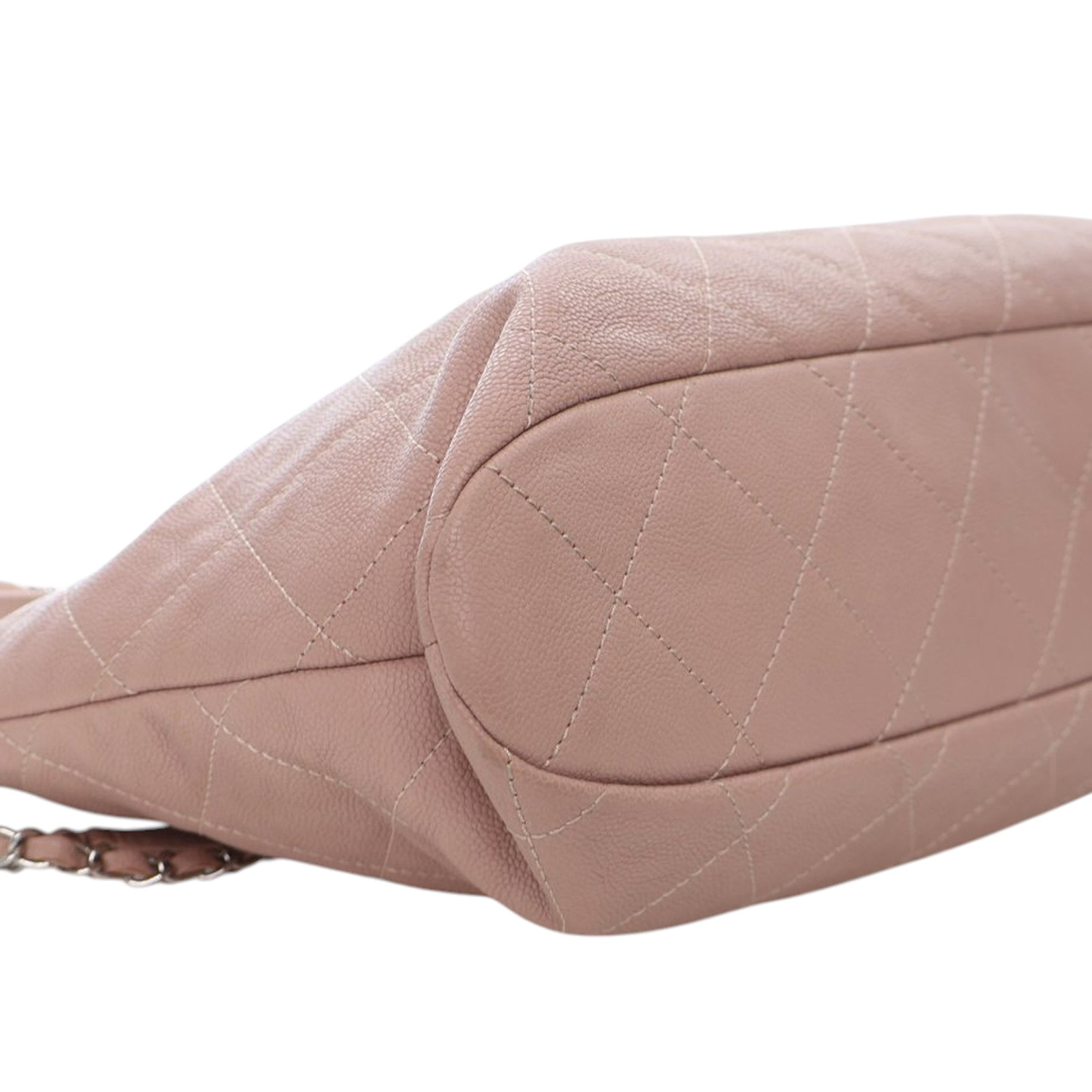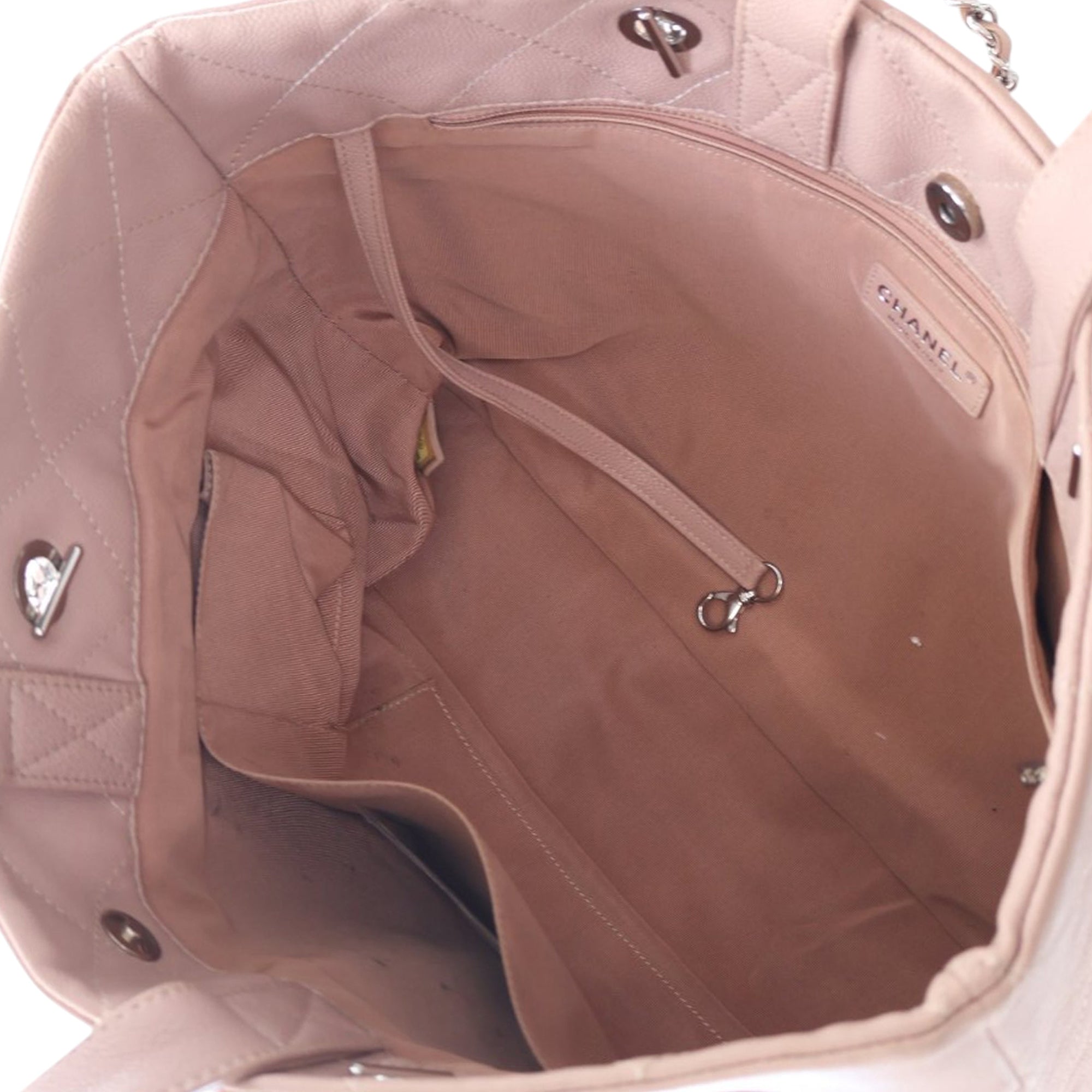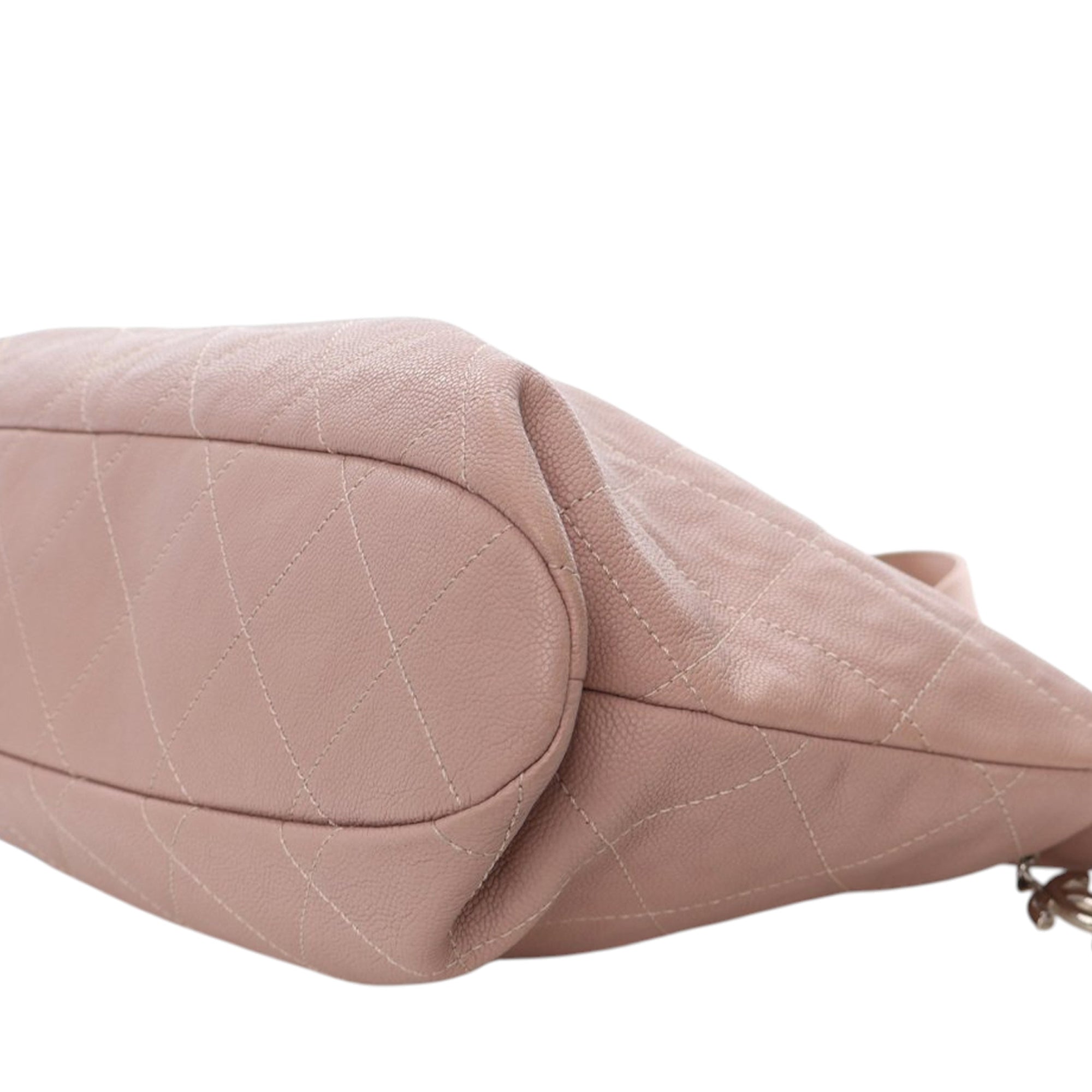 This satchel features a quilted caviar leather body, flat leather handles, leather woven chain straps with leather guards, an open top with magnetic closure, and interior zip and slip pockets. Inclusion: Dust bag, authenticity card. Retail Price: 5500.00