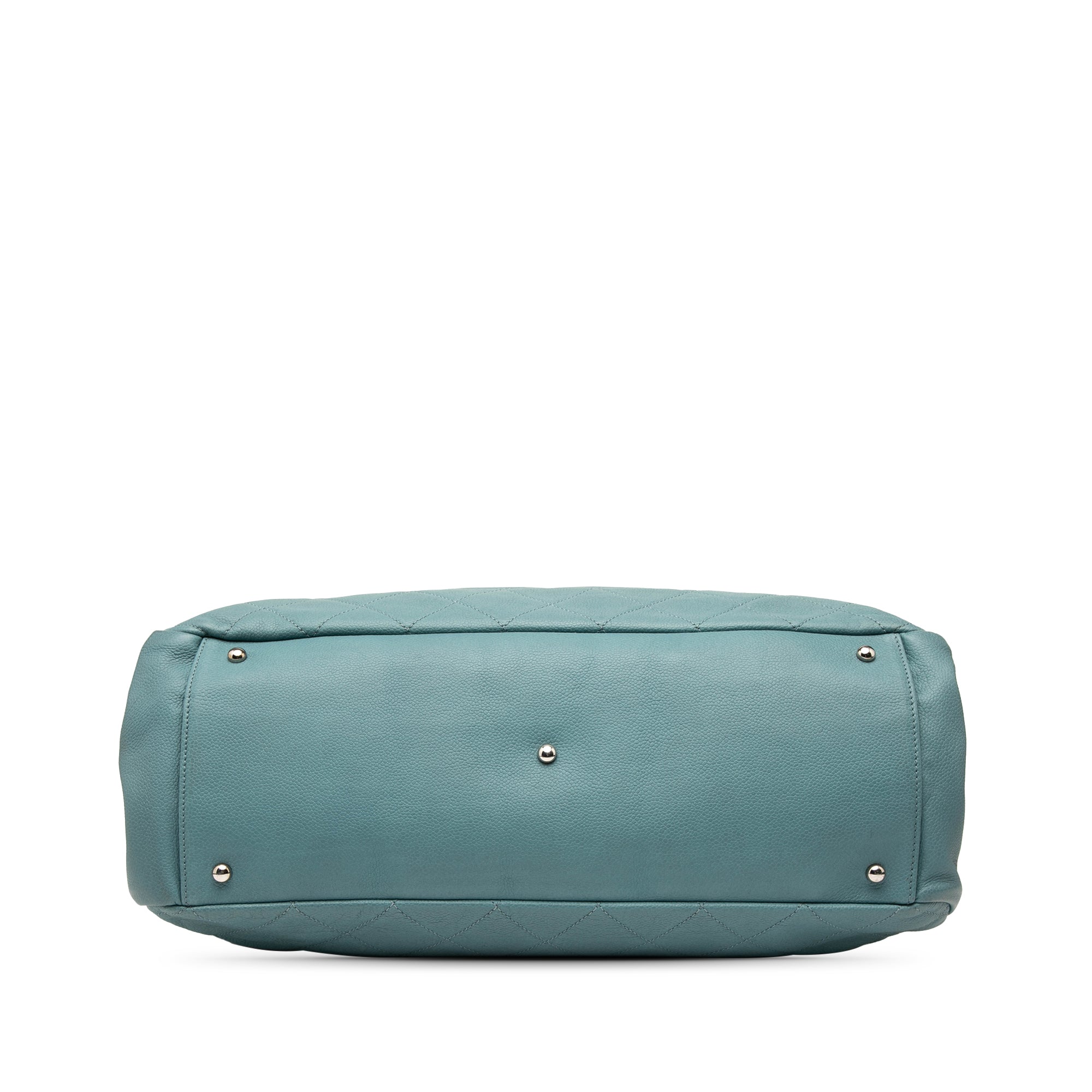 This tote bag features a quilted caviar leather body, leather woven chain straps with leather shoulder guards, an open top, an interior center zip compartment, and interior zip and slip pockets. Inclusion: authenticity card. Retail Price: 2750.00