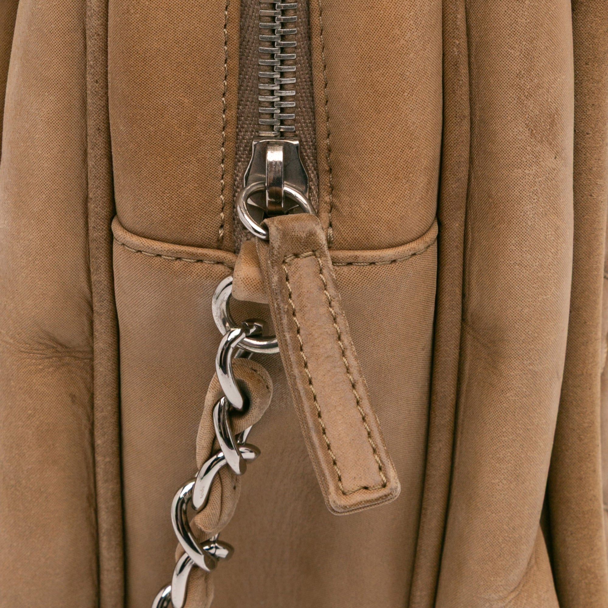 This satchel features a quilted calfskin body, flat leather handles, a leather woven chain strap with leather guard, a top zip closure, exterior slip pockets, and interior zip and slip pockets. Retail Price: 5300.00