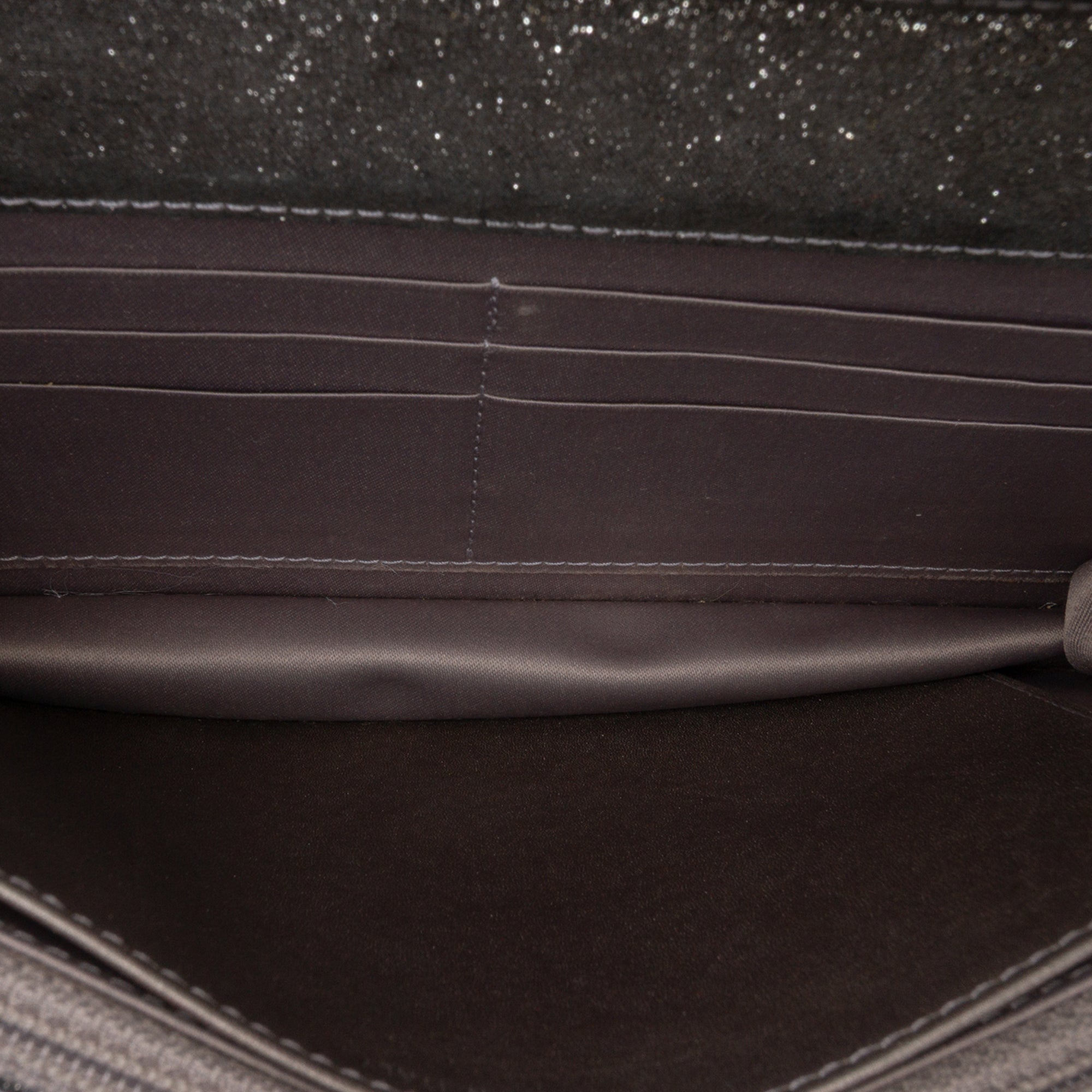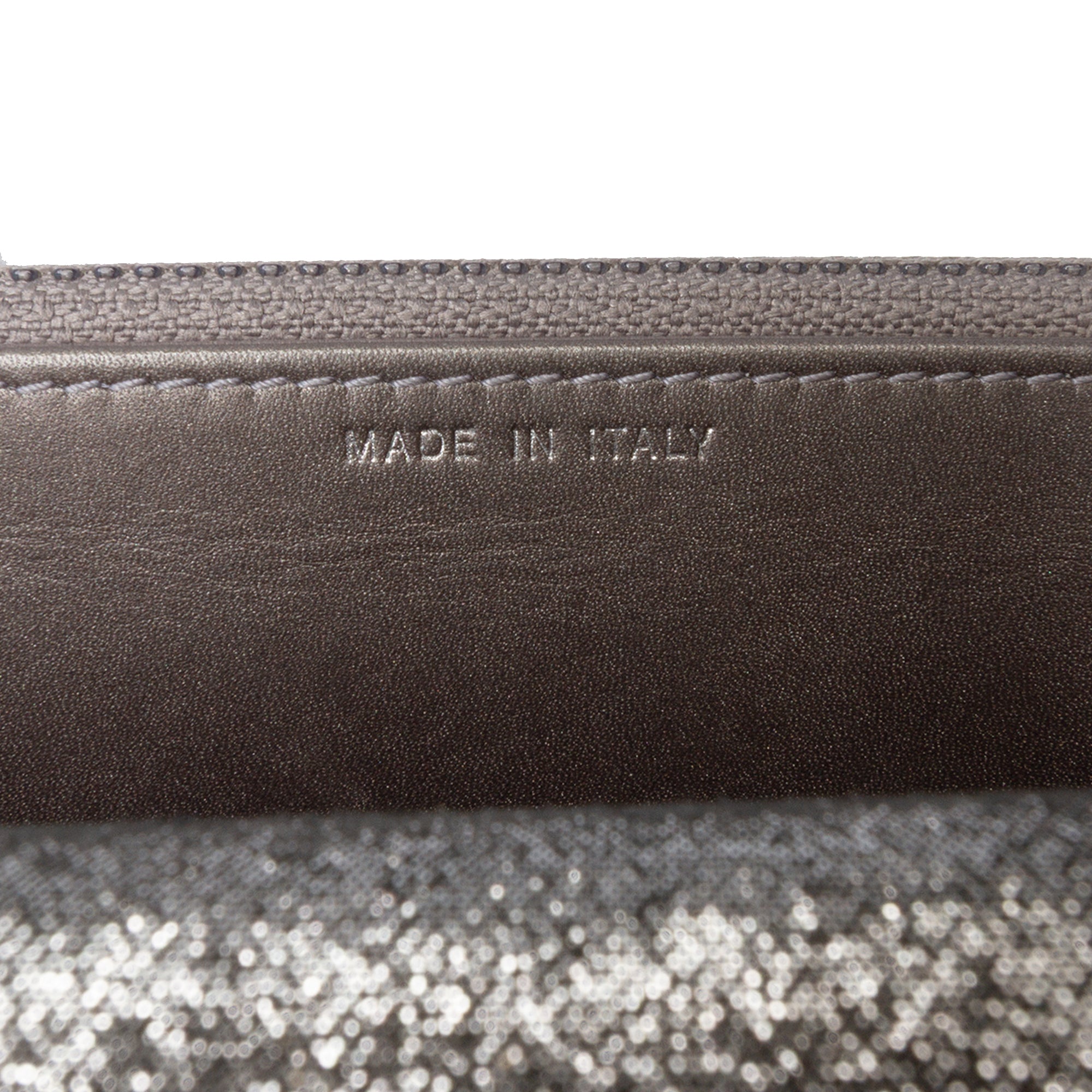 This wallet on chain features a quilted iridescent lambskin body, a leather-woven chain link strap, a front flap with snap closure, and interior zip and slip pockets. Retail Price: 3350.00