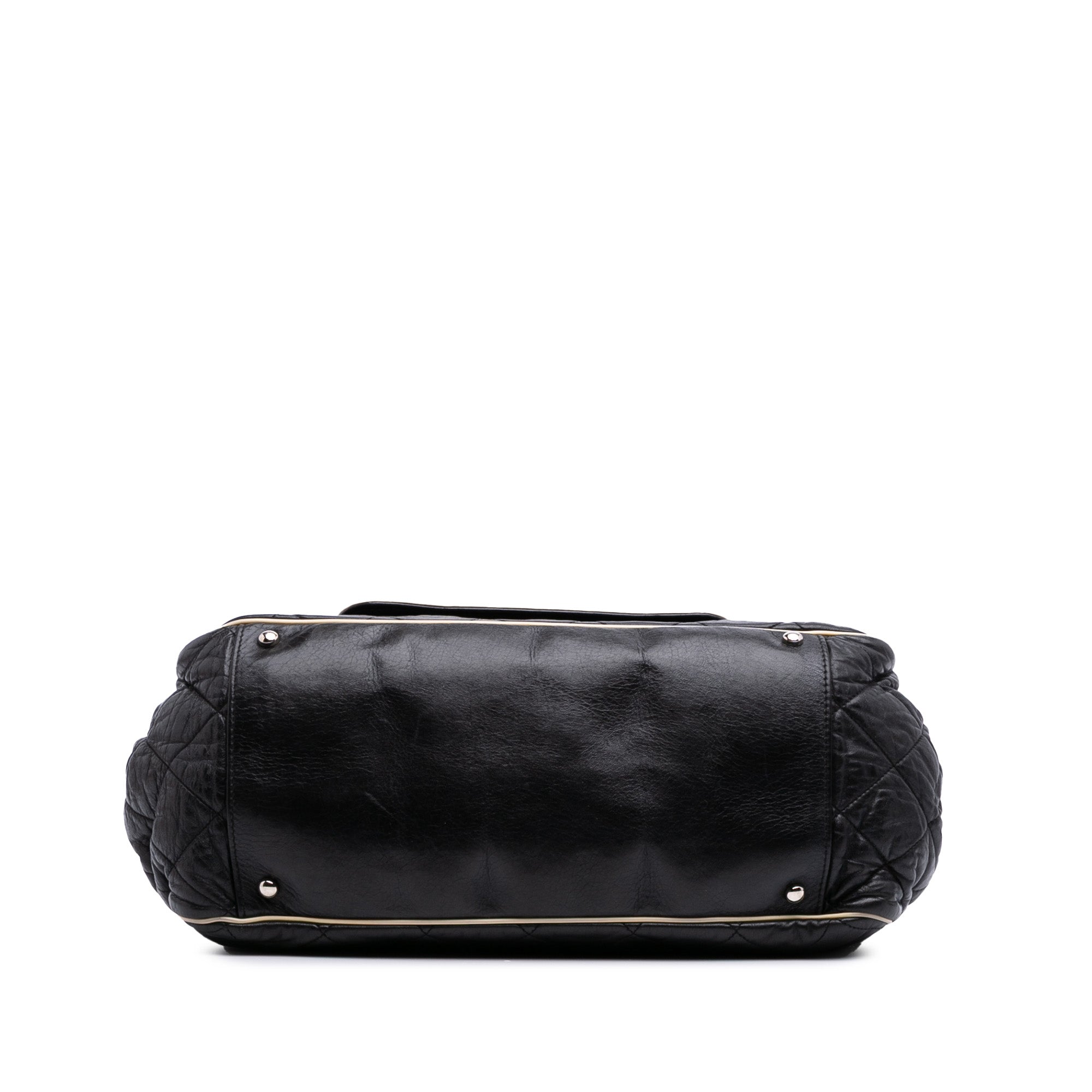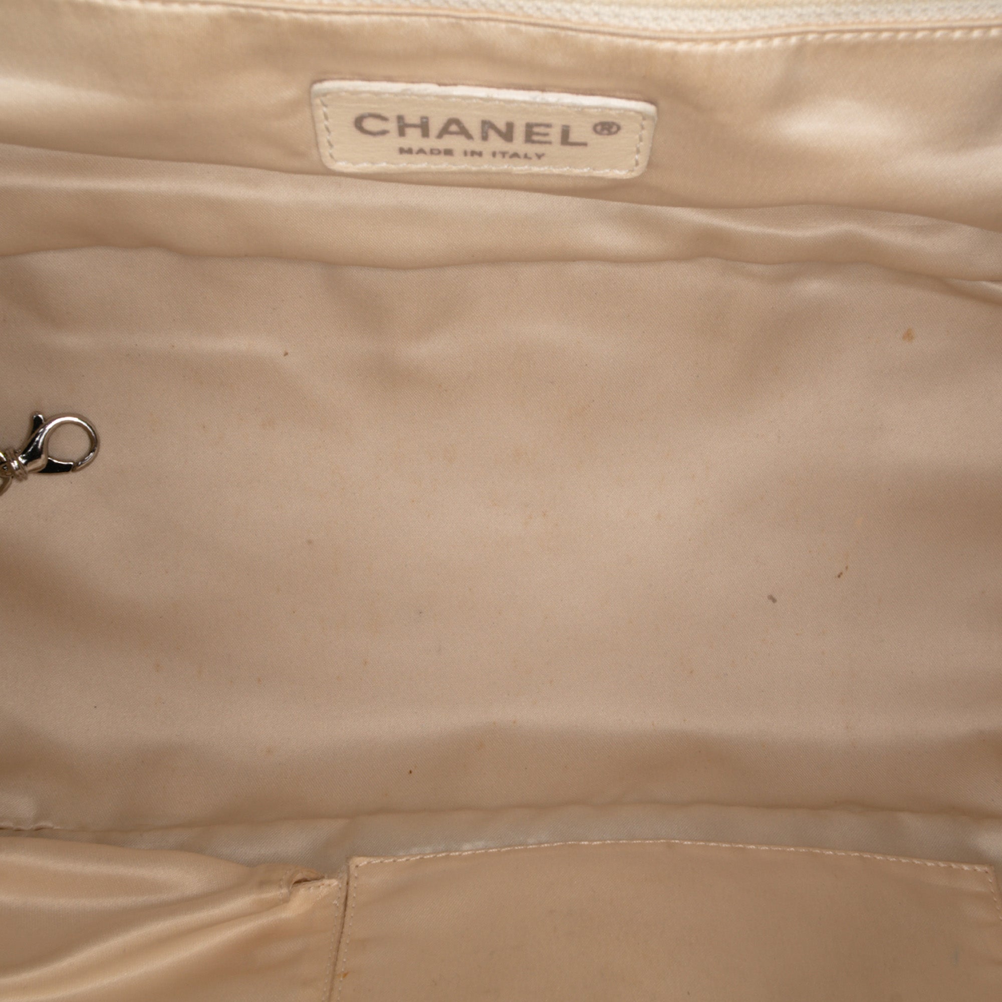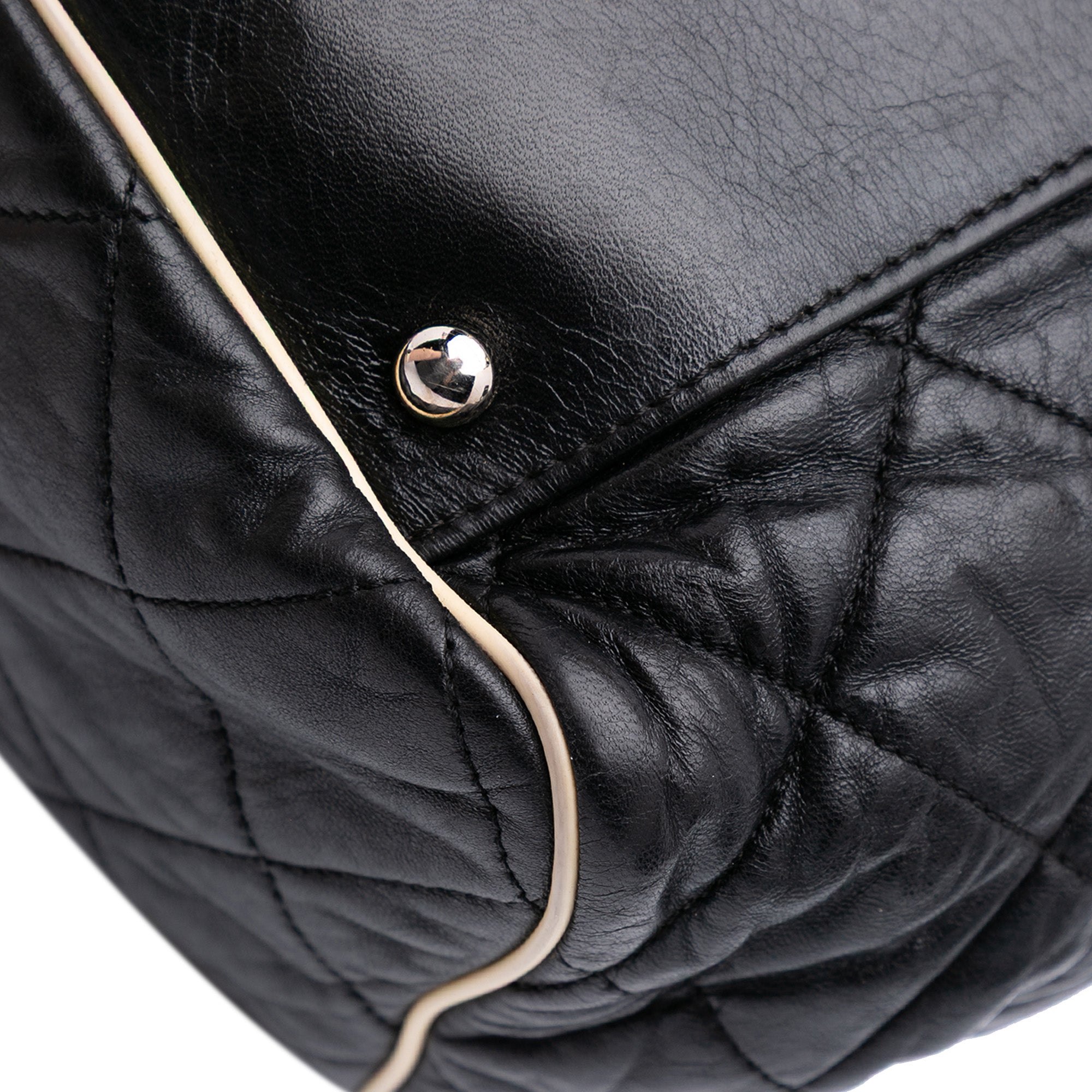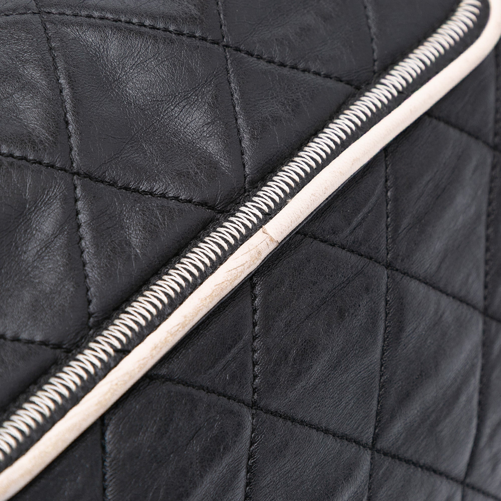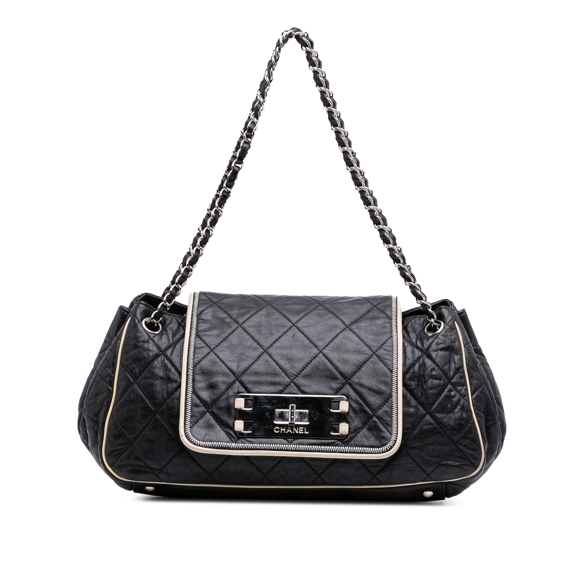This flap features a quilted leather body with zipper details, silver-tone shoulder chains, a front flap with a twist lock closure, and interior zip and slip pockets. Retail Price: 2675.00