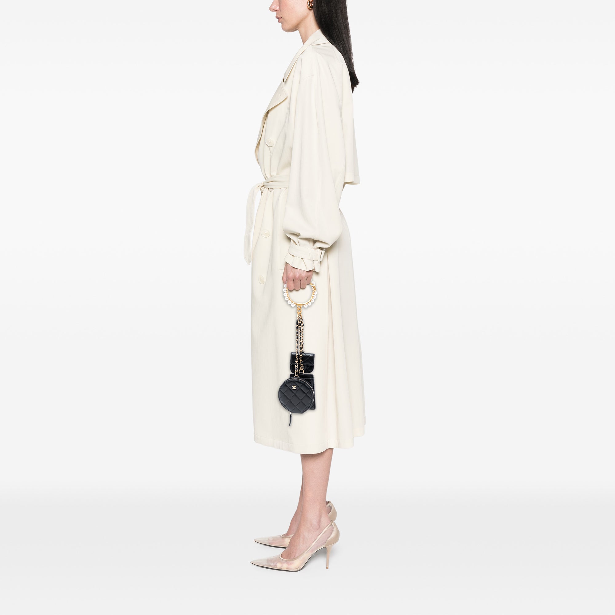 These pouches feature quilted lambskin leather bodies, a metal handle with faux pearl details, a flap closure for one pouch, and card slots for the card holder. Retail Price: 4500.00