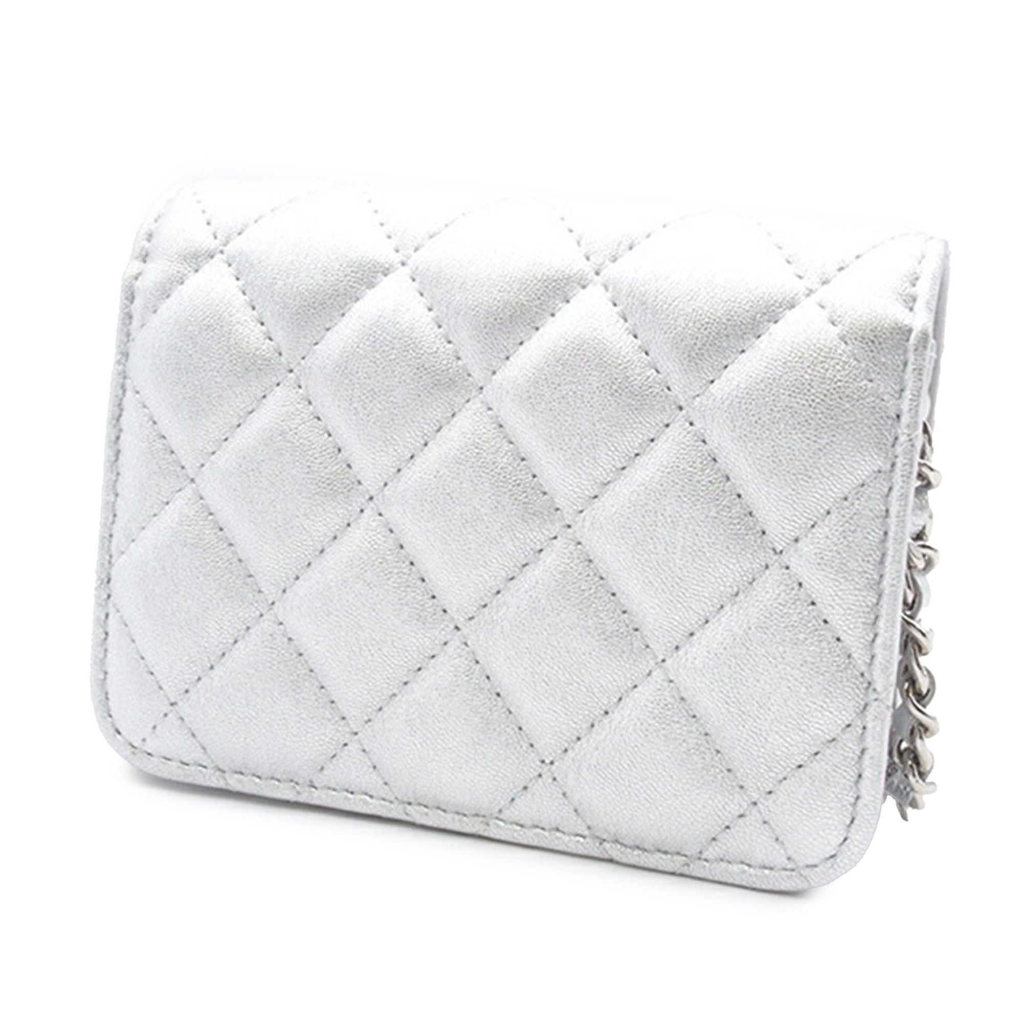 This shoulder bag features a quilted metallic lambskin leather body, a leather woven chain waist strap, and a front flap with magnetic snap closure. Retail Price: 1928.00