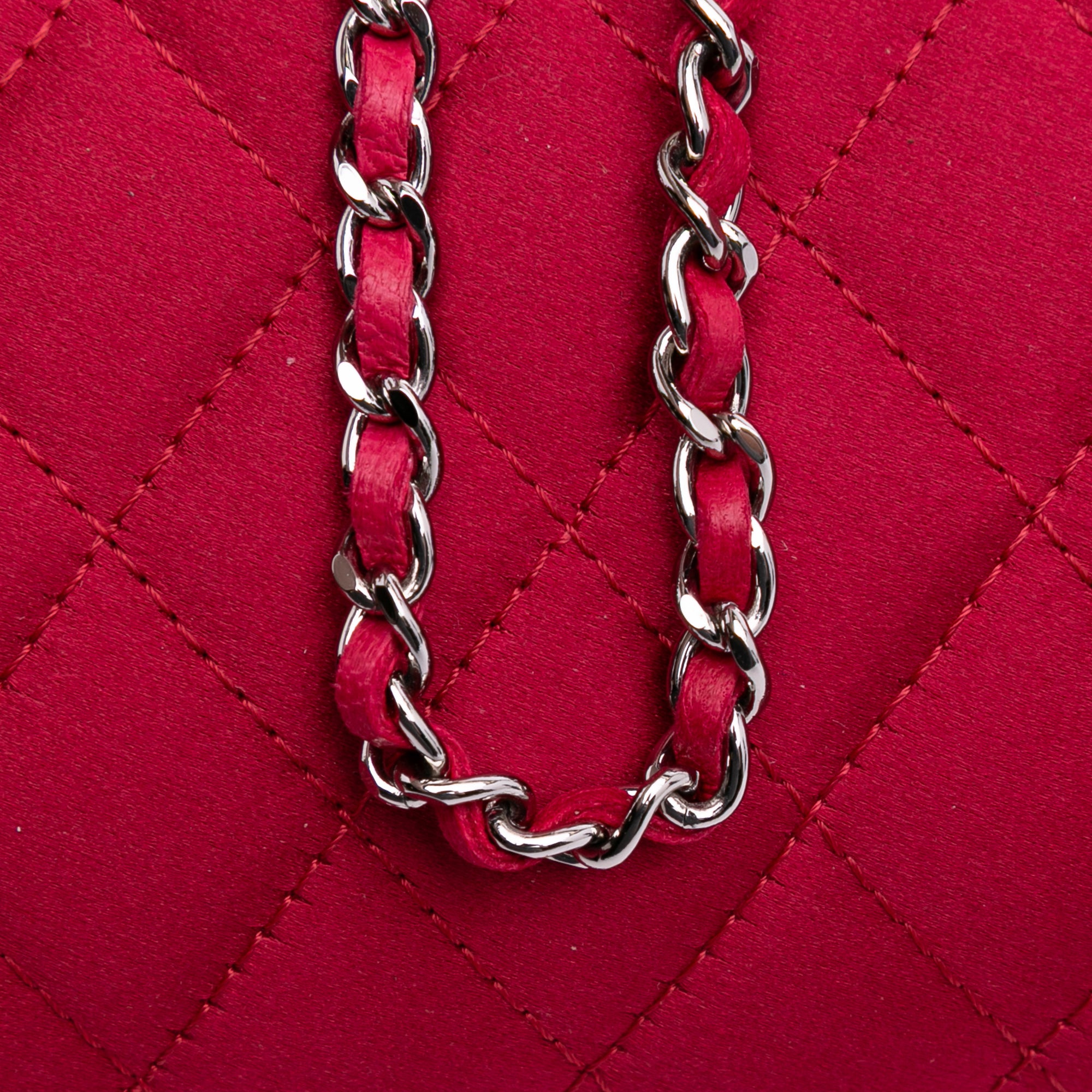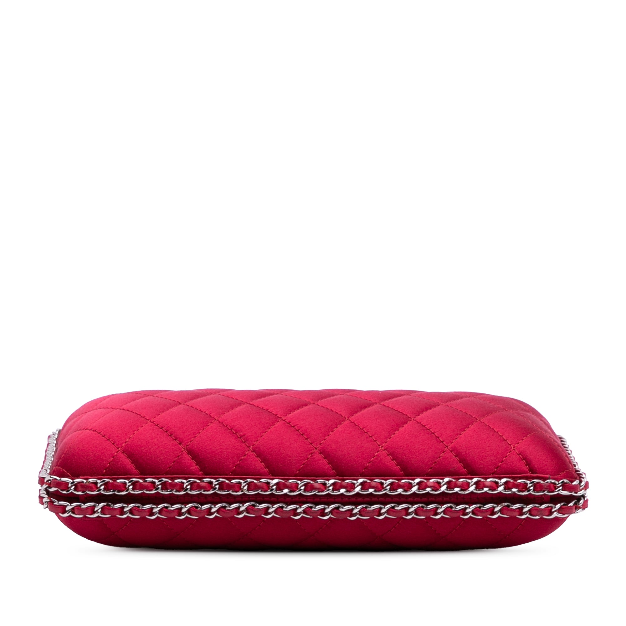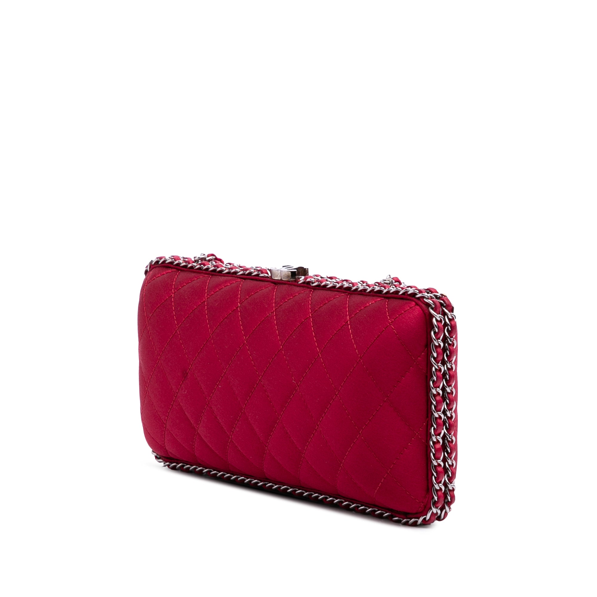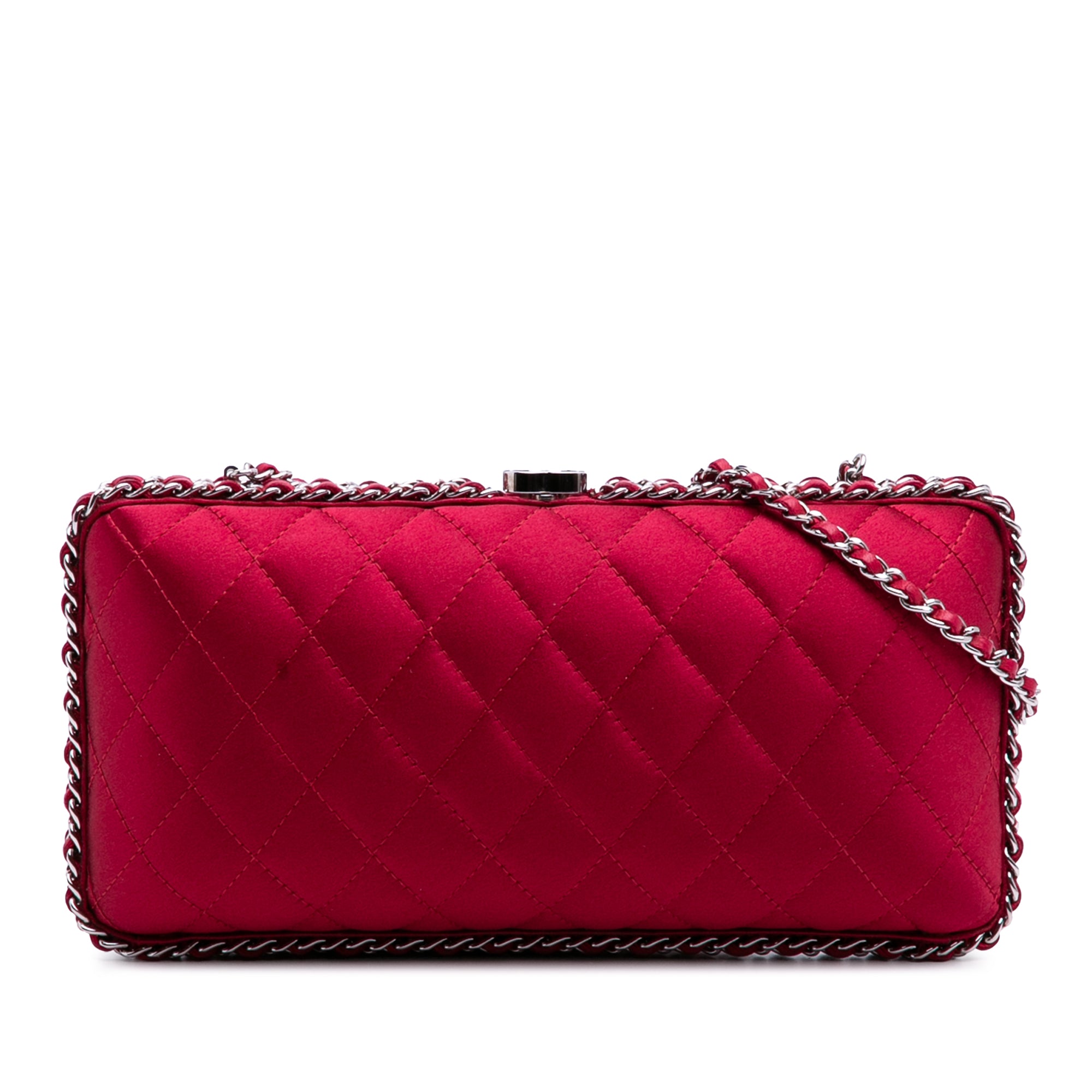 This crossbody bag features a quilted satin body with leather woven chain detail, a detachable leather woven chain link strap, a CC kiss lock closure, and an interior slip pocket. Retail Price: 2200.00