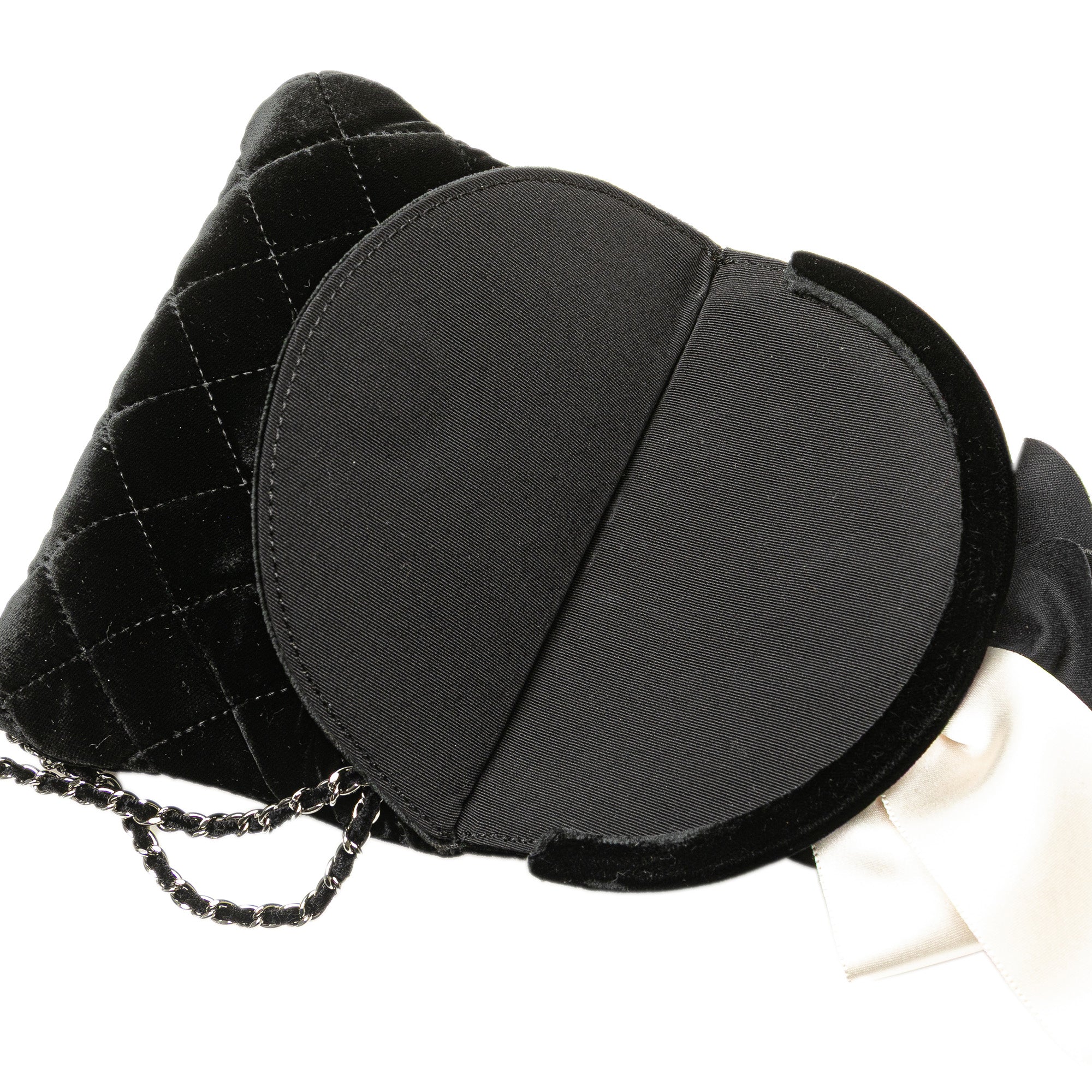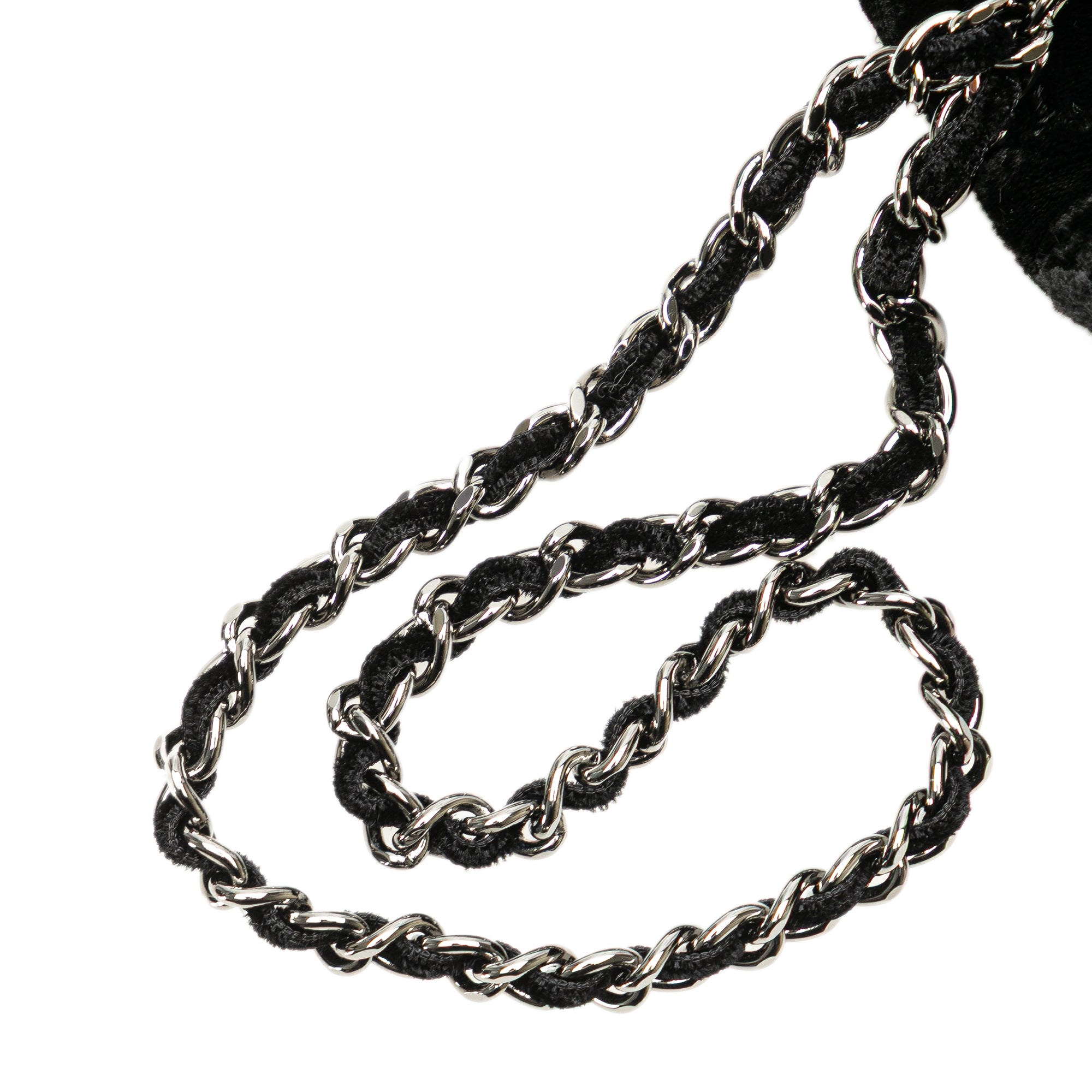 This clutch bag features a quilted velvet body with flower and satin ribbon embellishment, a chain link wrist strap, a front flap closure, and interior slip pockets. Inclusion: Dust bag, box, authenticity card. Retail Price: 3550.00