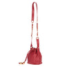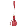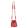 Red leather Chanel bucket bag with front classic embroidered CC. Leather shoulder strap with chain inserts, drawstring fastening and gold-tone metal hardware. Removable inner pouch. Authenticity card.