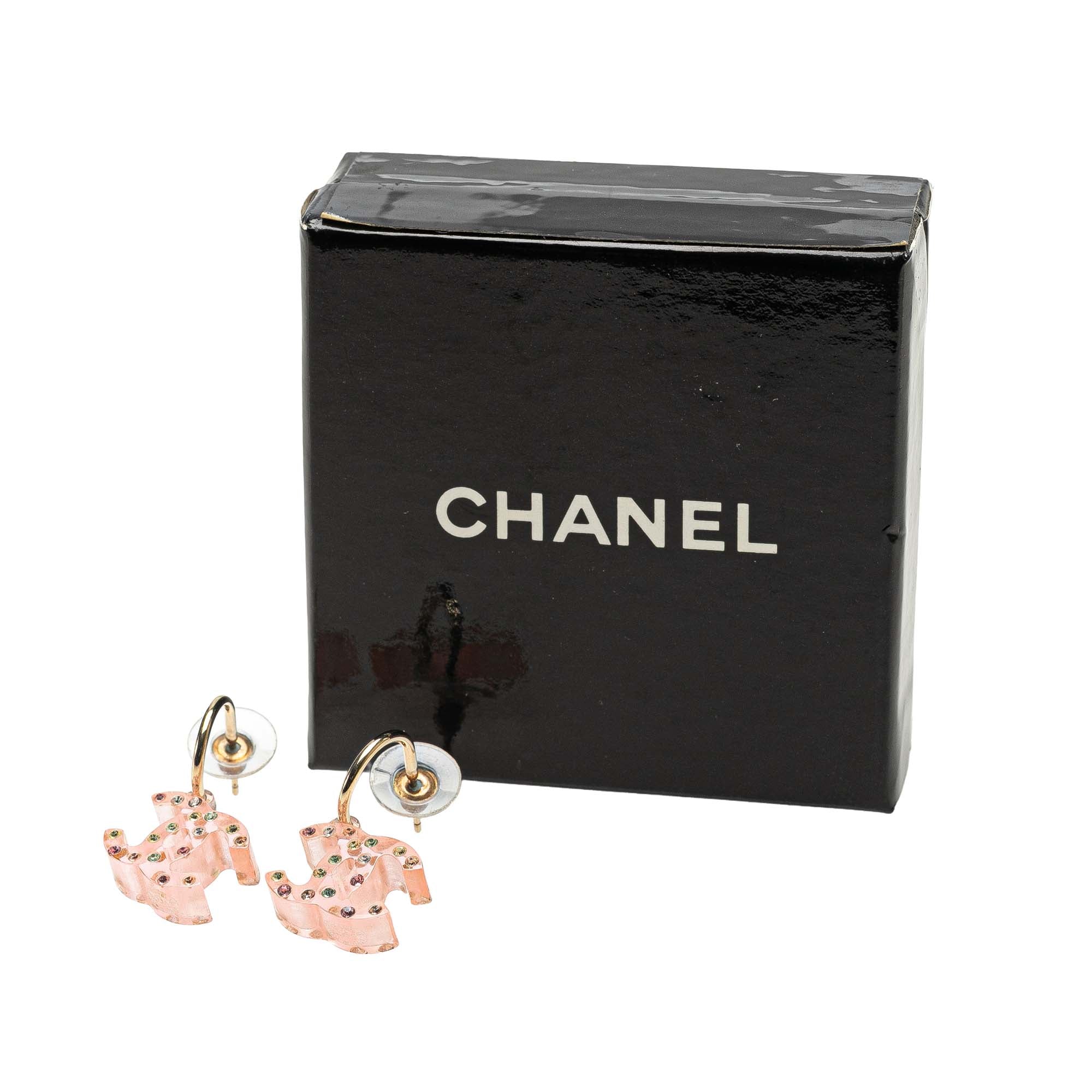 These earrings feature a gold tone body, resin CC with rhinestone details, and a push back closure. Inclusion: box. Retail Price: 650.00