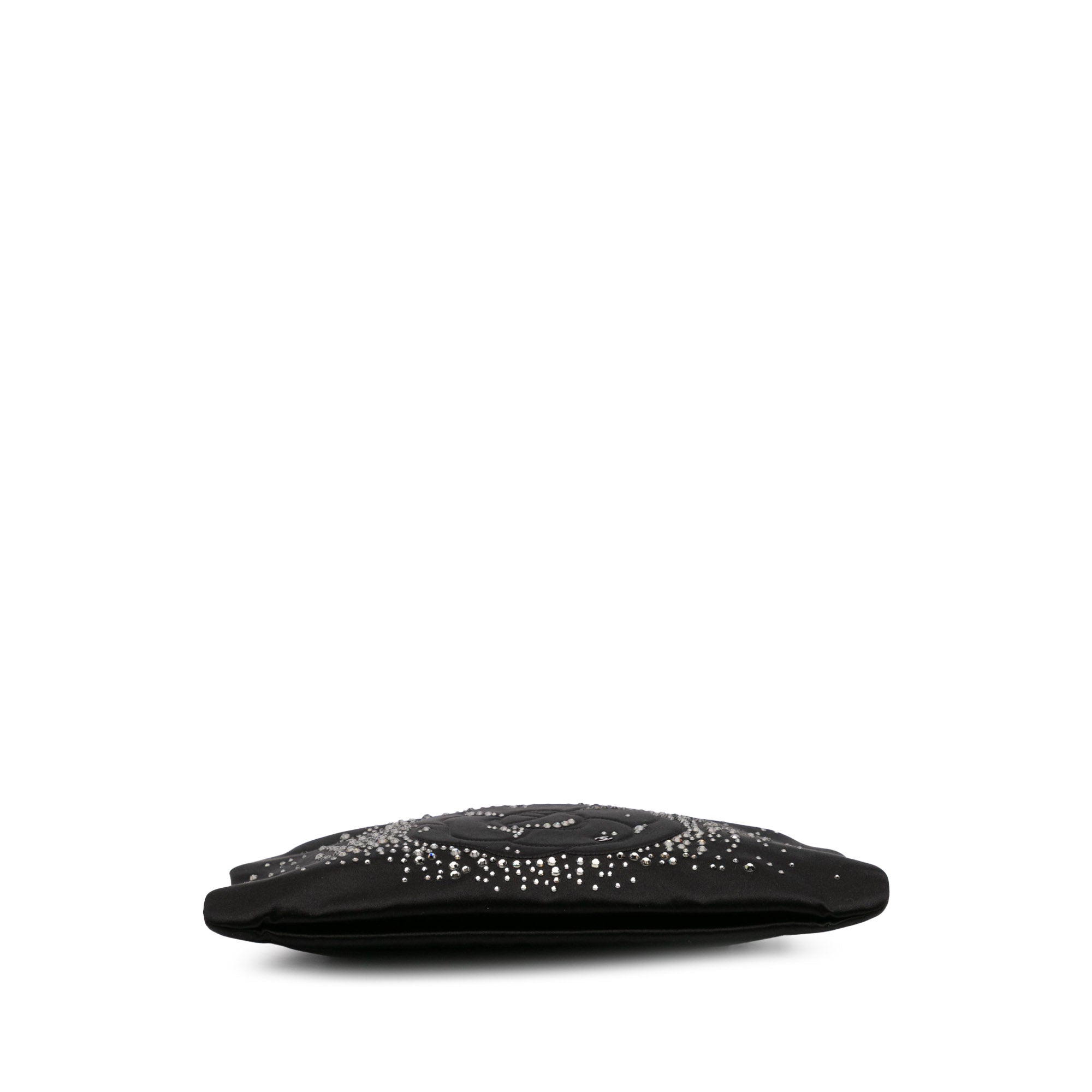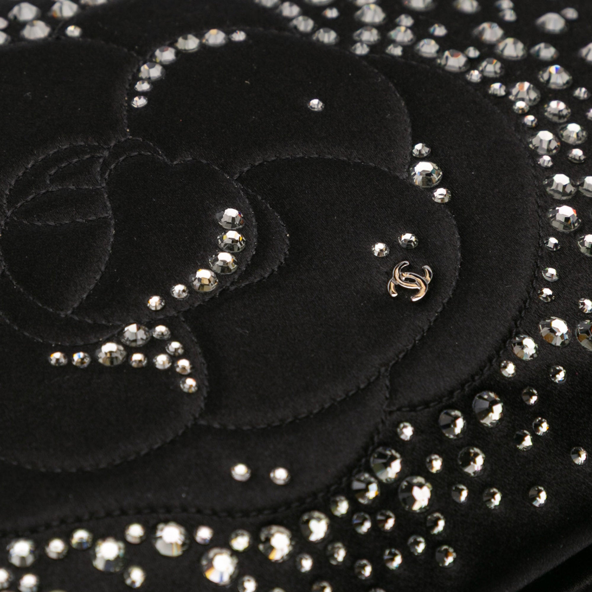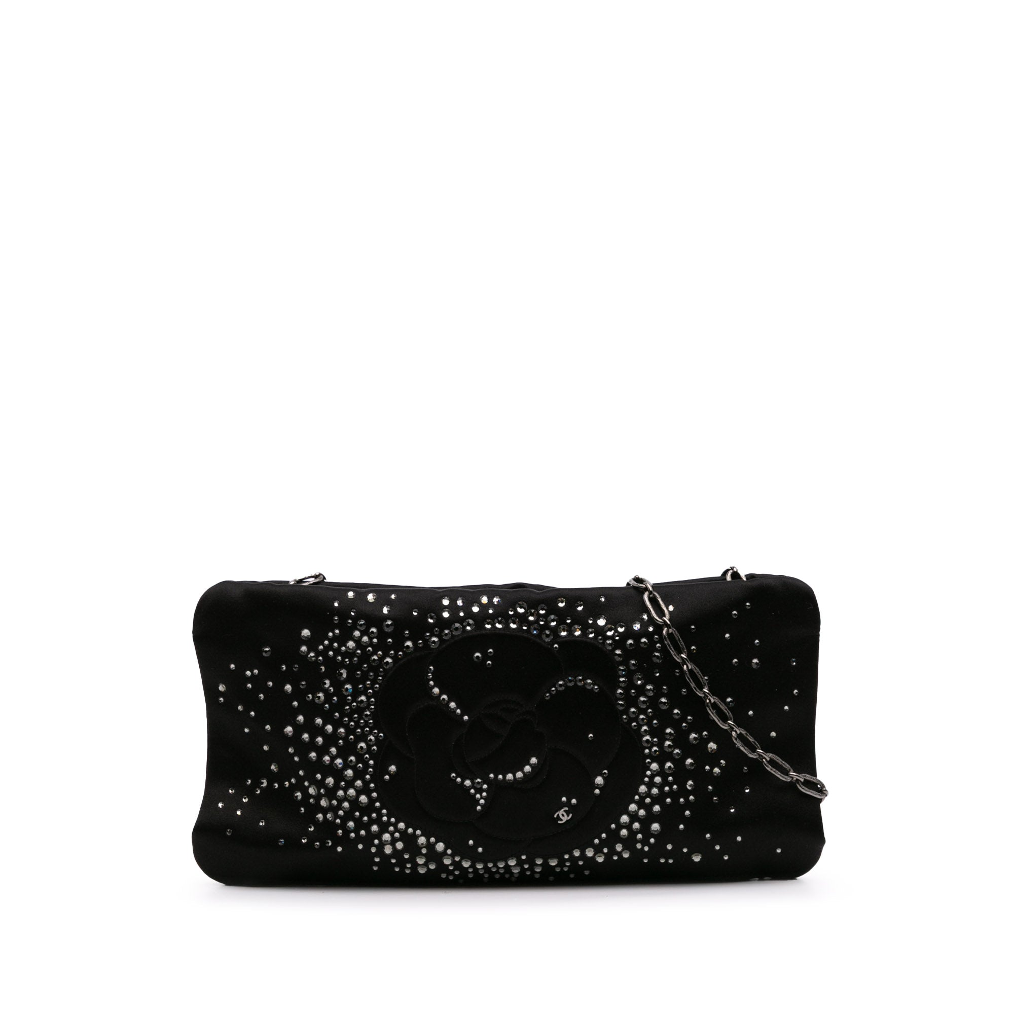 This shoulder bag features a satin body with crystal embellishments, a chain link strap, a top zip closure, and an interior slip pocket. Retail Price: 1750.00