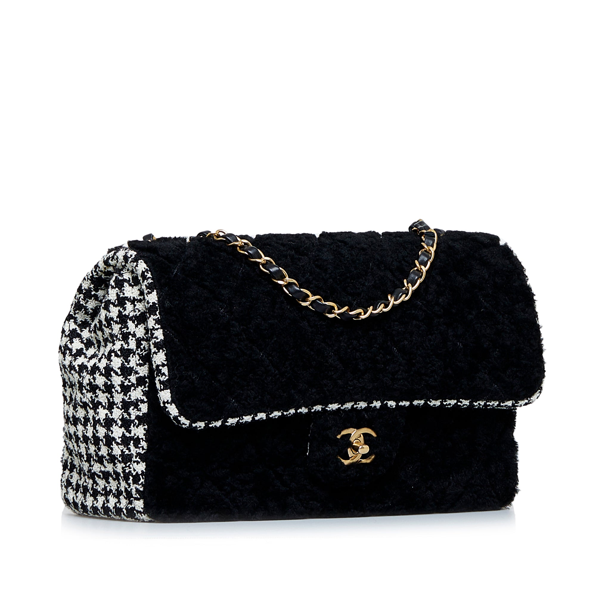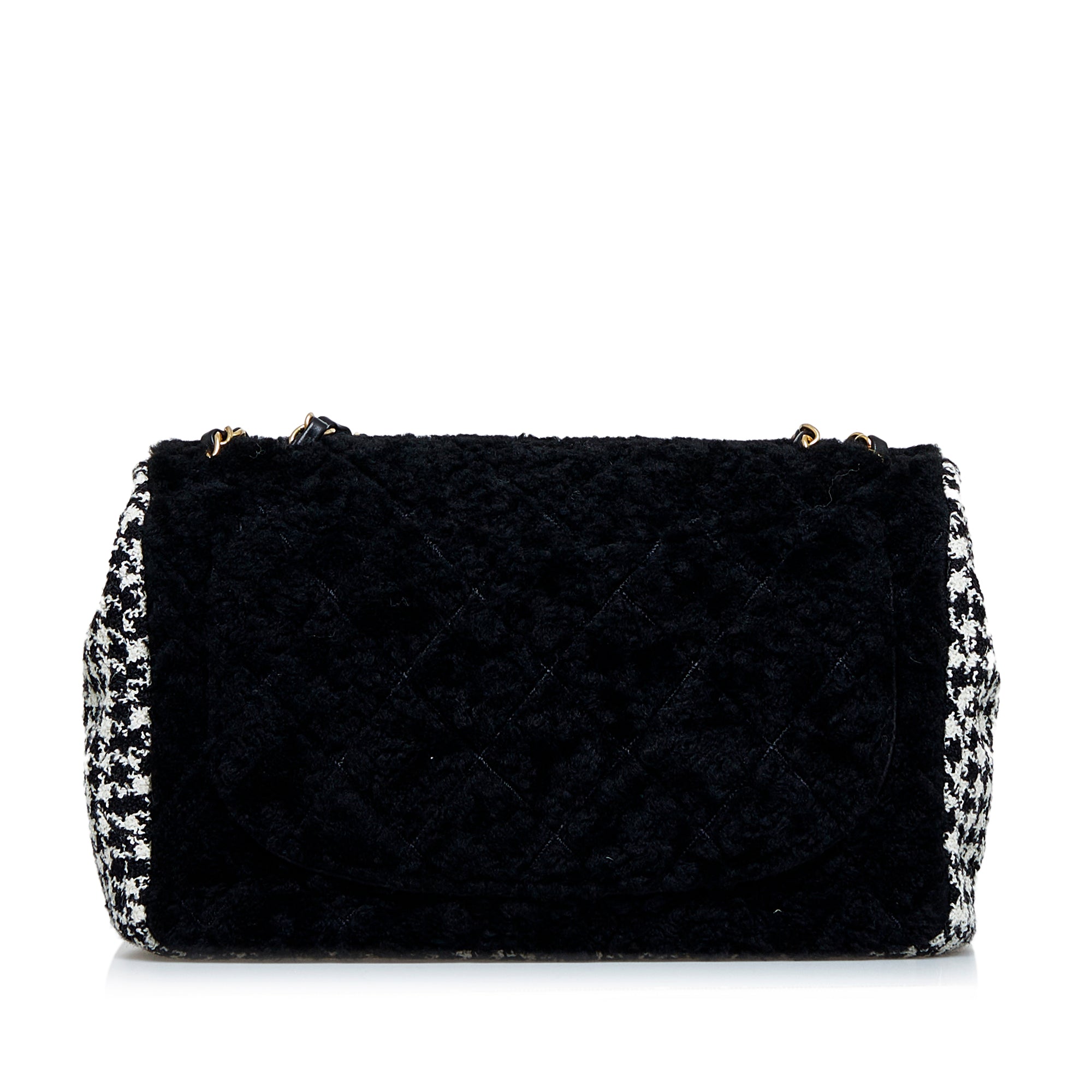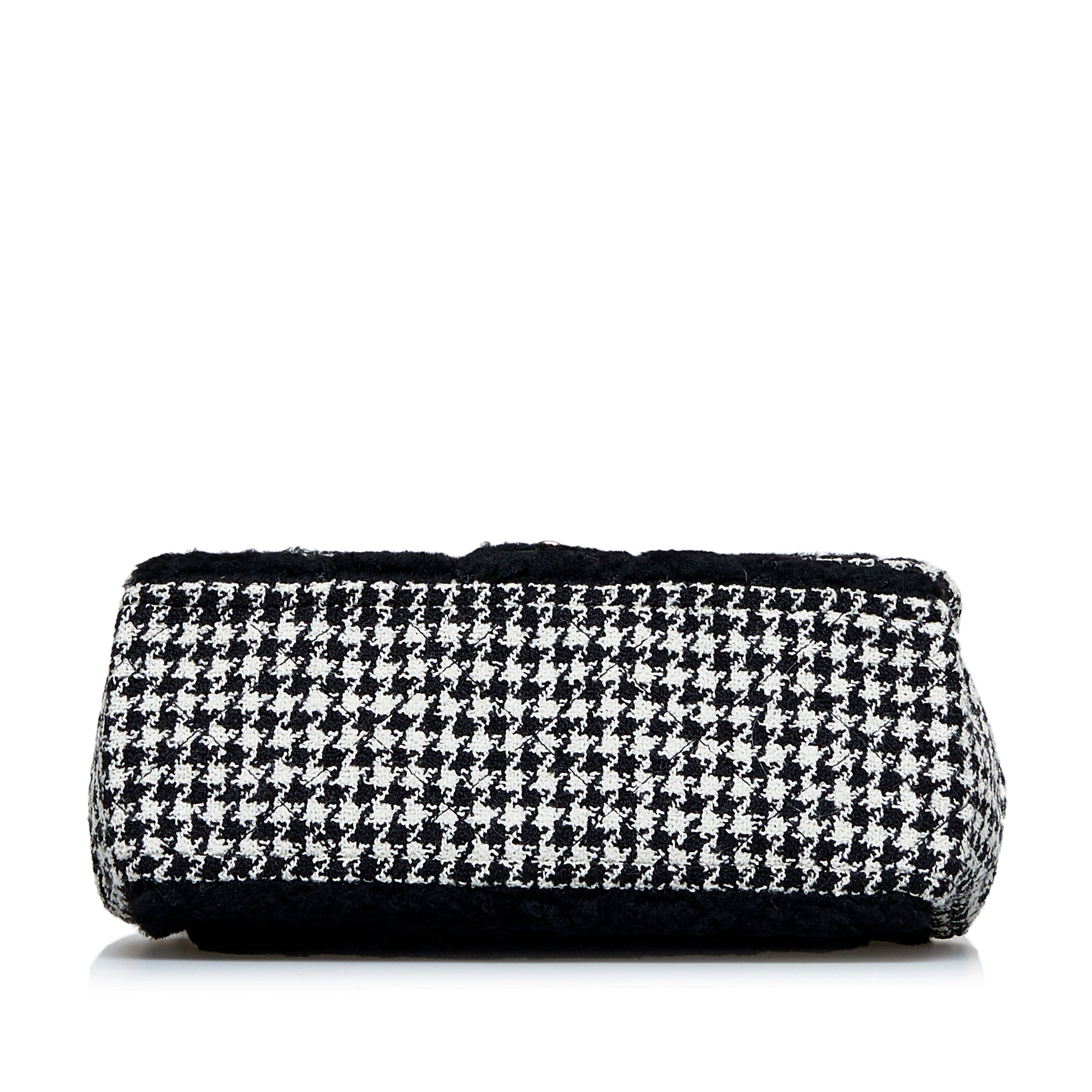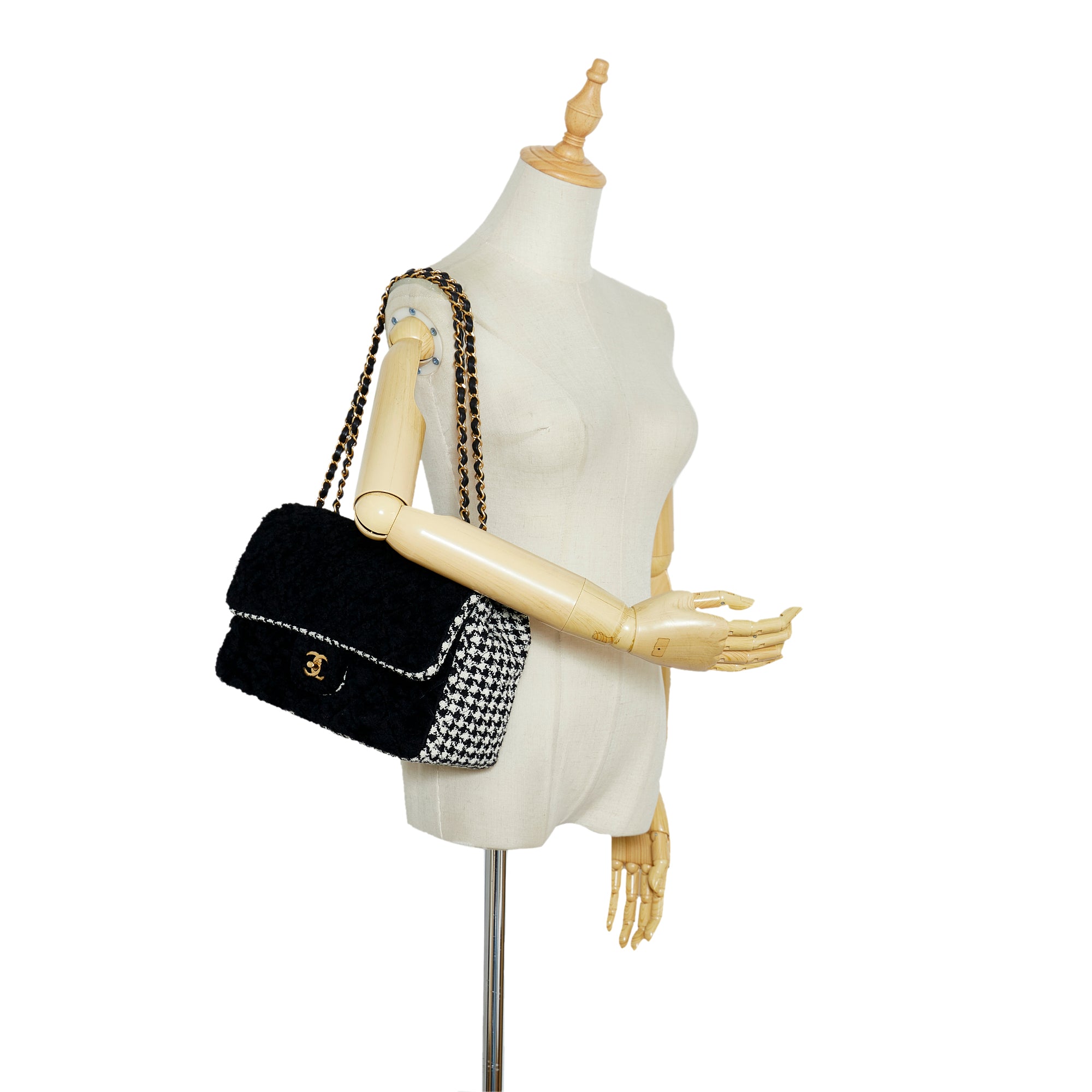 This flap bag features a shearling body with tweed, a leather woven chain strap, a front flap with CC turnlock closure, and an interior zip pocket. Inclusion: authenticity card. Retail Price: 8450.00