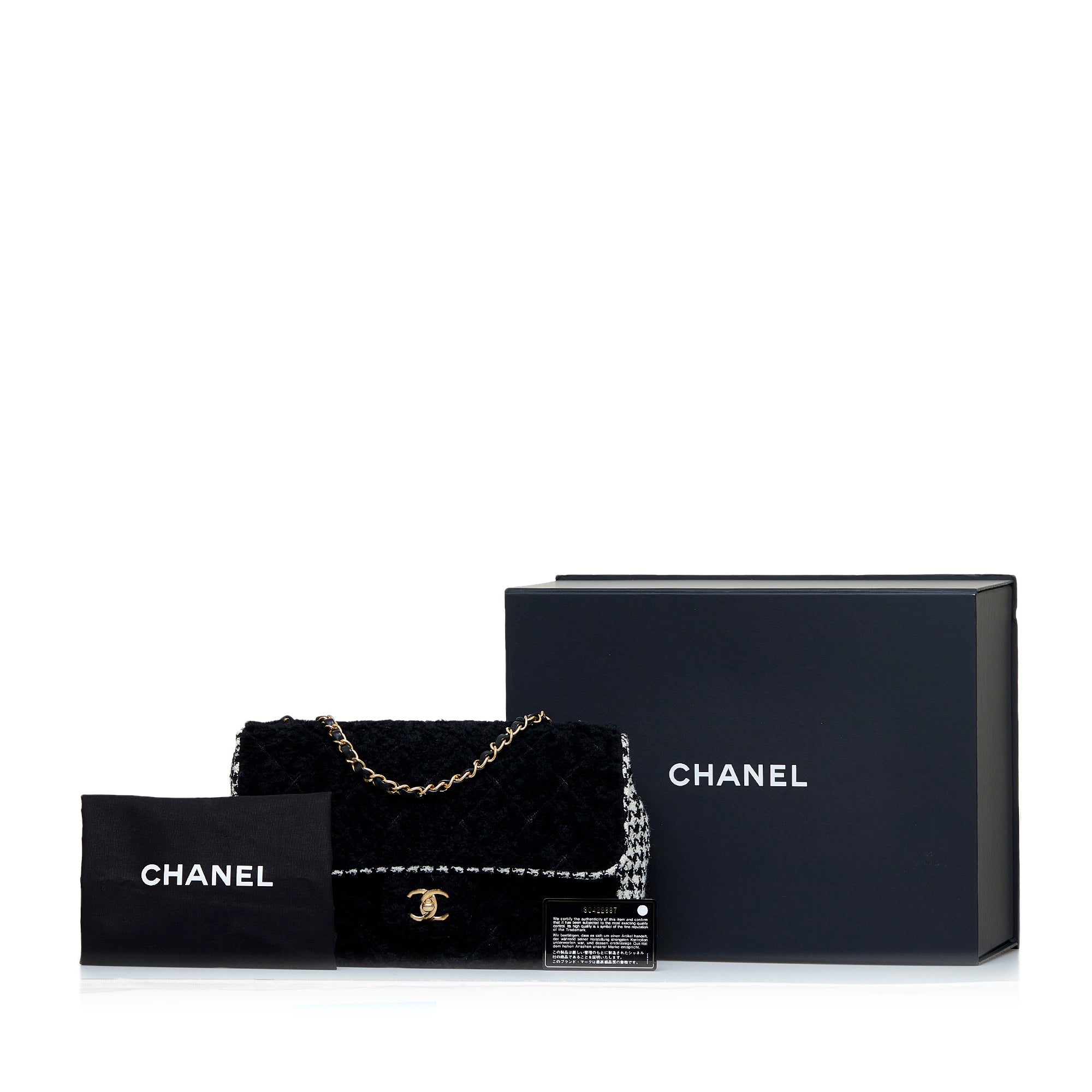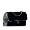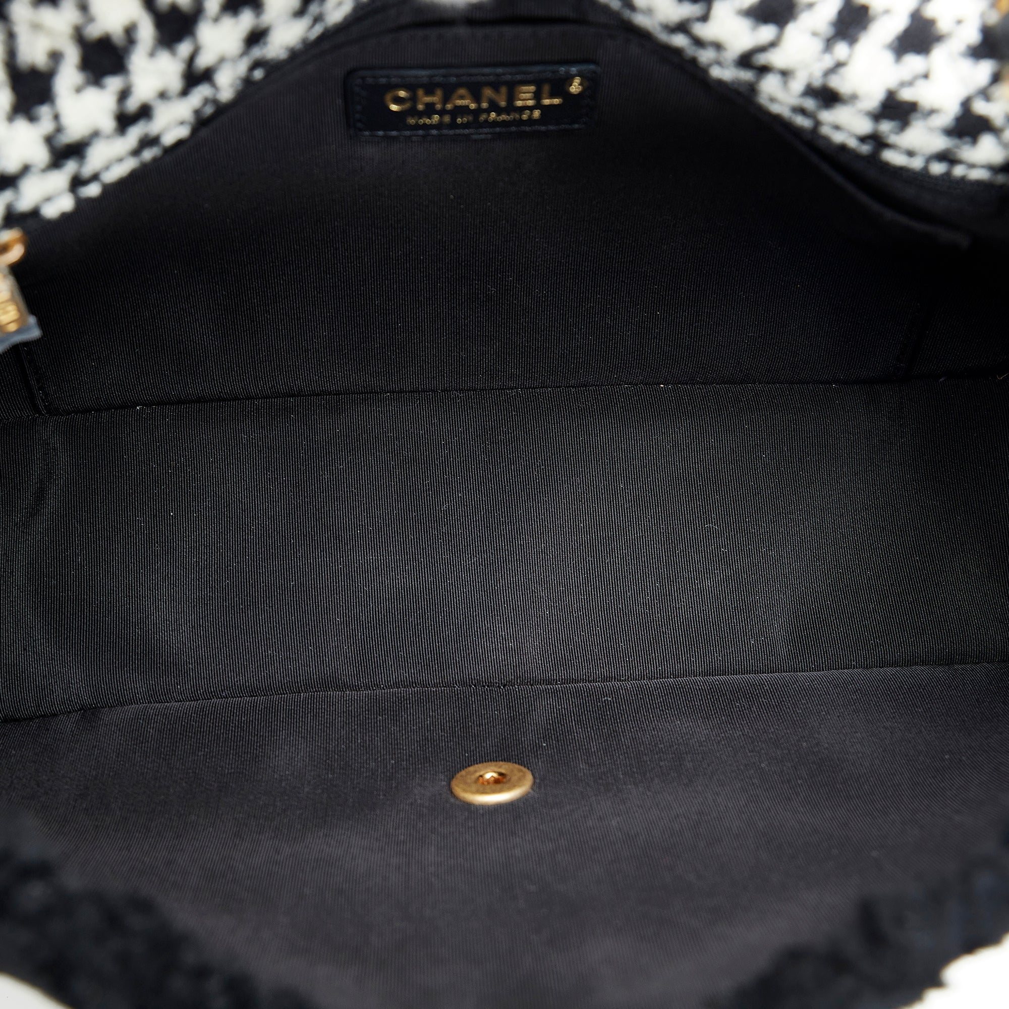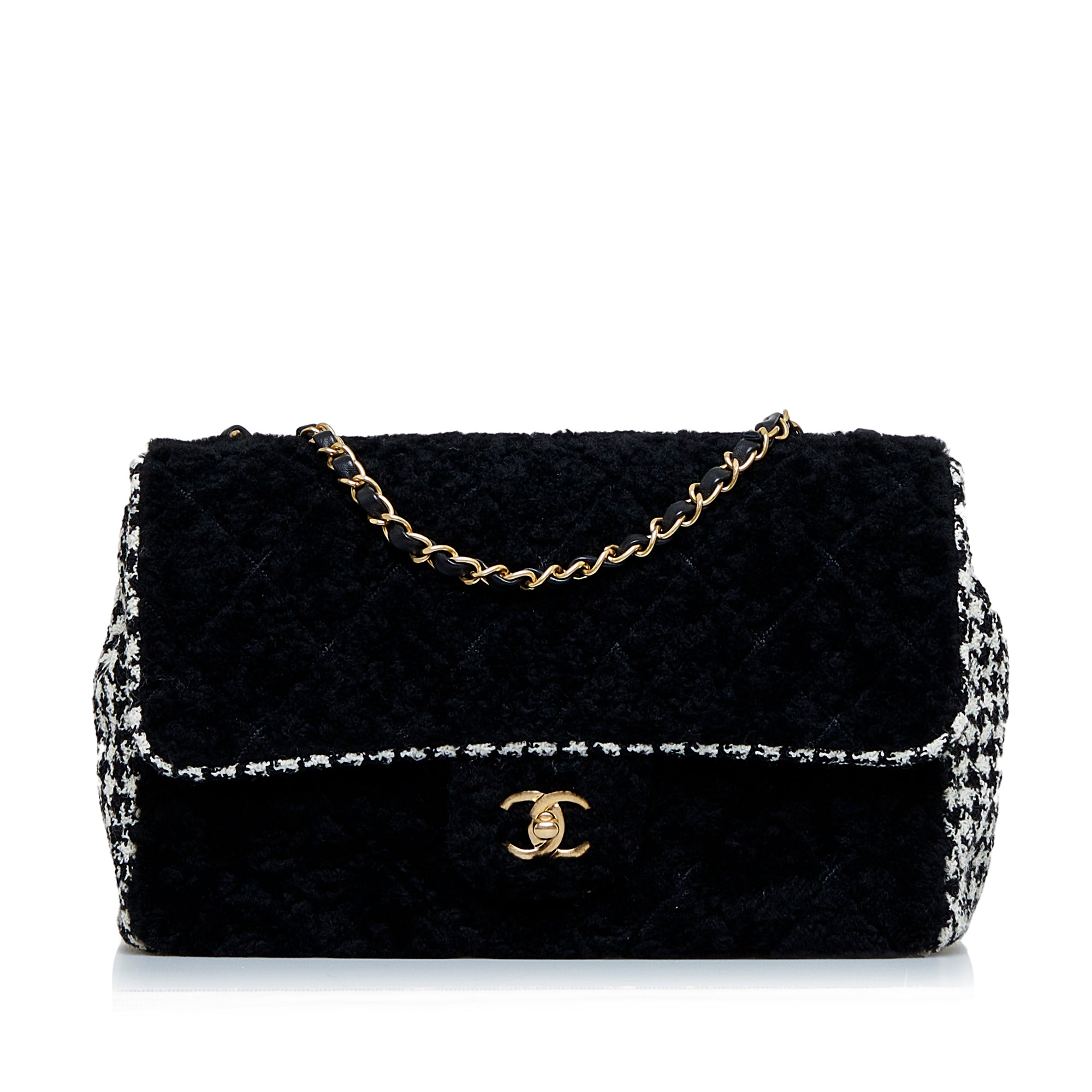 This flap bag features a shearling body with tweed, a leather woven chain strap, a front flap with CC turnlock closure, and an interior zip pocket. Inclusion: authenticity card. Retail Price: 8450.00