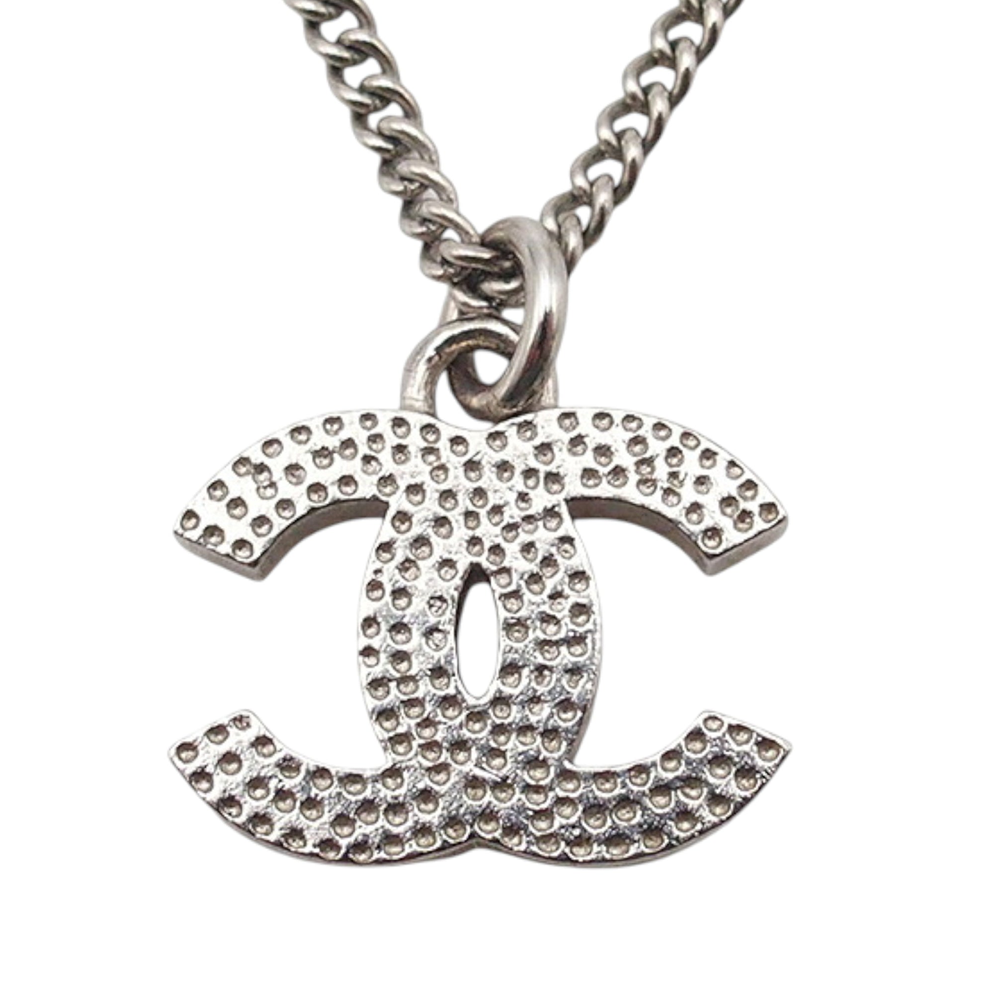 This necklace features a silver-tone chain, a CC pendant with rhinestone details, and a lobster clasp closure. Motif size: 1.3 cm x 1.4 cm. Retail Price: 850.00