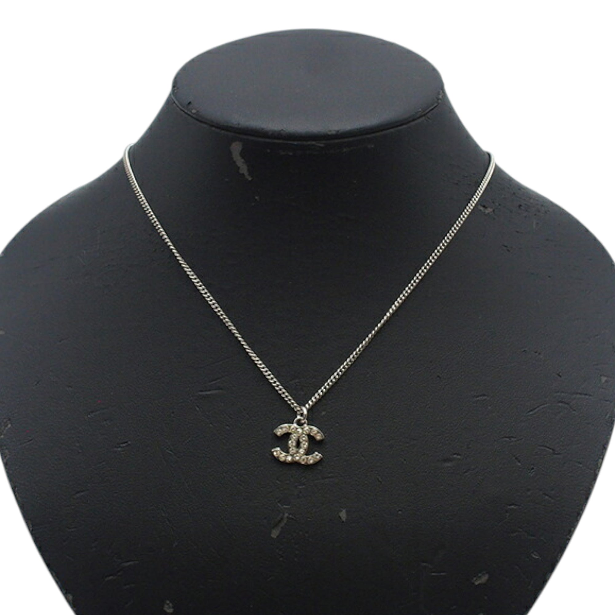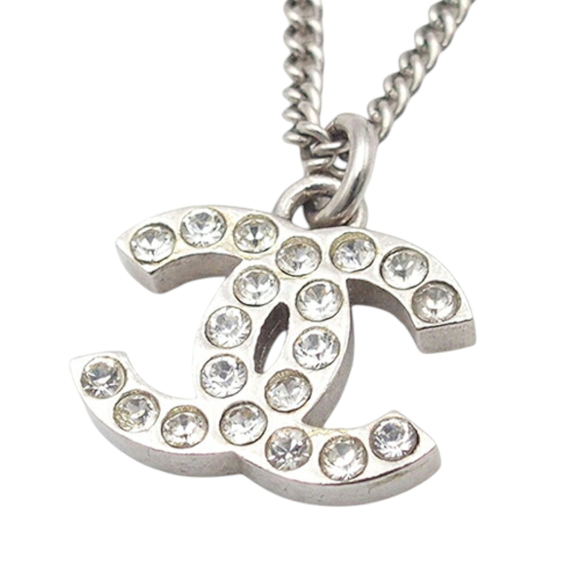 Chanel Silver Plated CC Rhinestone Pendant Necklace
