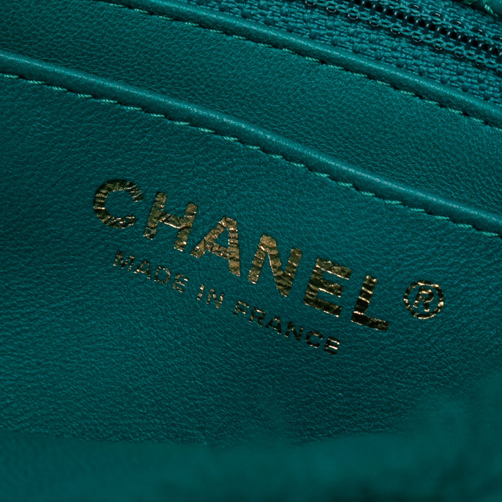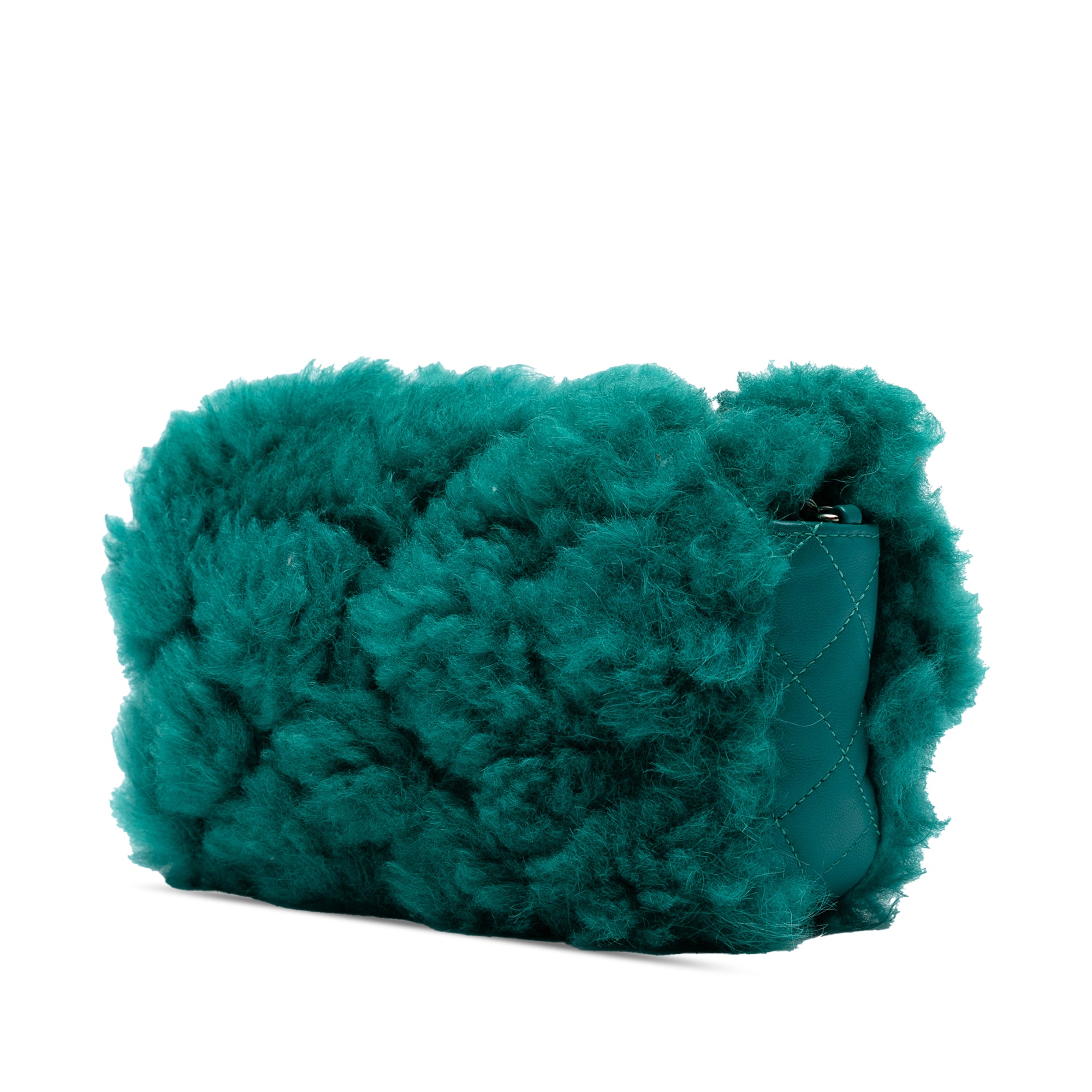 This flap bag features a shearling body with lambskin leather trim, a leather-woven chain strap, a front flap with CC turn lock closure, and interior zip and slip pockets. Retail Price: 4700.00