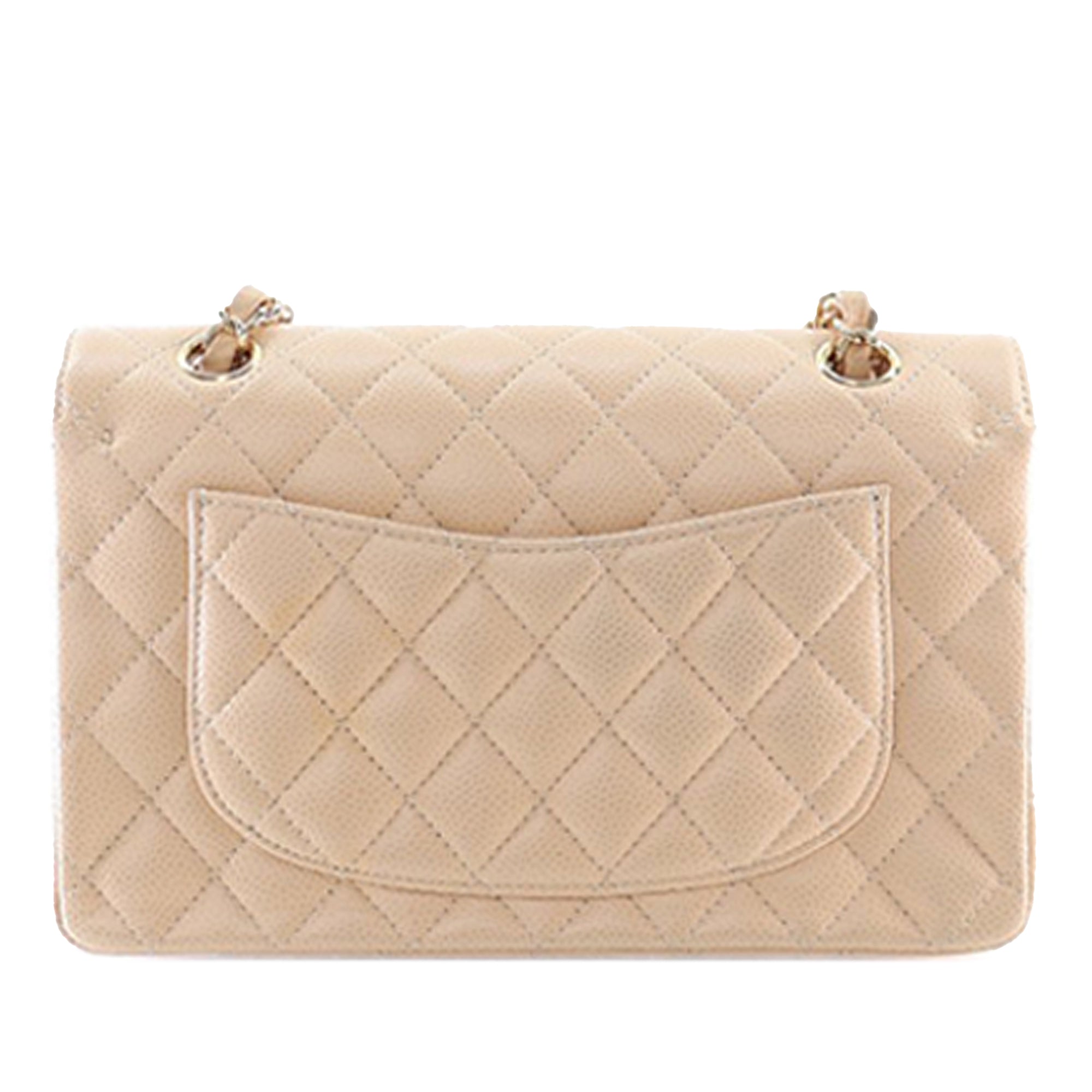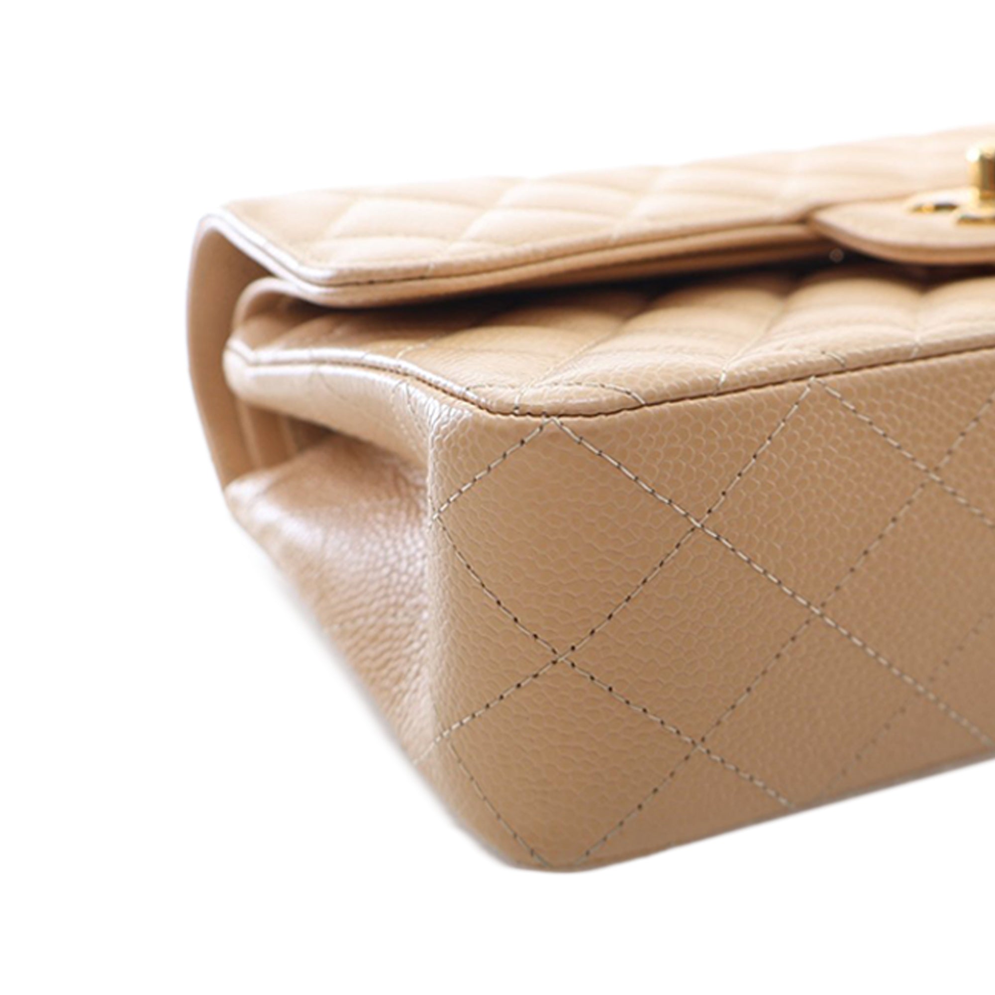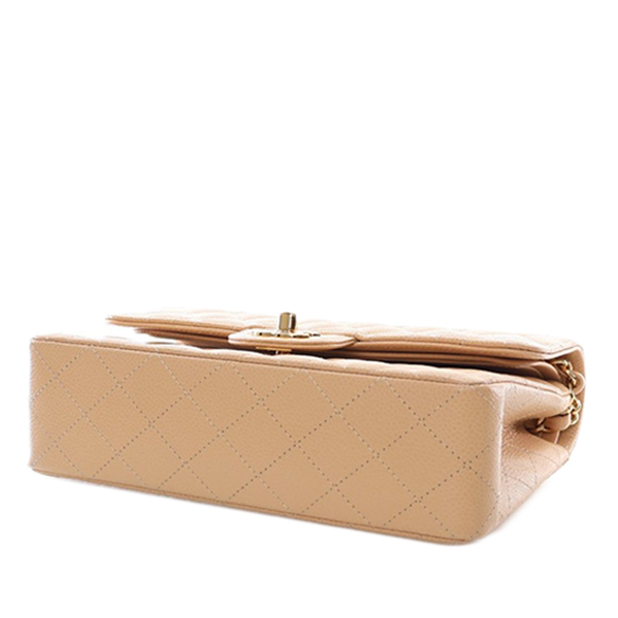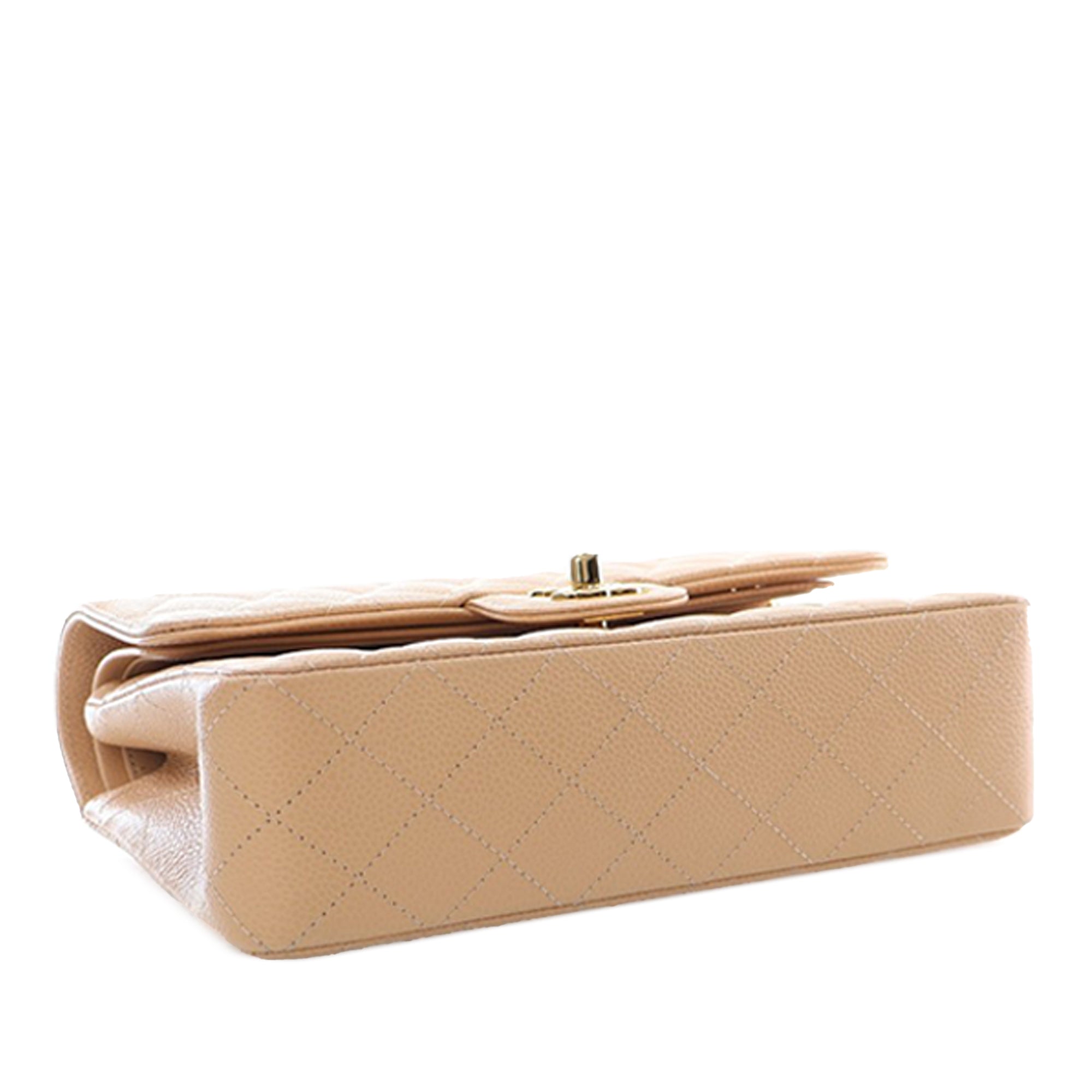 The Classic Flap bag features a quilted caviar leather body, leather woven chain straps, a double top flap with CC turn lock closure, an exterior back slip pocket, and interior zip and slip pockets. Inclusion: Dust bag, box. Retail Price: 11500.00