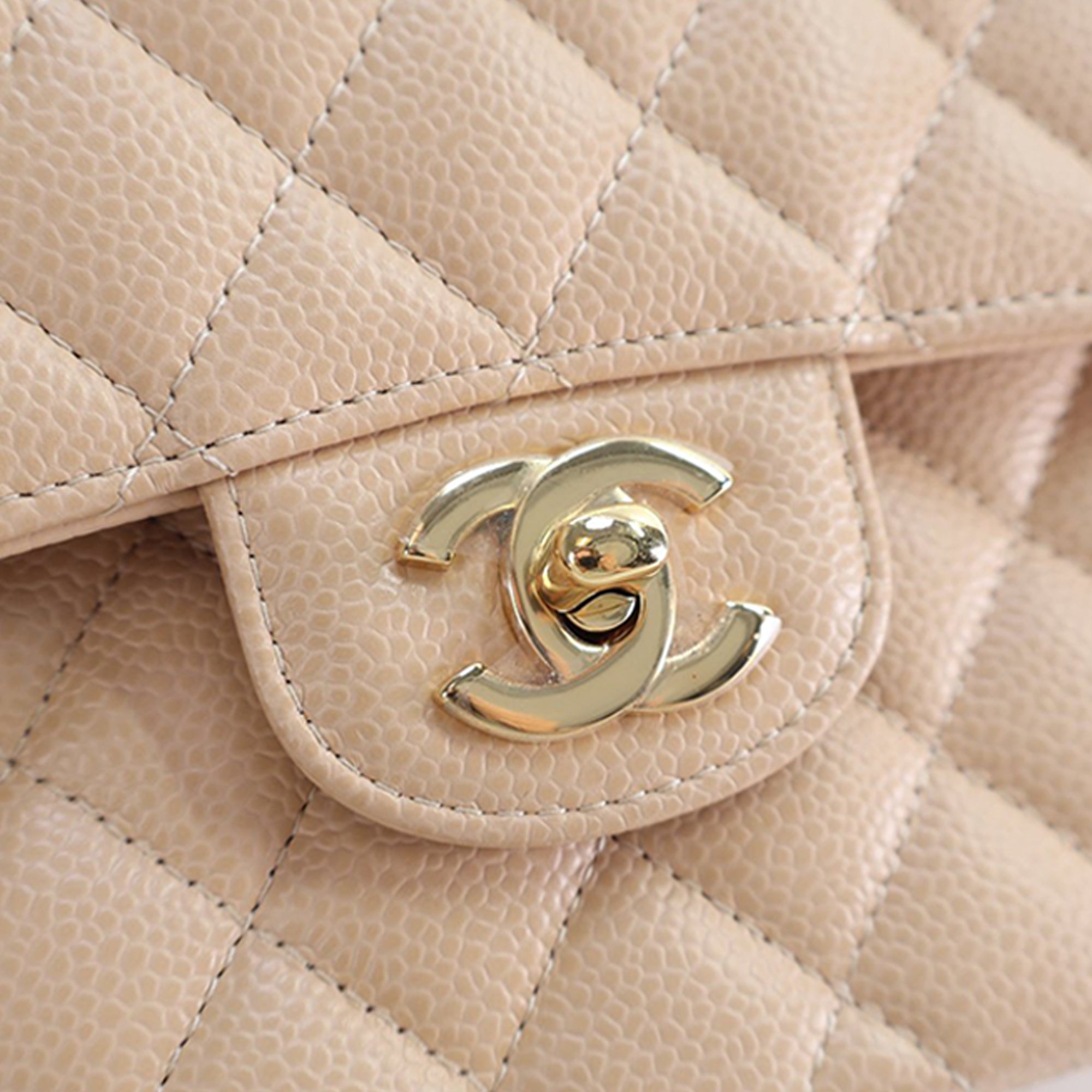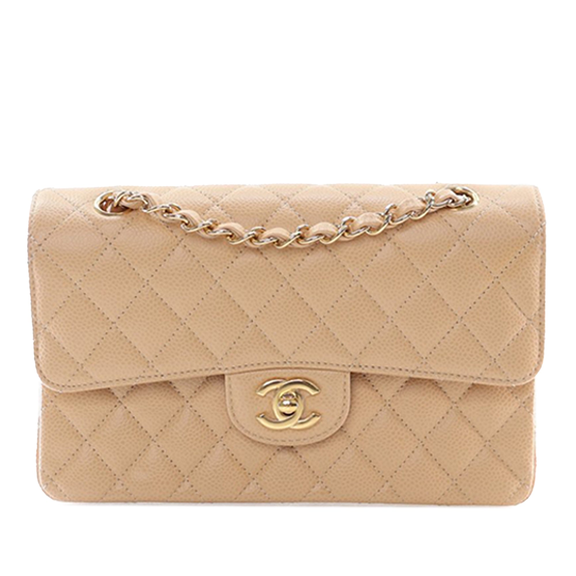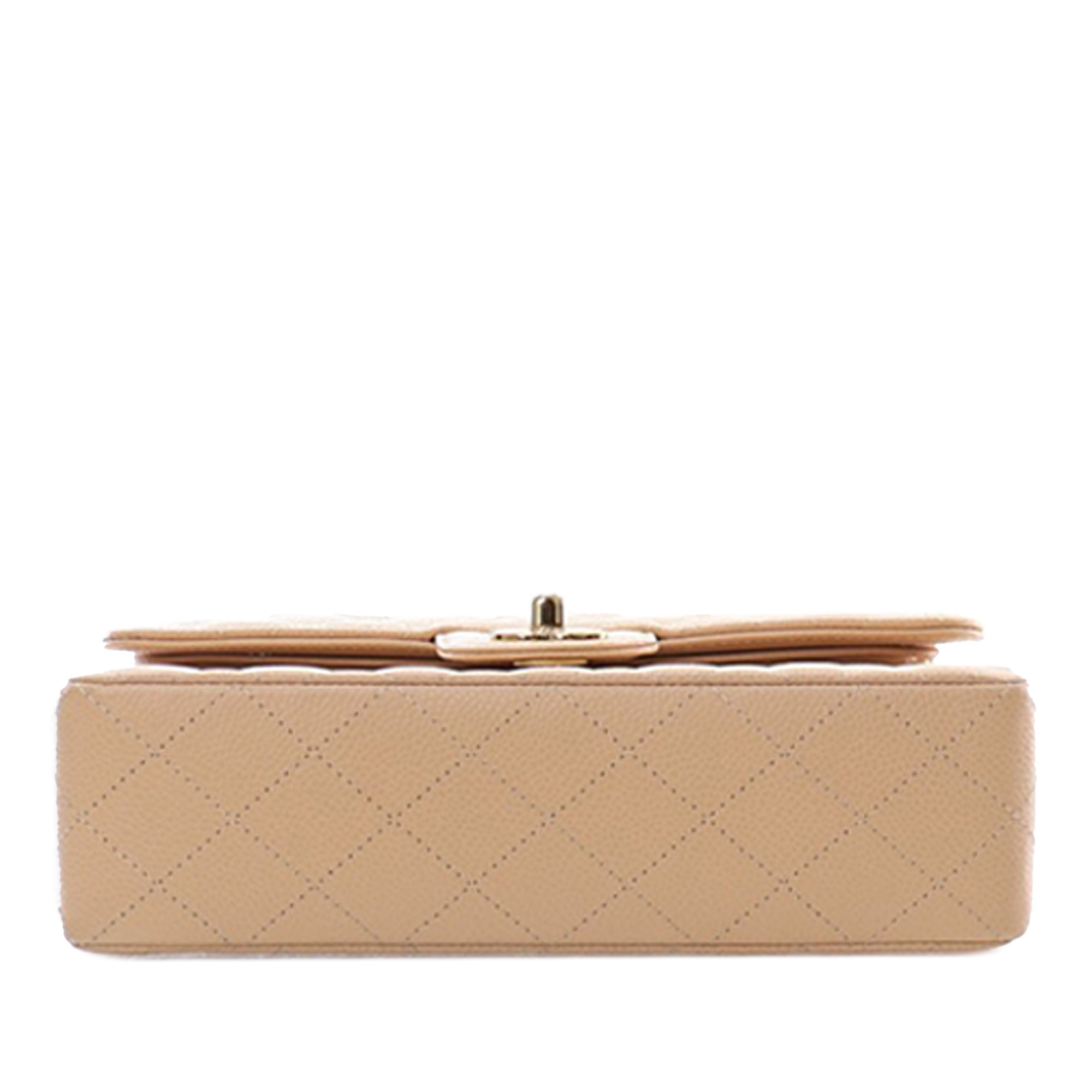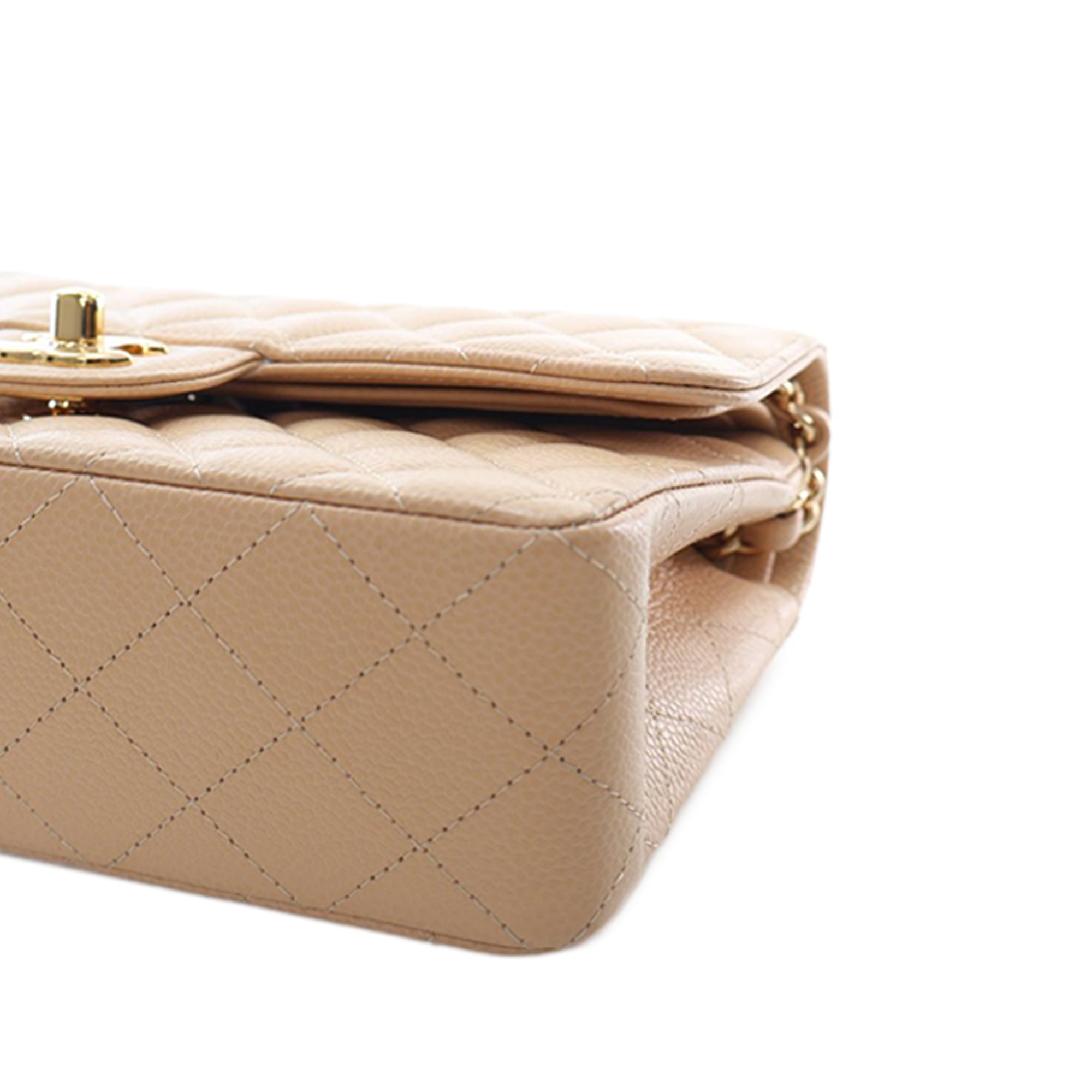 The Classic Flap bag features a quilted caviar leather body, leather woven chain straps, a double top flap with CC turn lock closure, an exterior back slip pocket, and interior zip and slip pockets. Inclusion: Dust bag, box. Retail Price: 11500.00