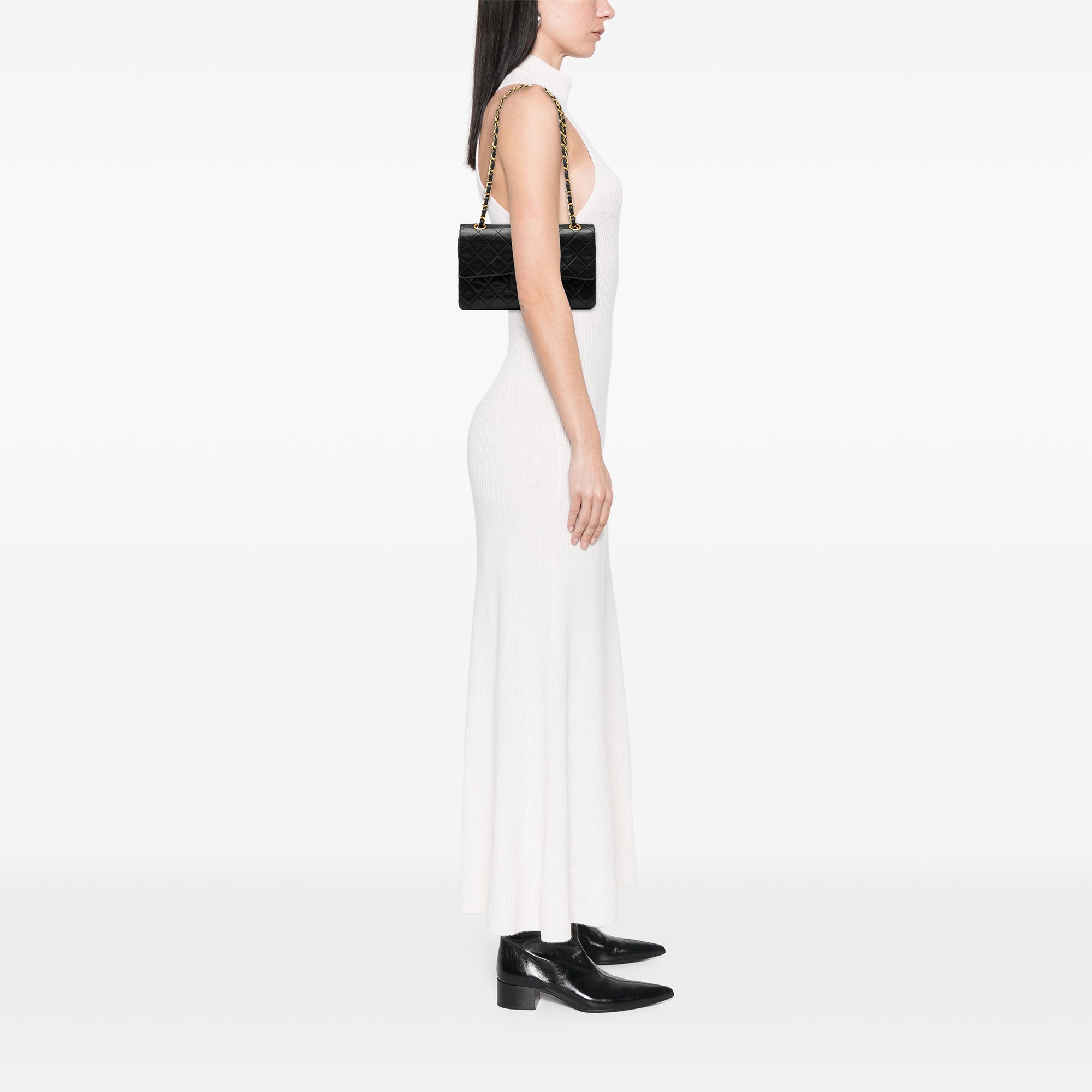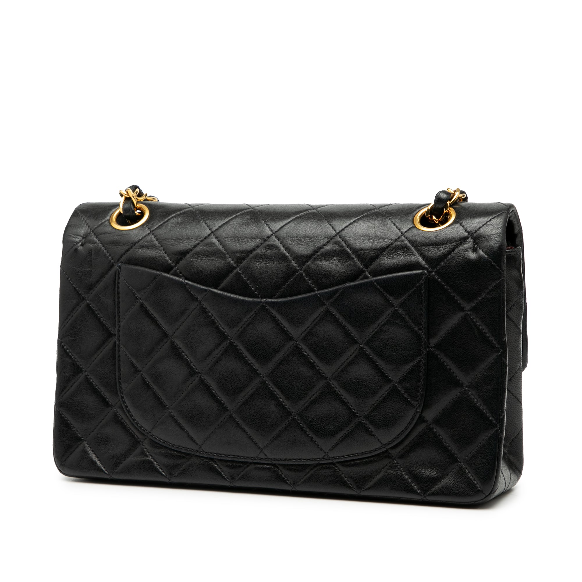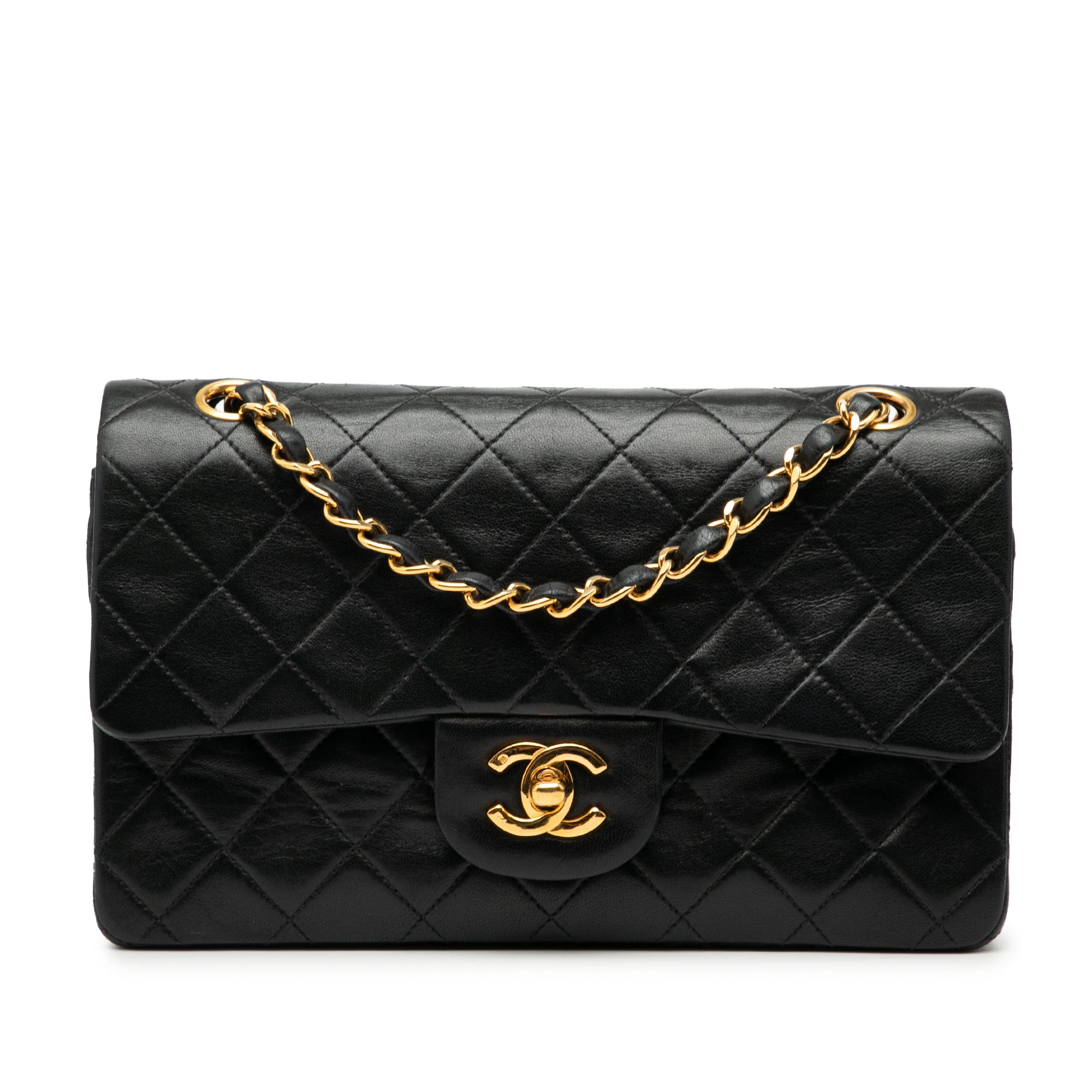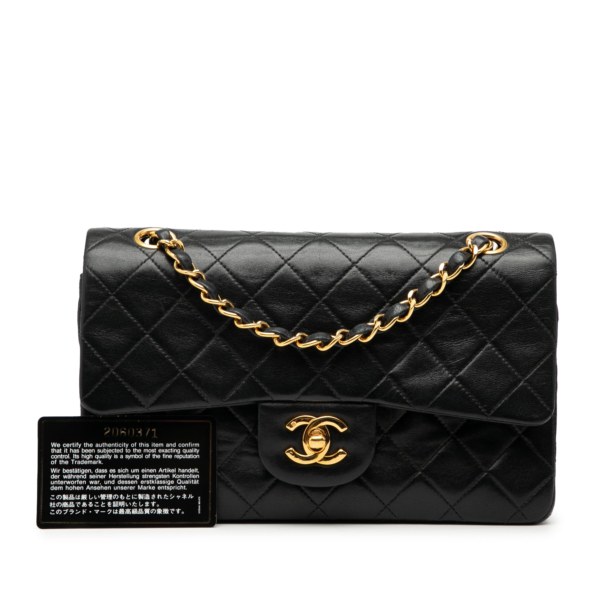 This shoulder bag features a quilted lambskin body, leather woven chain shoulder straps, double front flaps with interlocking Cs and a twist lock closure, an exterior back slip pocket, and interior zip and slip pockets. Inclusion: authenticity card. Retail Price: 10400.00