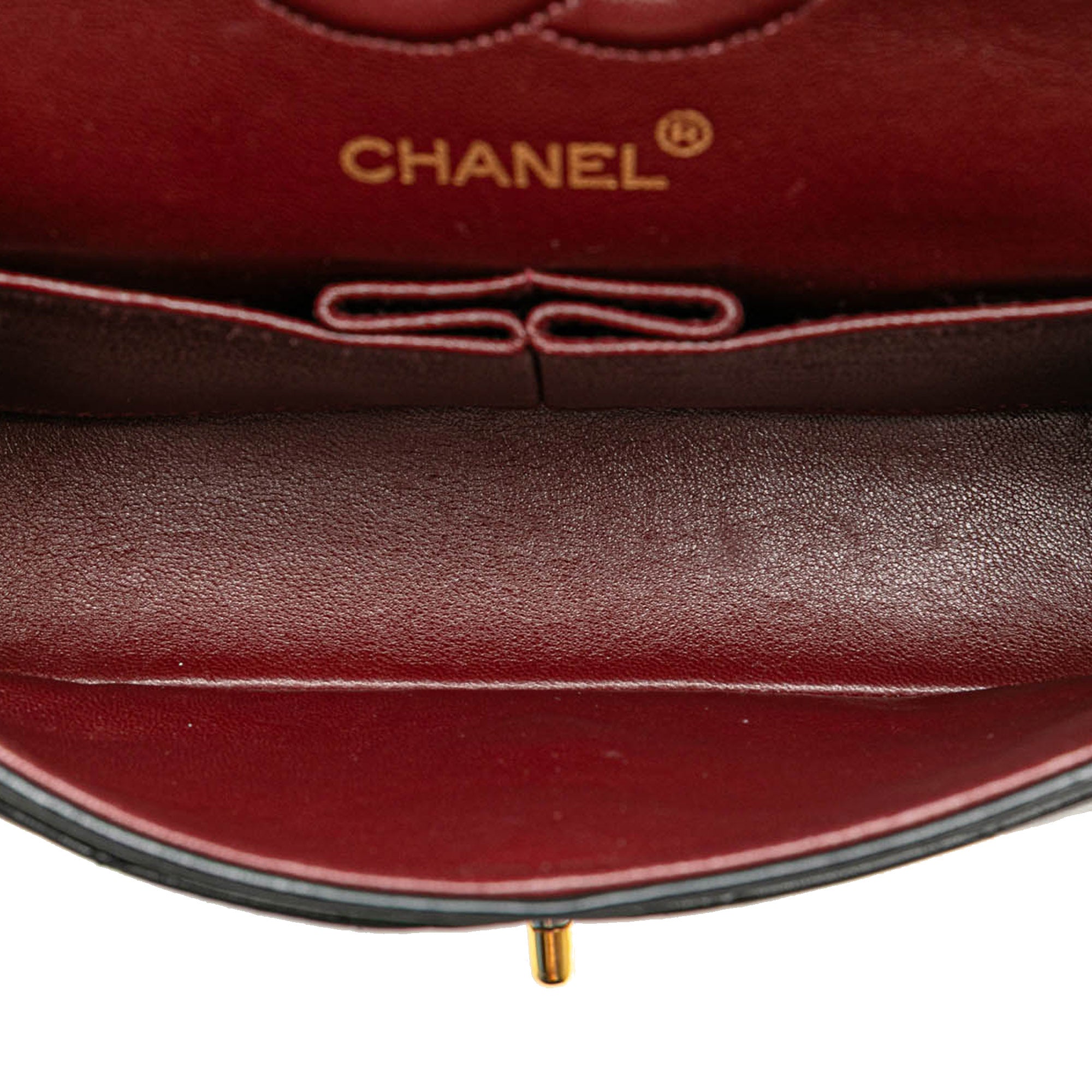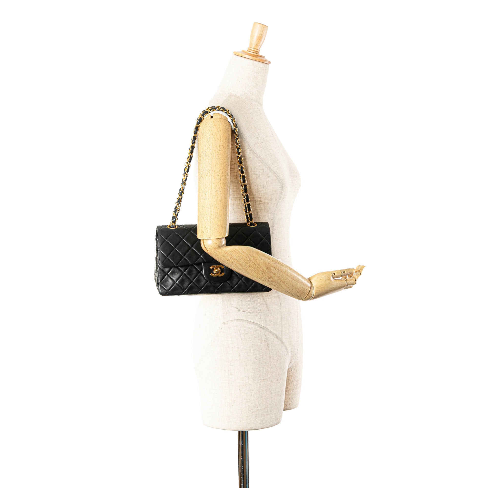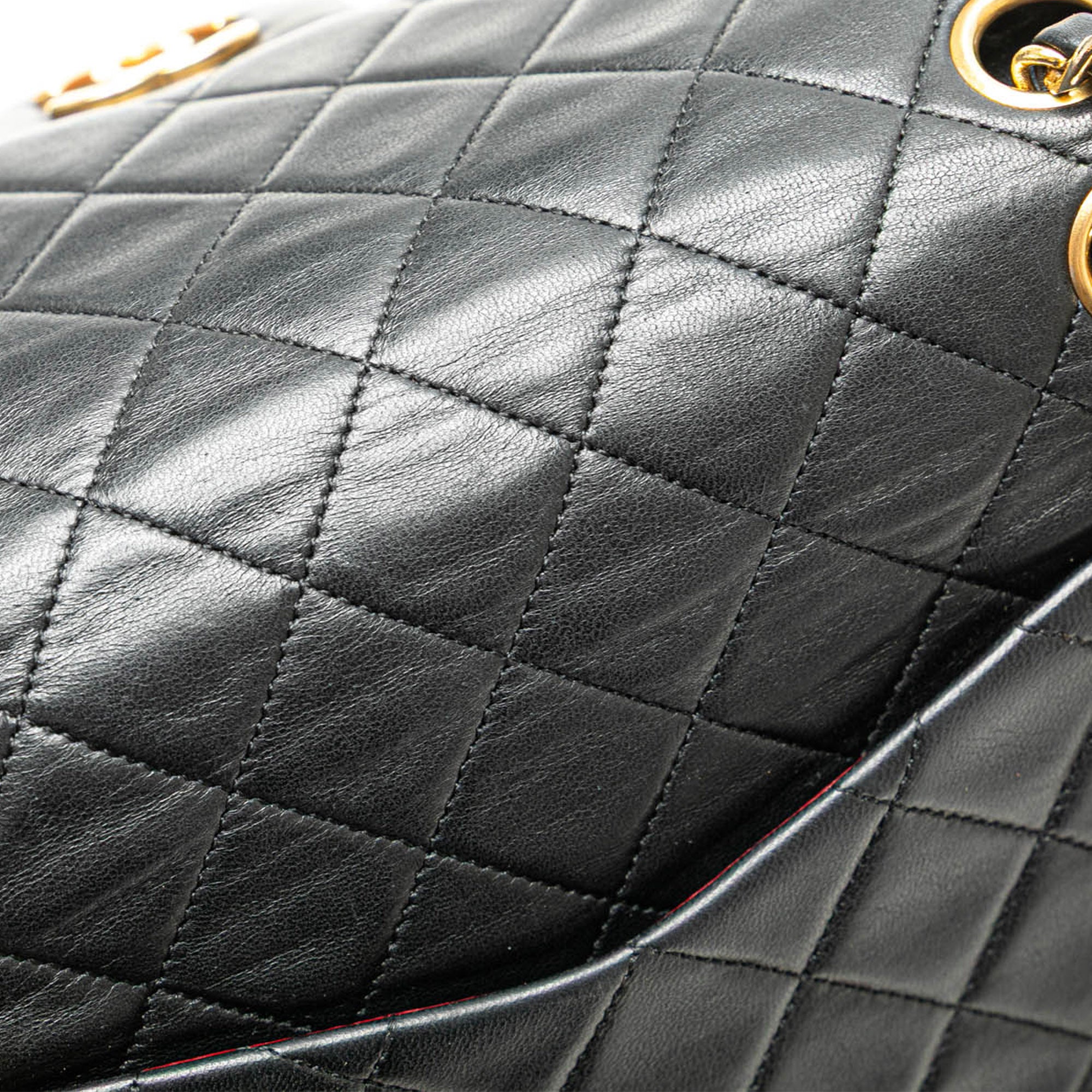 This shoulder bag features a quilted lambskin body, leather woven chain shoulder straps, double front flaps with interlocking Cs and a twist lock closure, an exterior back slip pocket, and interior slip pockets. Retail Price: 10400.00