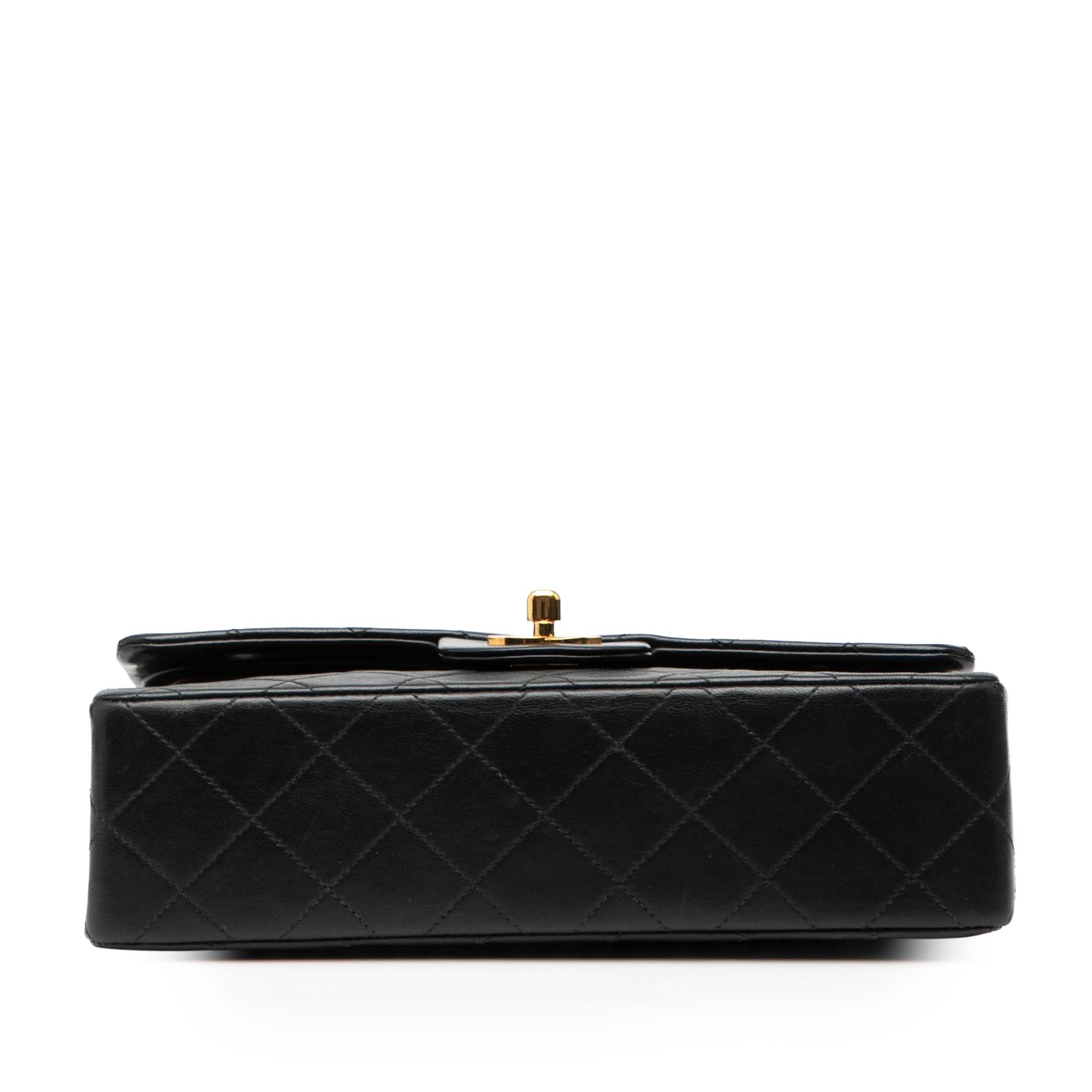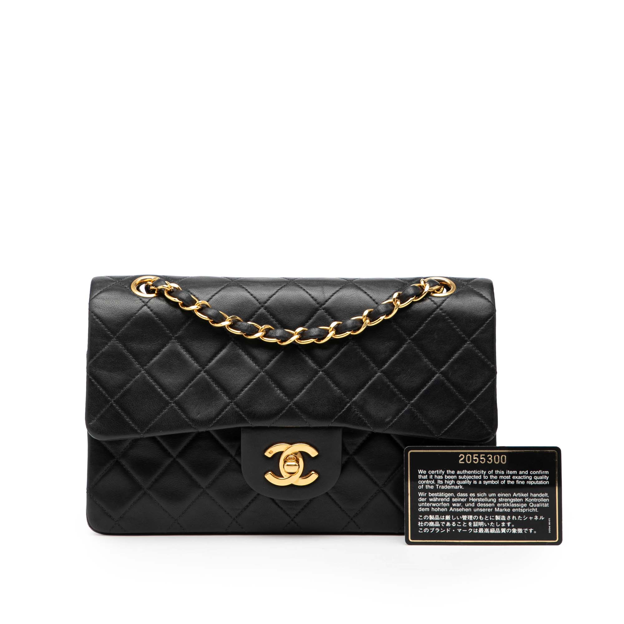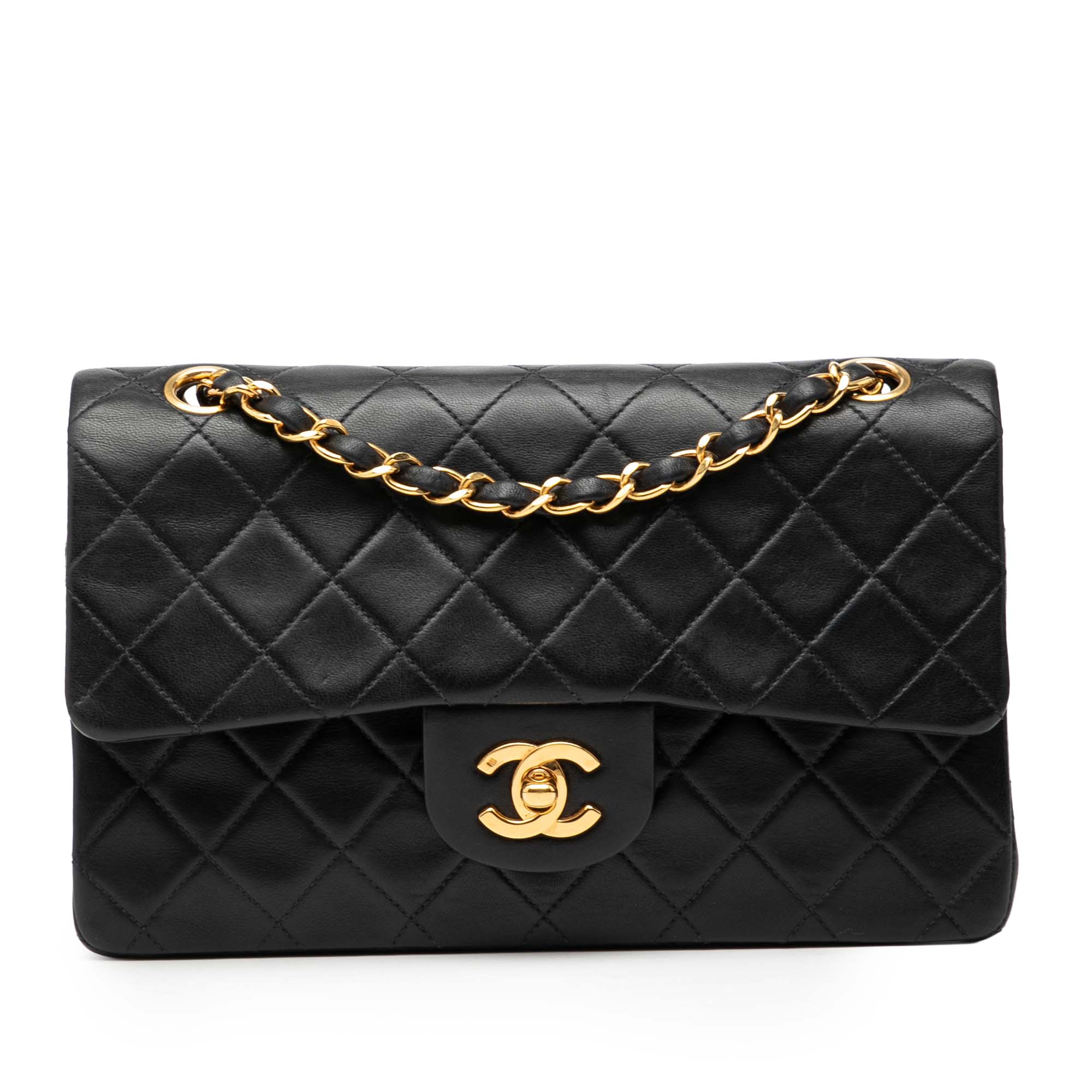 The Classic Double Flap features a quilted lambskin leather body, leather woven chain shoulder straps, double front flaps with interlocking Cs and a twist-lock closure, an exterior back slip pocket, and interior zip and slip pockets. Inclusion: authenticity card. Retail Price: 10400.00
