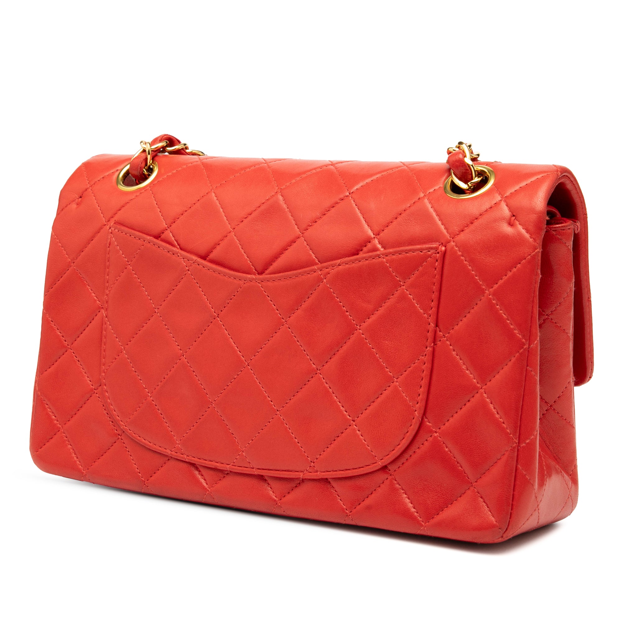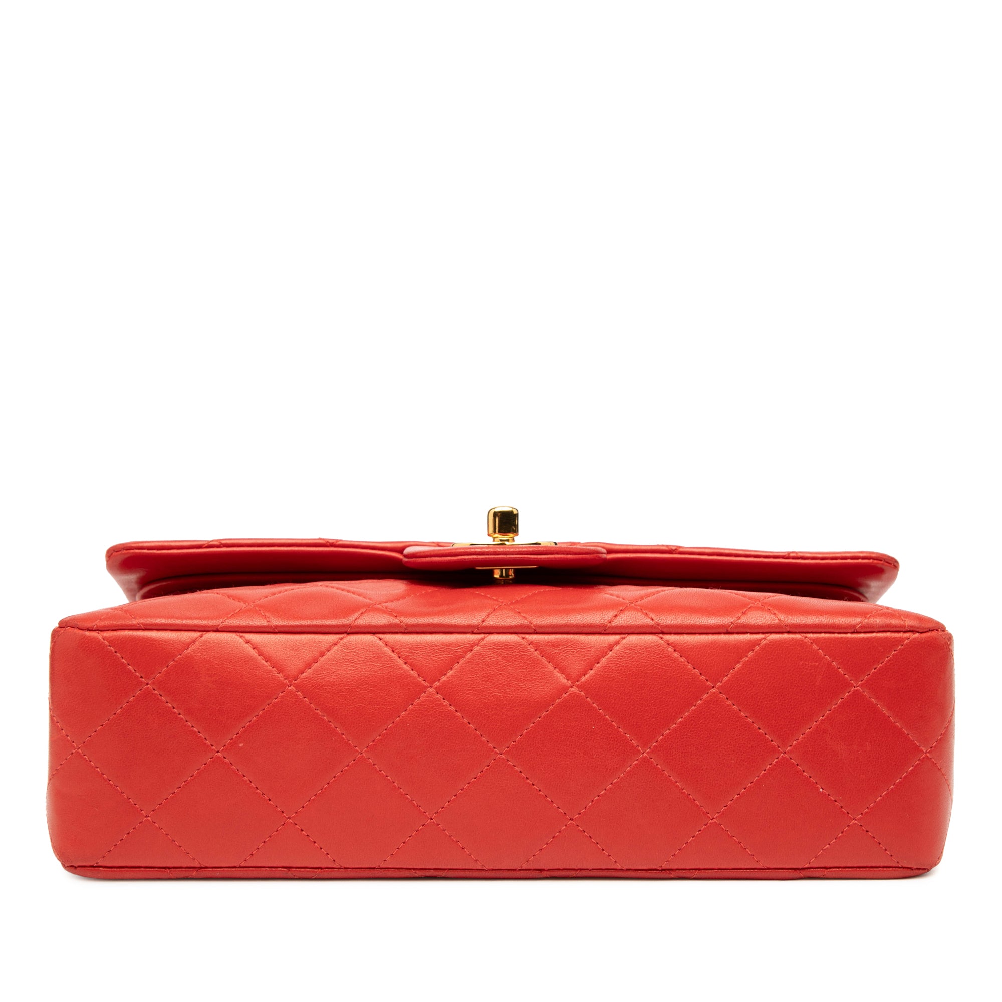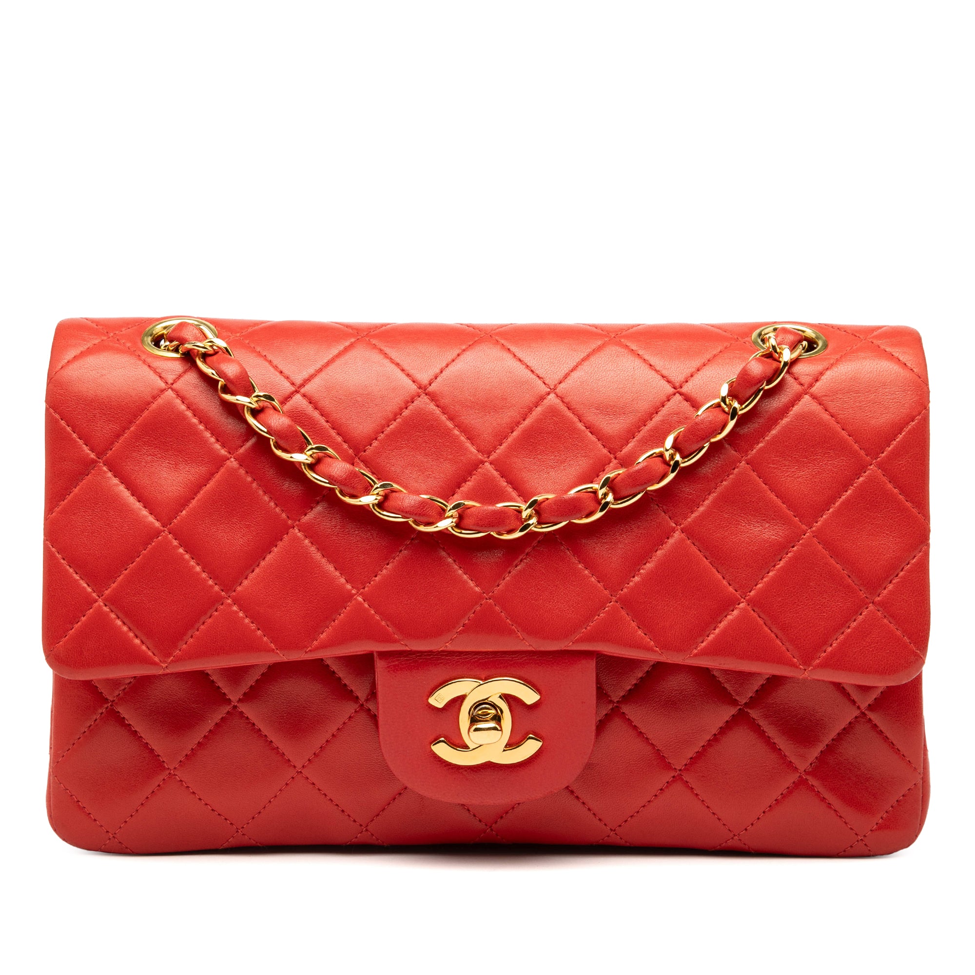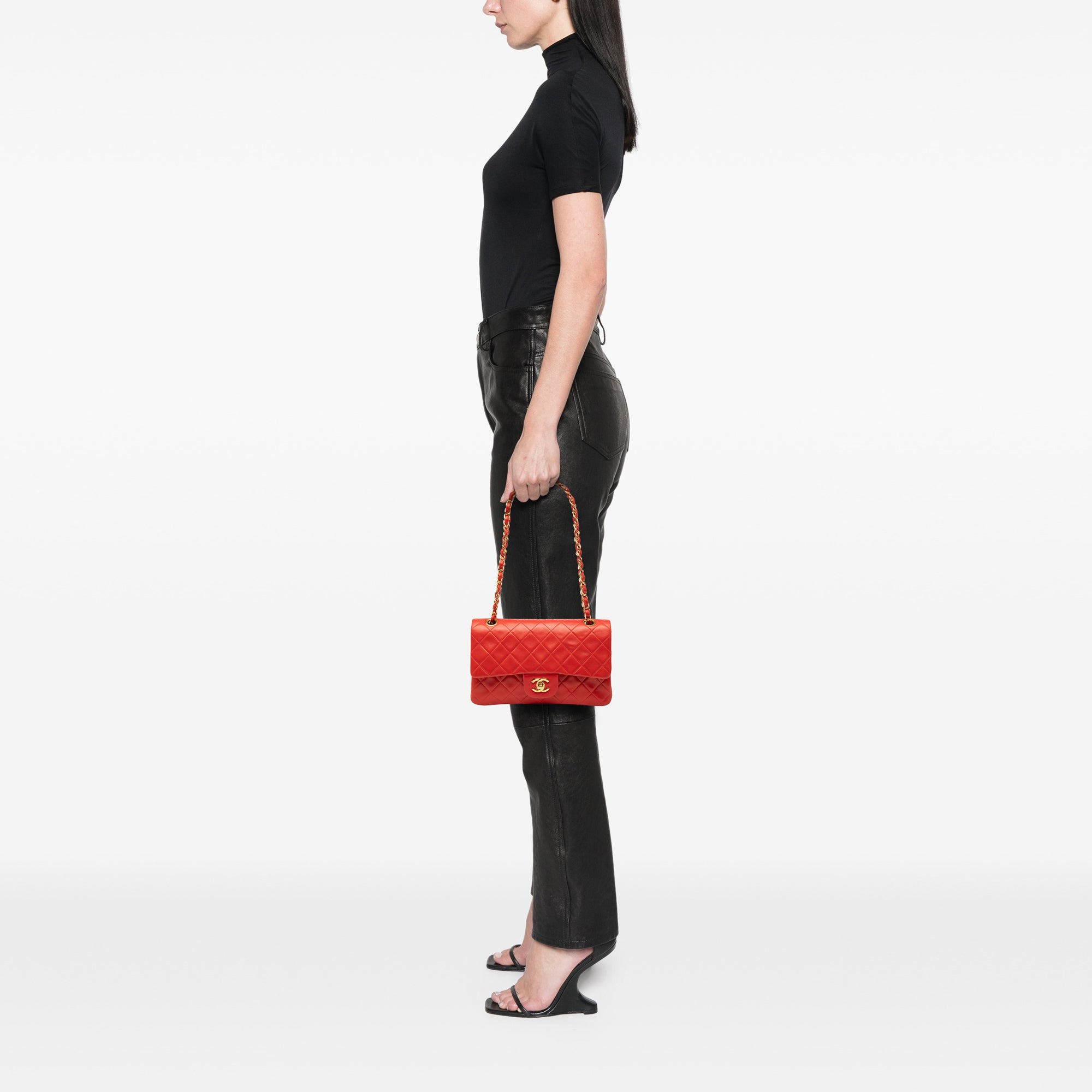 This shoulder bag features a quilted lambskin body, a gold-tone leather woven chain link straps, double front flaps with interlocking Cs and a twist lock closure, an exterior back slip pocket, and interior zip and slip pockets. Inclusion: Dust bag. Retail Price: 10500.00