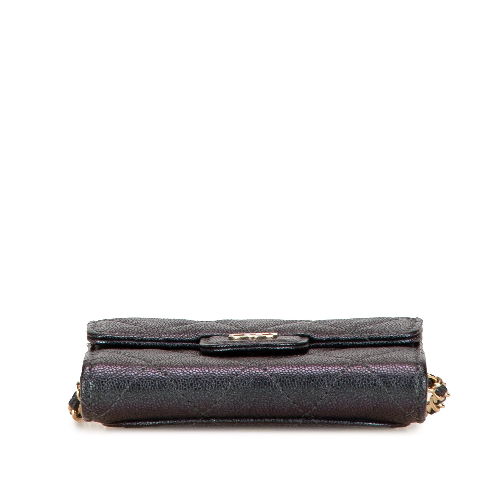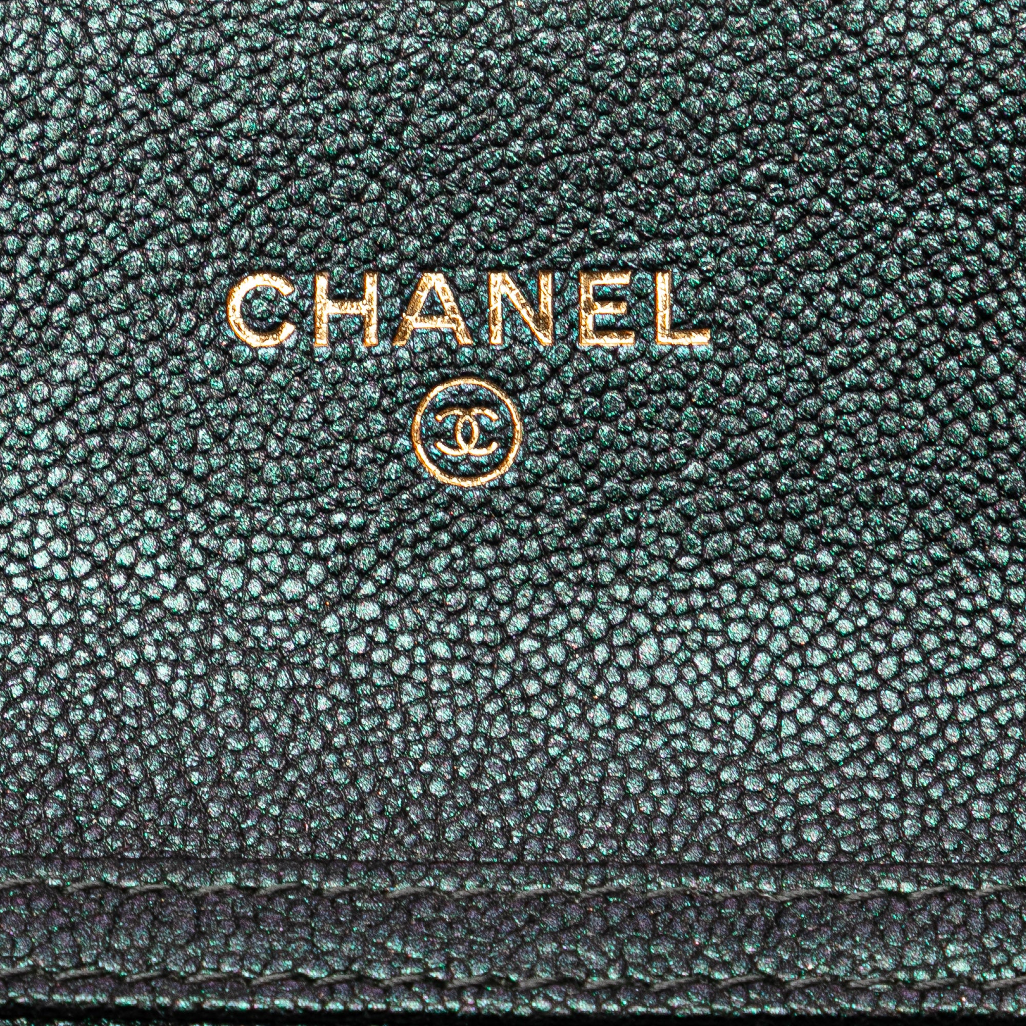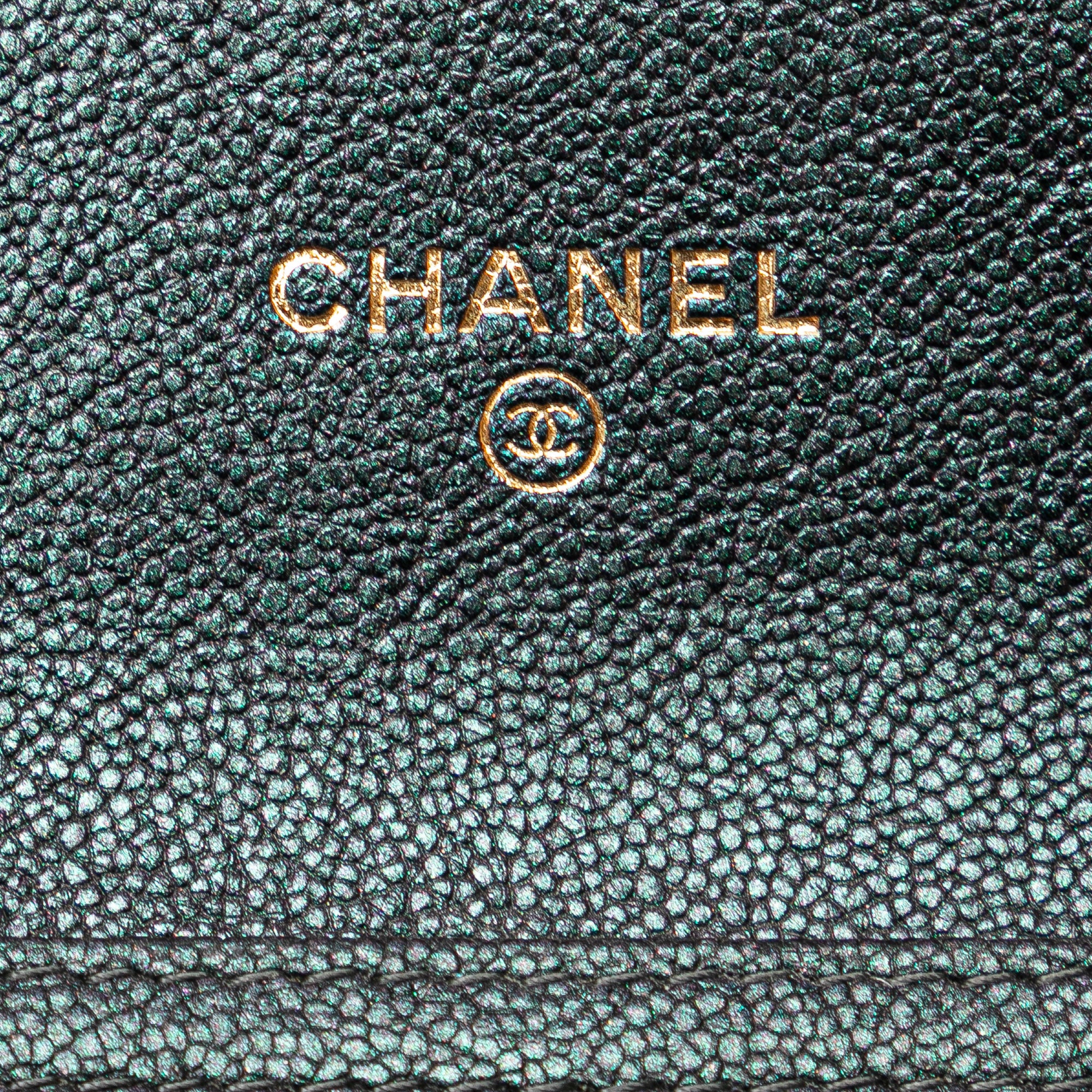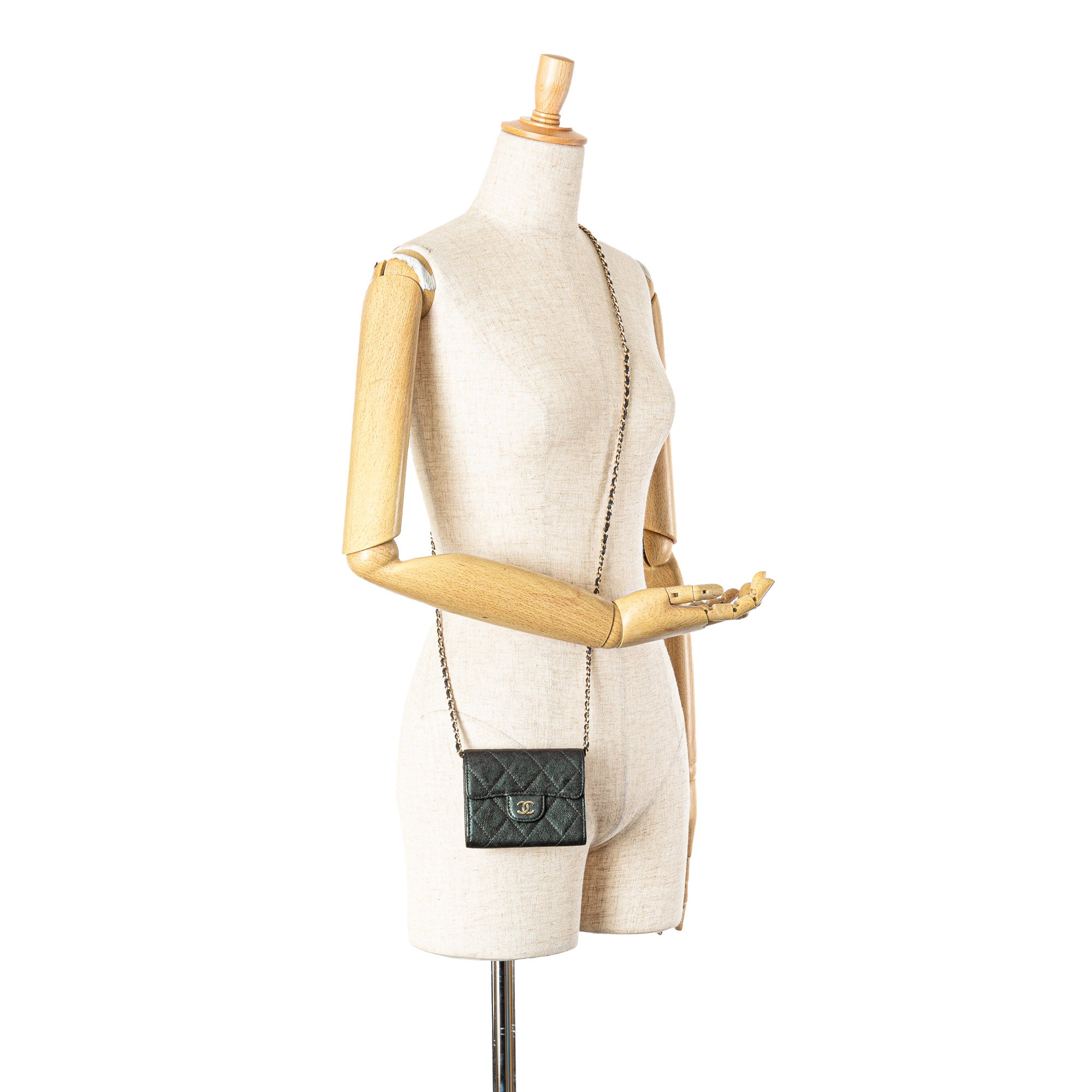 This shoulder bag features a quilted caviar leather body, leather woven chain straps, double top flaps with CC turn-lock closure, an exterior back slip pocket, and interior zip and slip pockets. Inclusion: Dust bag, authenticity card. Retail Price: 10400.00